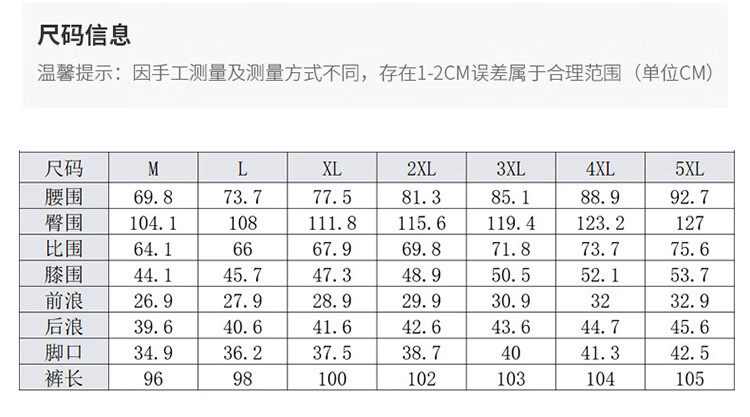 Outseam (cm) 99 cm 101.5 cm 104 cm 106.5 cm 109 cm