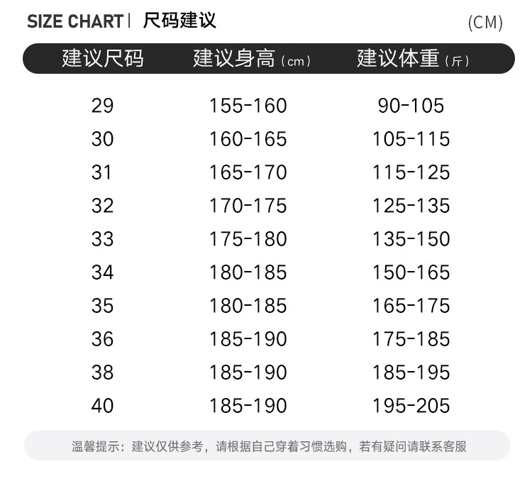 China (cm) 160-165/84-86 165-170 / 88-90 167-172 / 92-96 168-173 / 98-102 170-176 / 106-110
