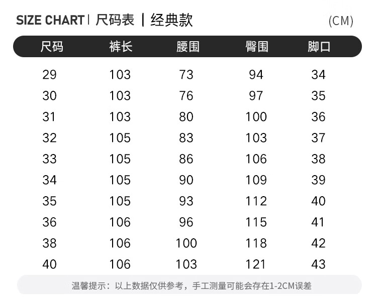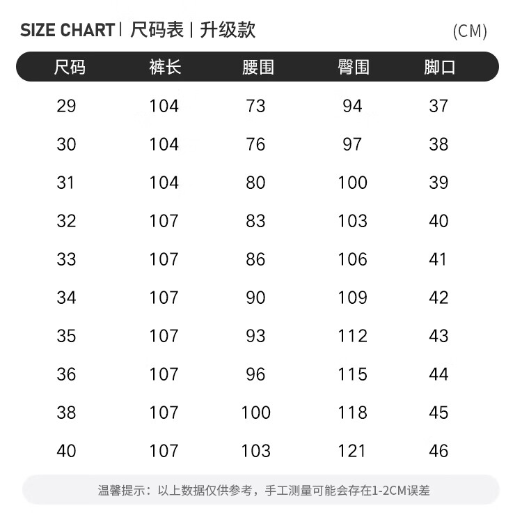 Outseam (cm) 99 cm 101.5 cm 104 cm 106.5 cm 109 cm