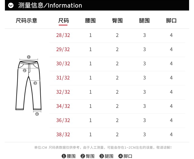 USA(inch) 28-30 30-32 32-34 34-38 38-42