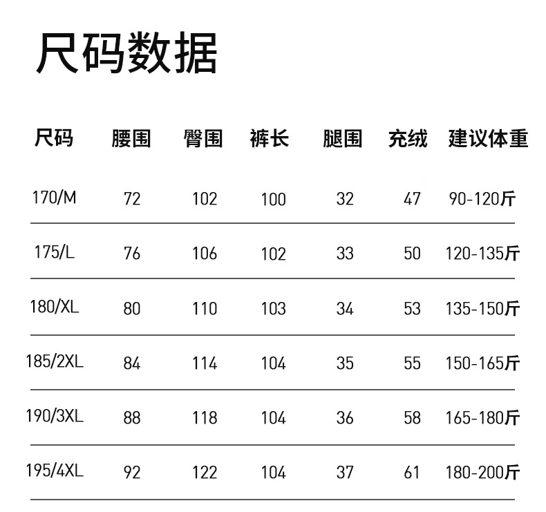 China (cm) 165 / 88-90 170 / 96-98 175 / 108-110 180 / 118-122 185 / 126-130