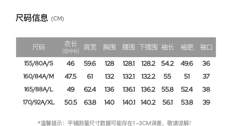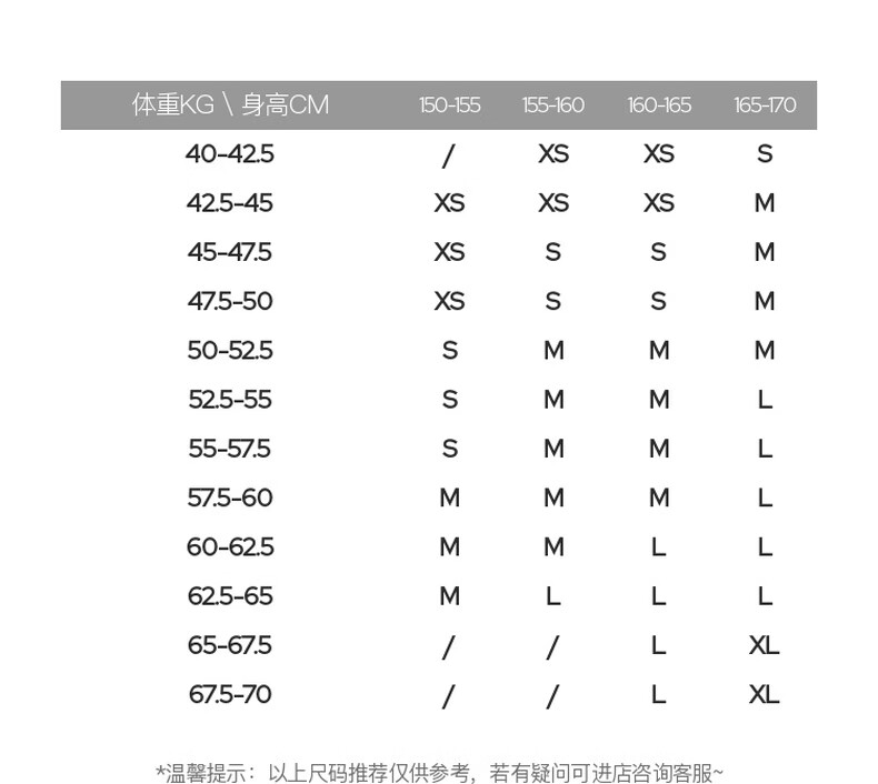 China (cm) 160-165/84-86 165-170 / 88-90 167-172 / 92-96 168-173 / 98-102 170-176 / 106-110