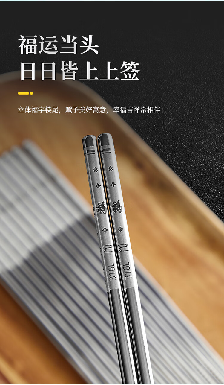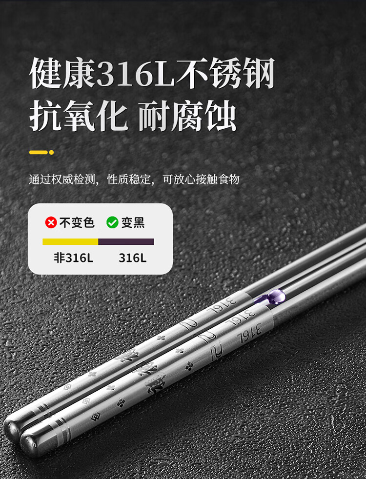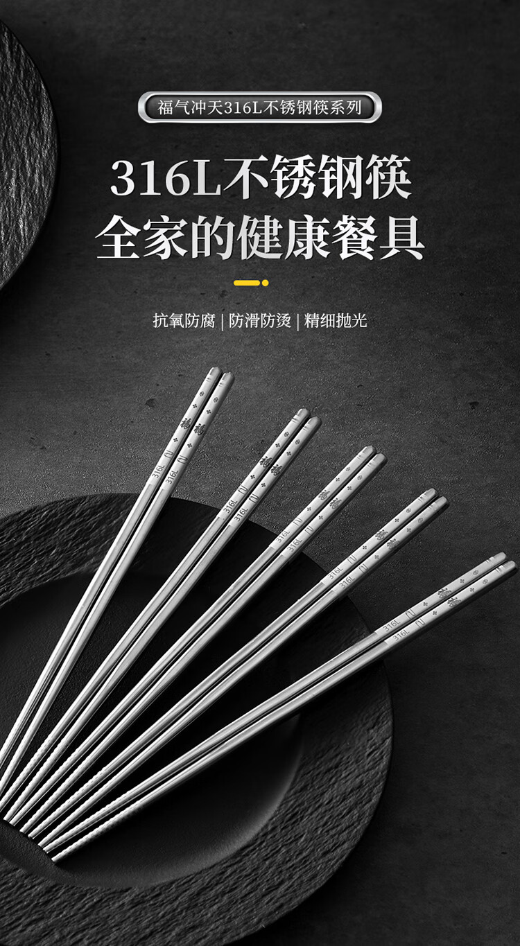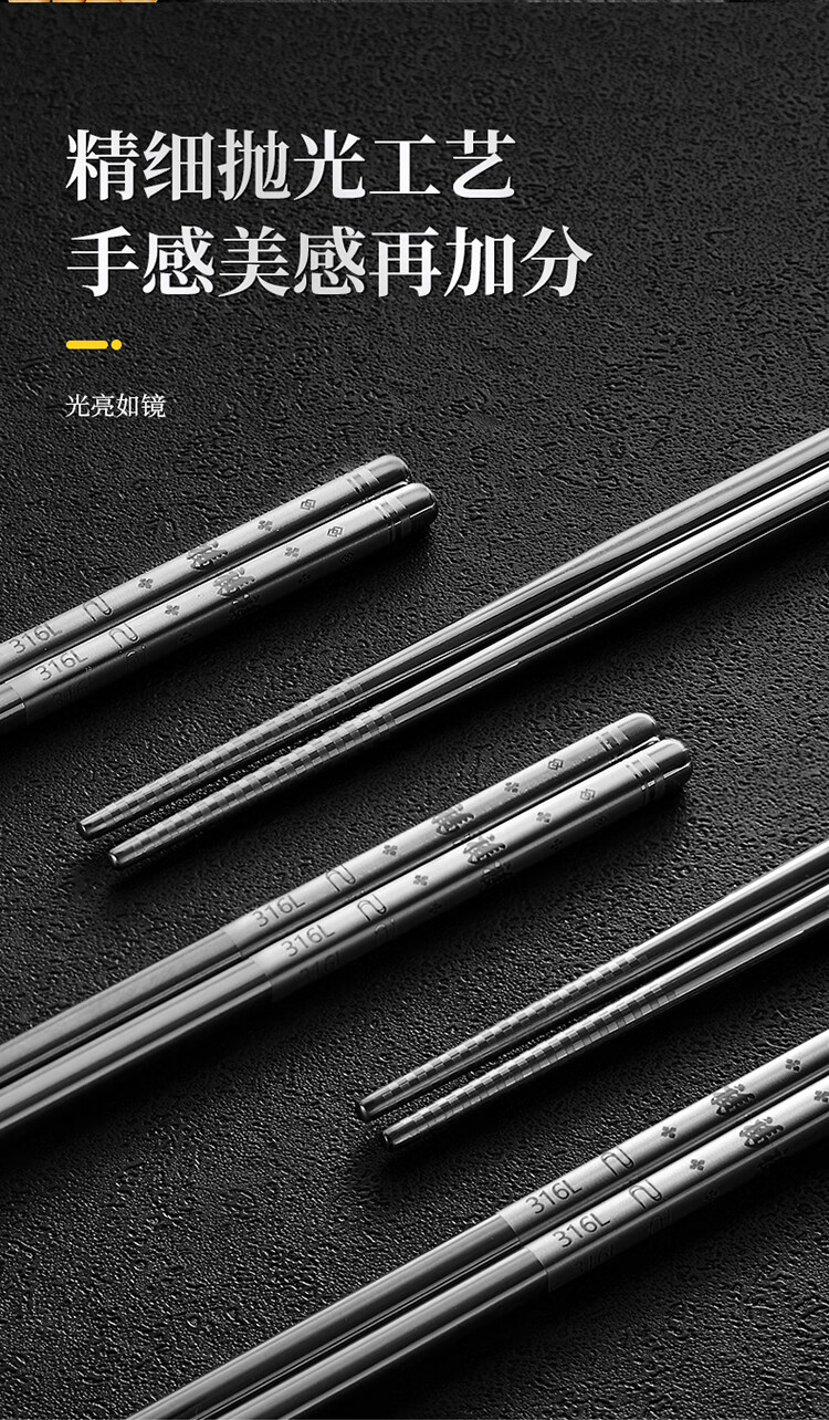 Cui Dahuang 316L stainless steel chopsticks for home use, high-end, mildew-proof, anti-bacterial and high-temperature resistant, 5 pairs of good fortune