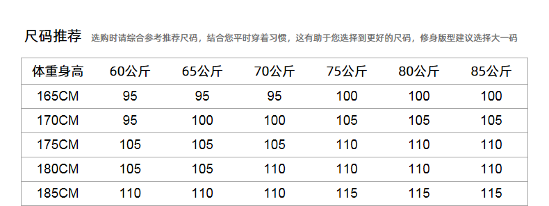 China (cm) 160-165/84-86 165-170 / 88-90 167-172 / 92-96 168-173 / 98-102 170-176 / 106-110