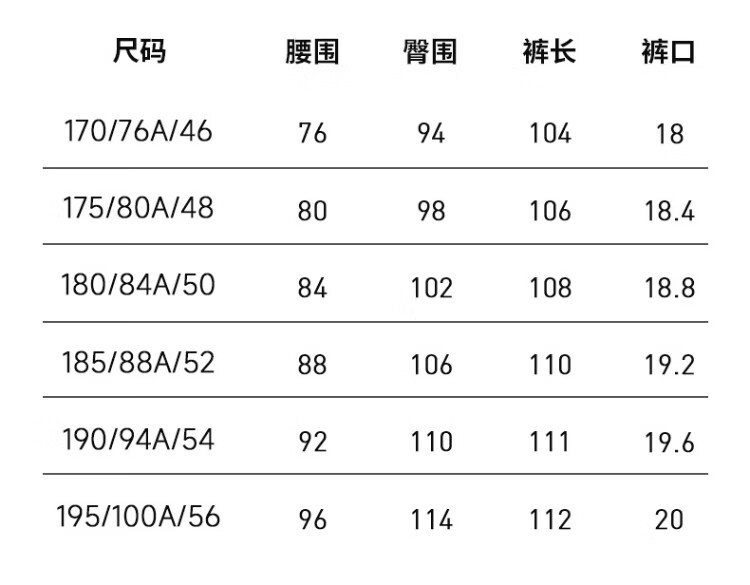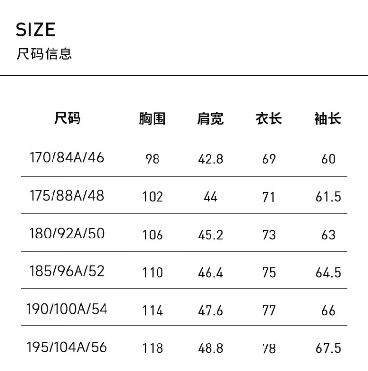 China (cm) 160-165/84-86 165-170 / 88-90 167-172 / 92-96 168-173 / 98-102 170-176 / 106-110