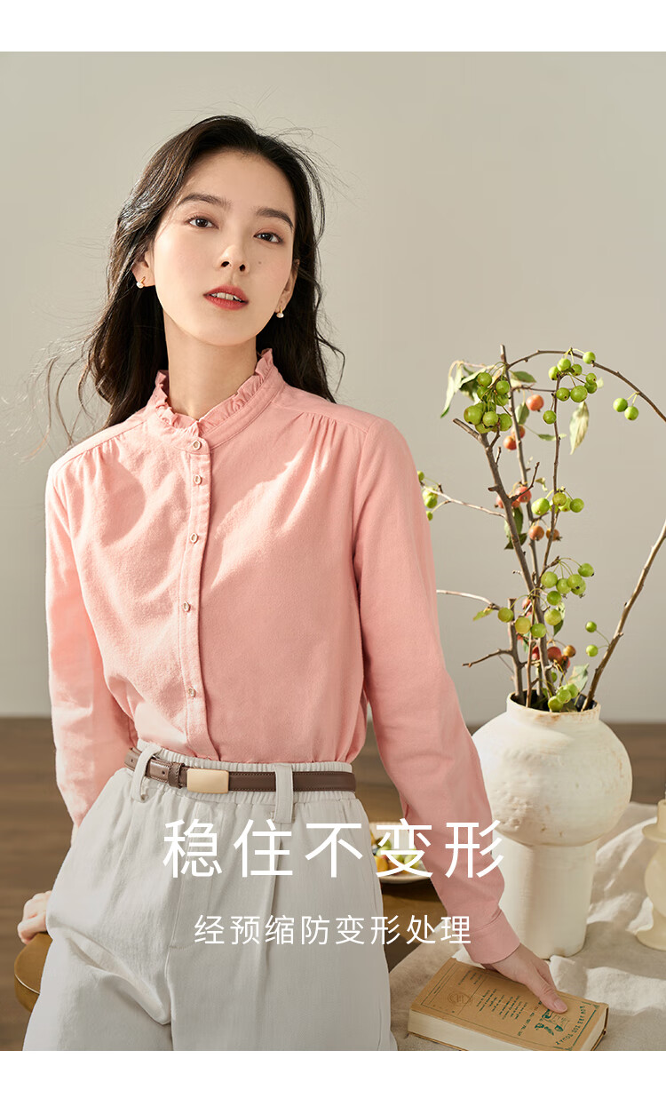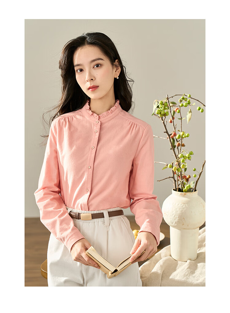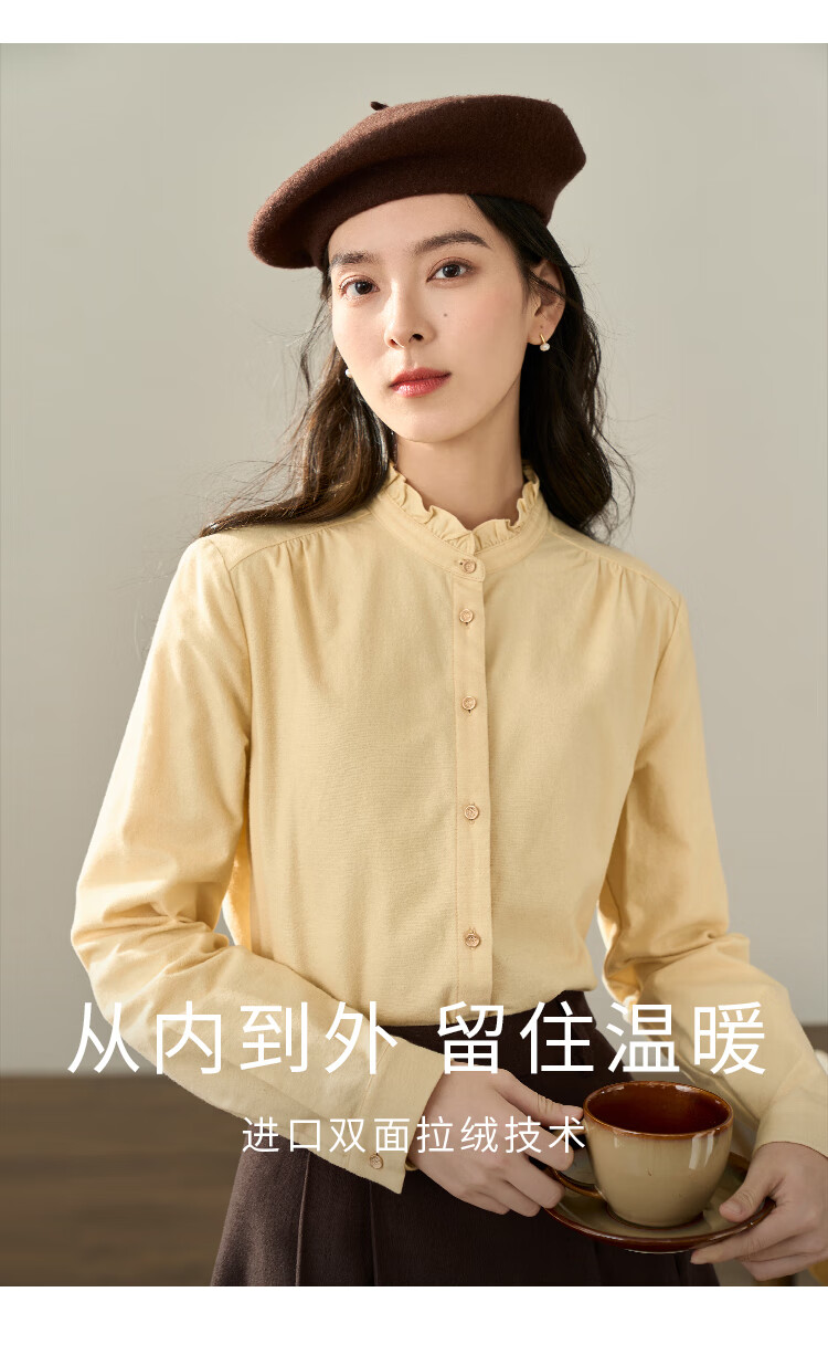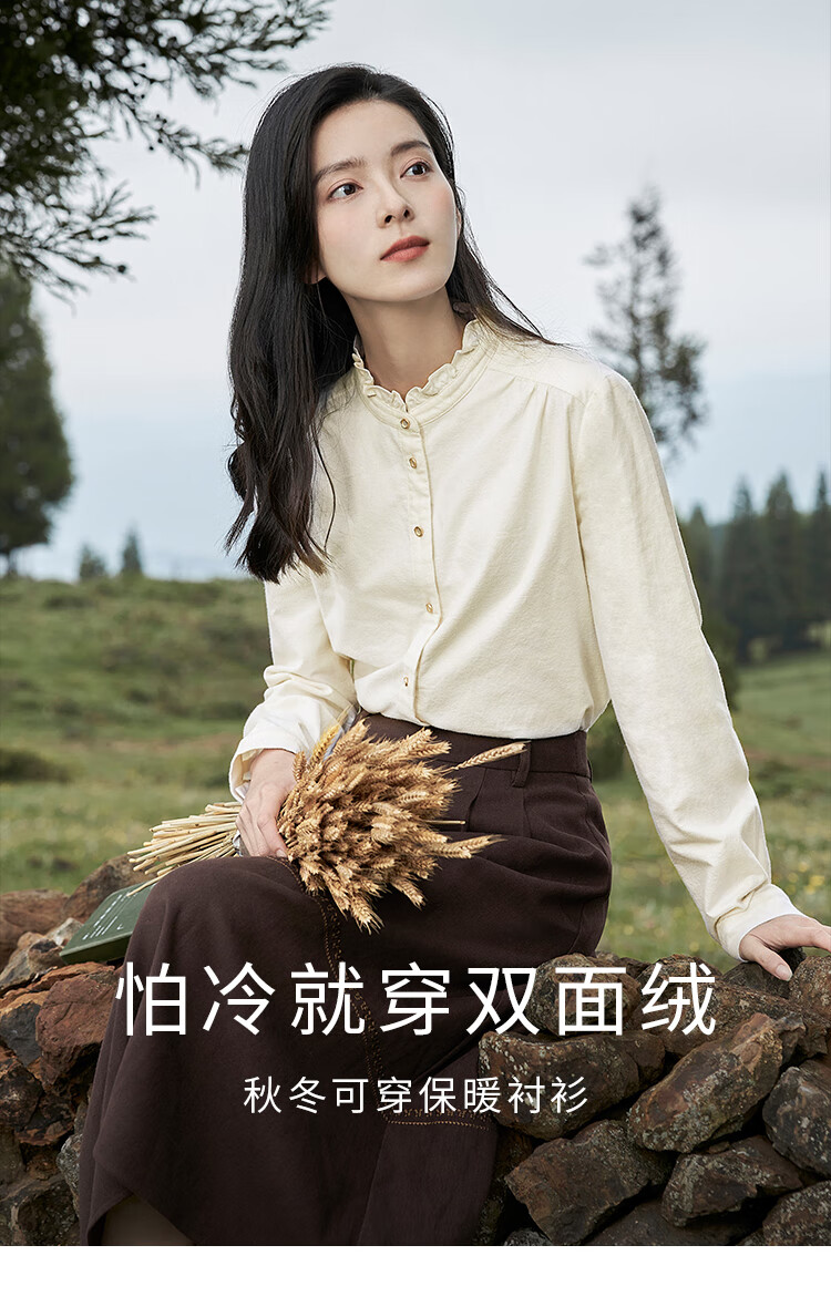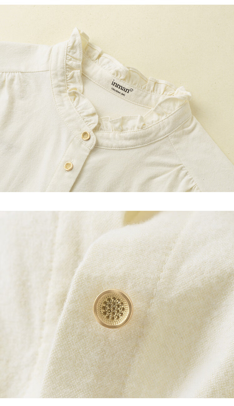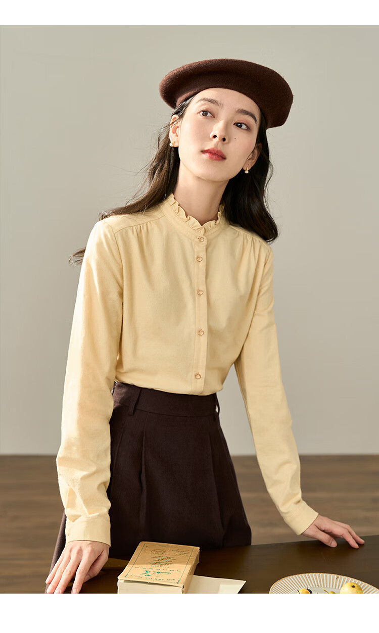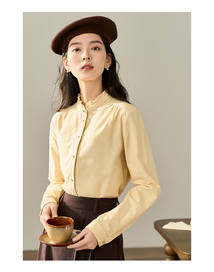 Yinmandong Women's Retro Style Pastoral Ruffled Stand Collar Metal Button Retro Versatile Long Sleeve Shirt Beige-M