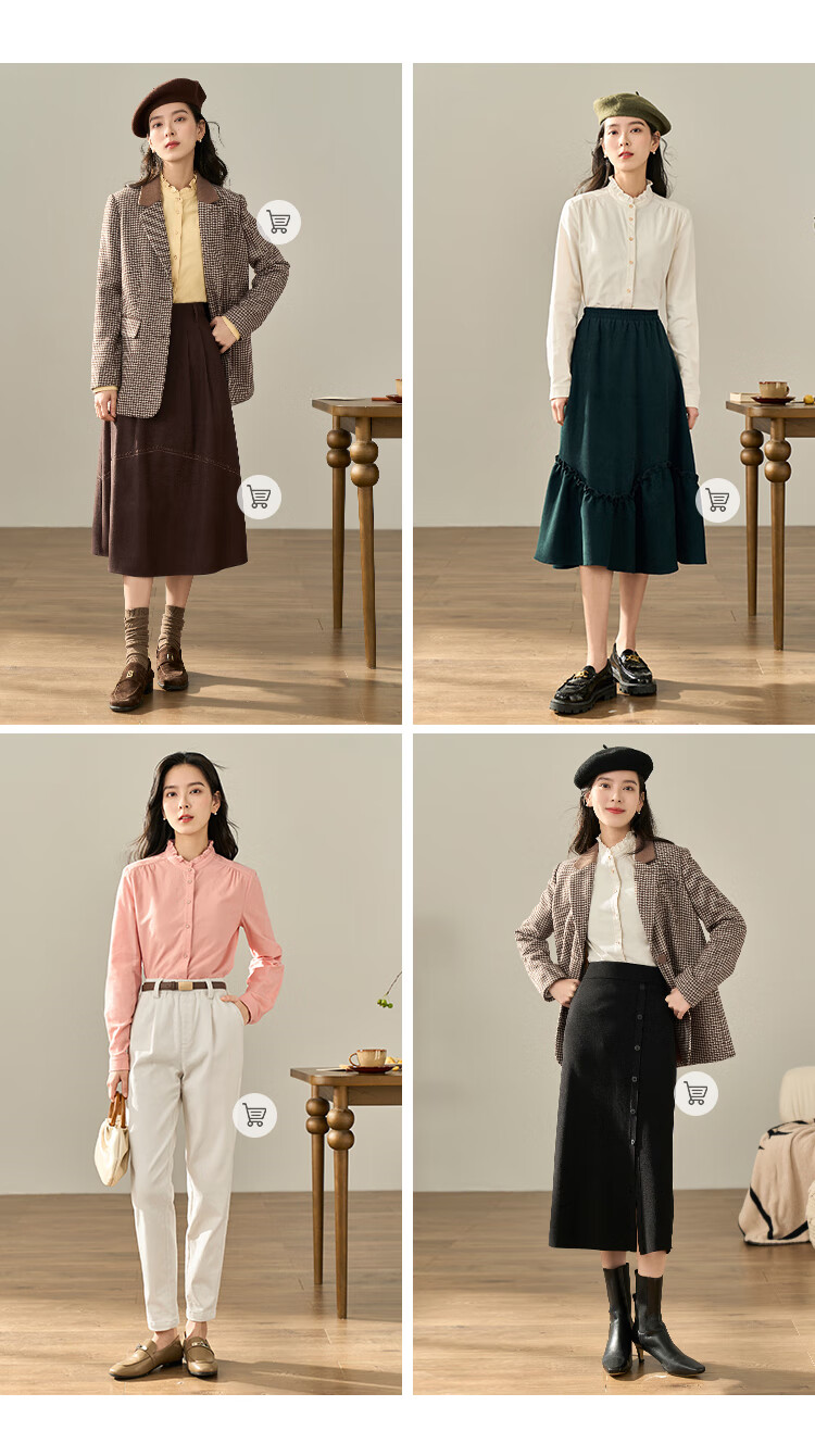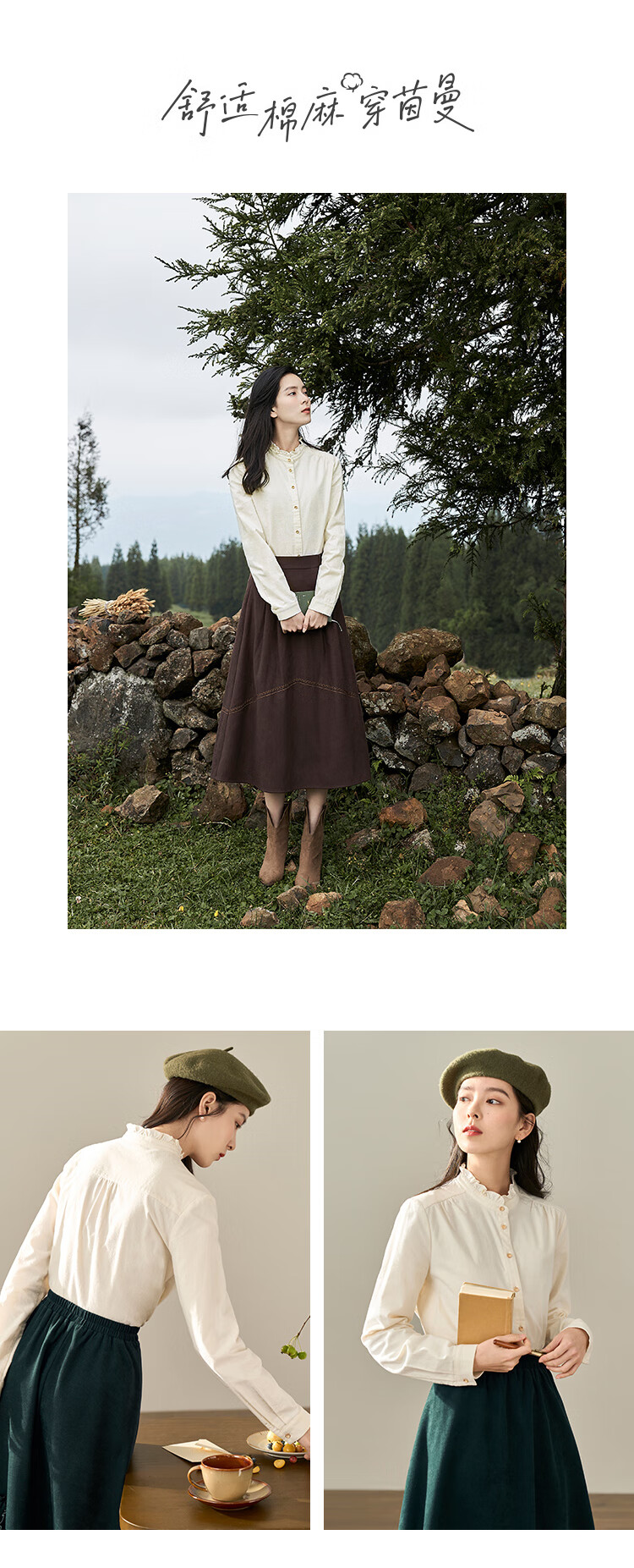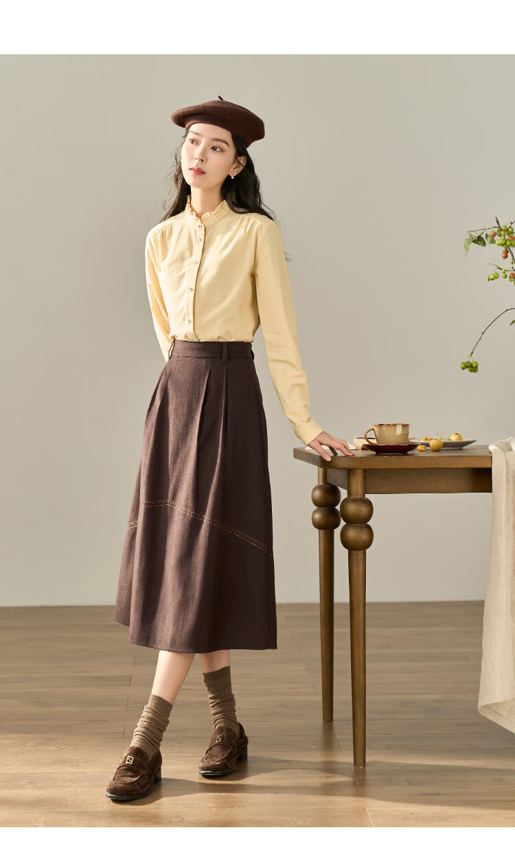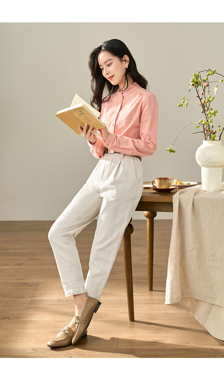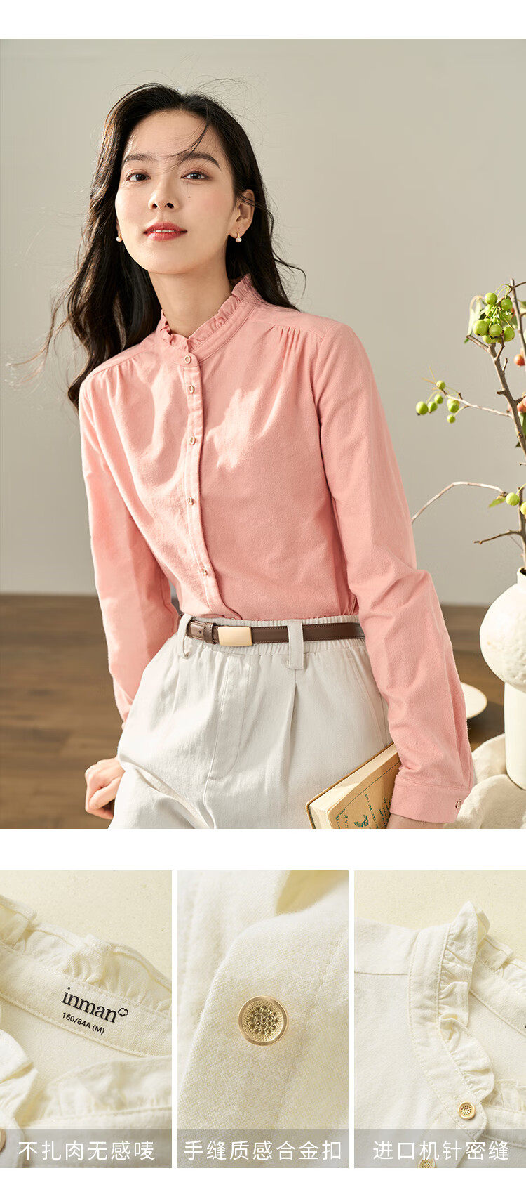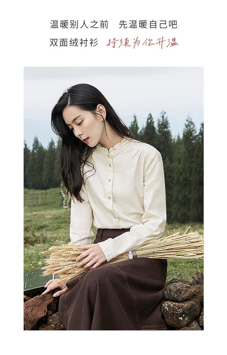 Yinmandong Women's Retro Style Pastoral Ruffled Stand Collar Metal Button Retro Versatile Long Sleeve Shirt Beige-M