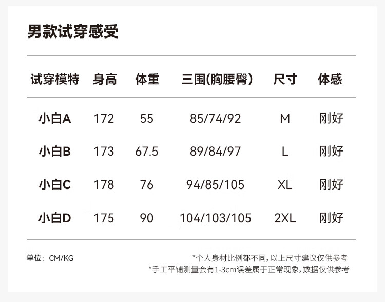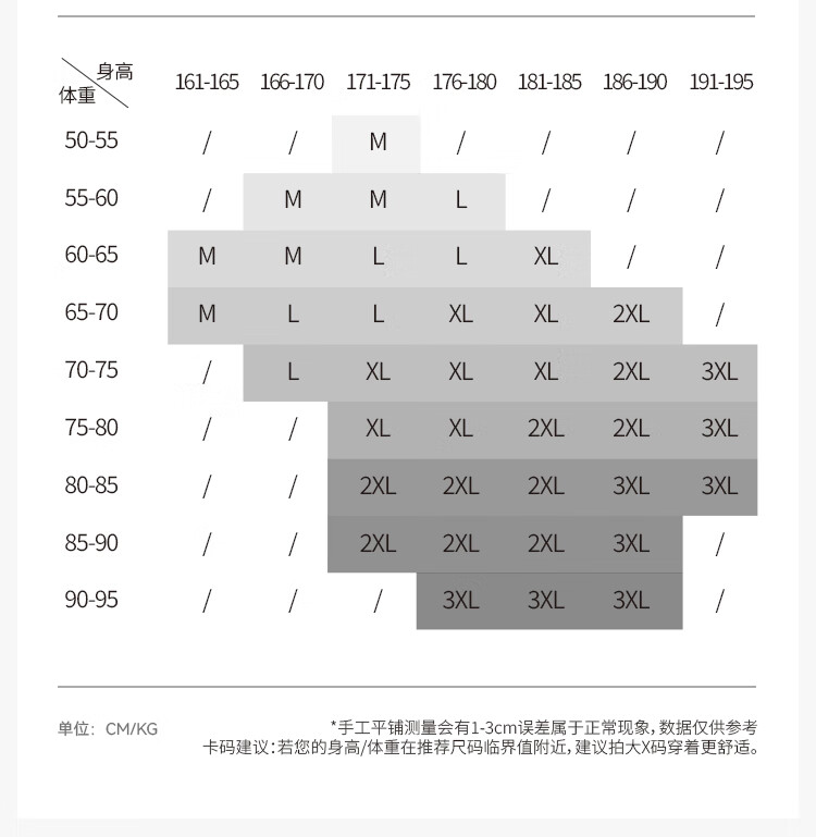 China (cm) 165 / 88-90 170 / 96-98 175 / 108-110 180 / 118-122 185 / 126-130