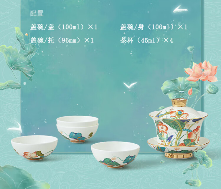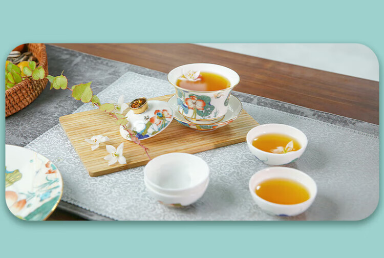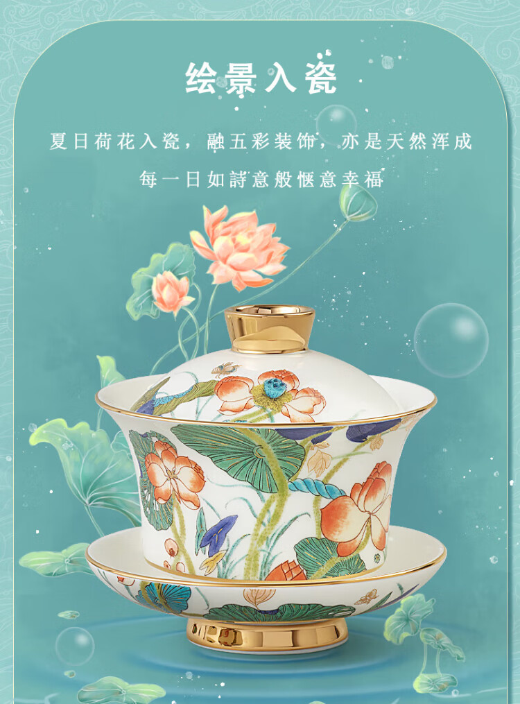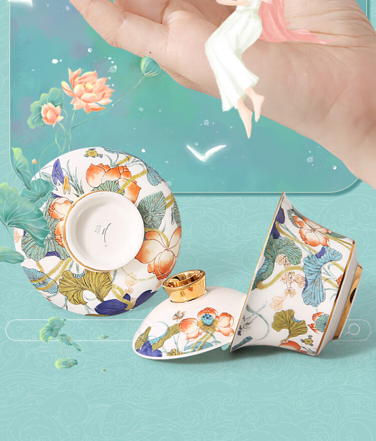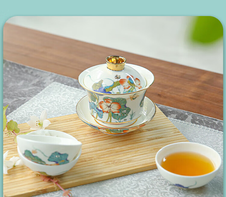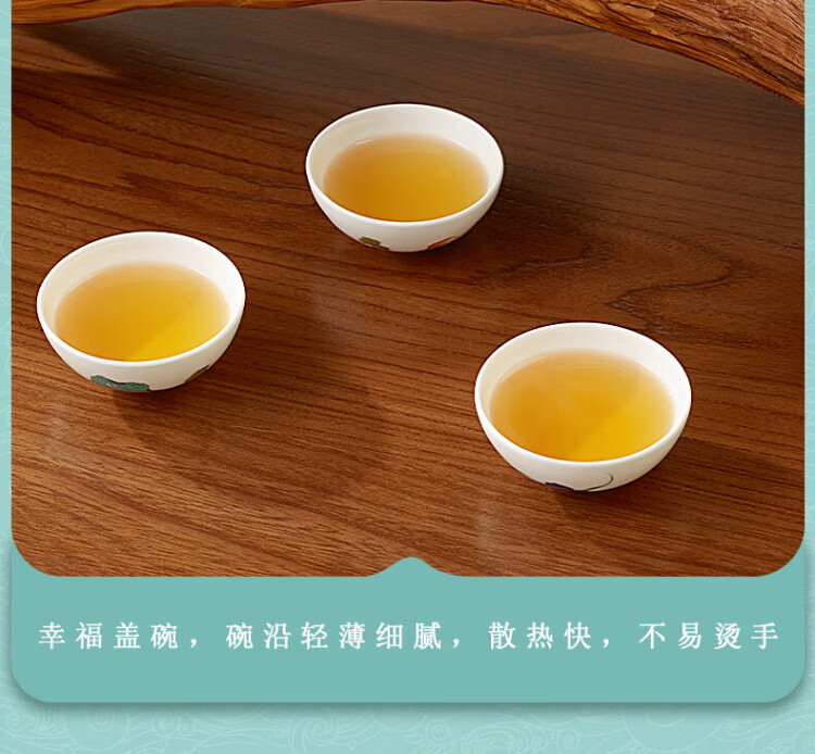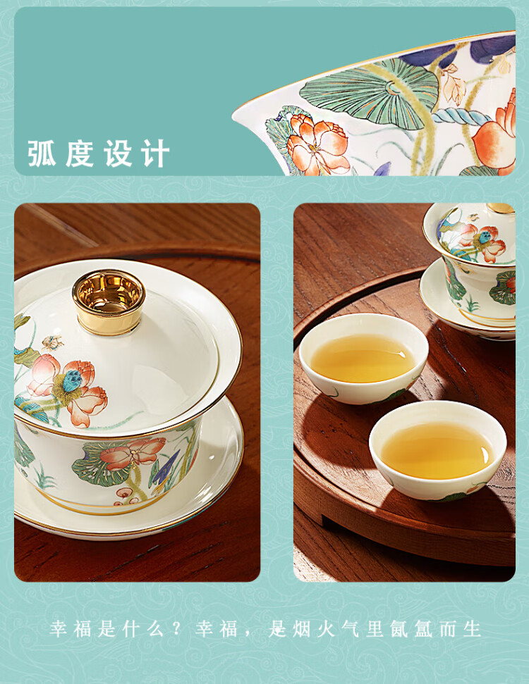 Auratic Chinese porcelain Yongfengyuan Xingfu Heming 7-head ceramic tea set-covered bowl set (4 persons) gift box packaging
