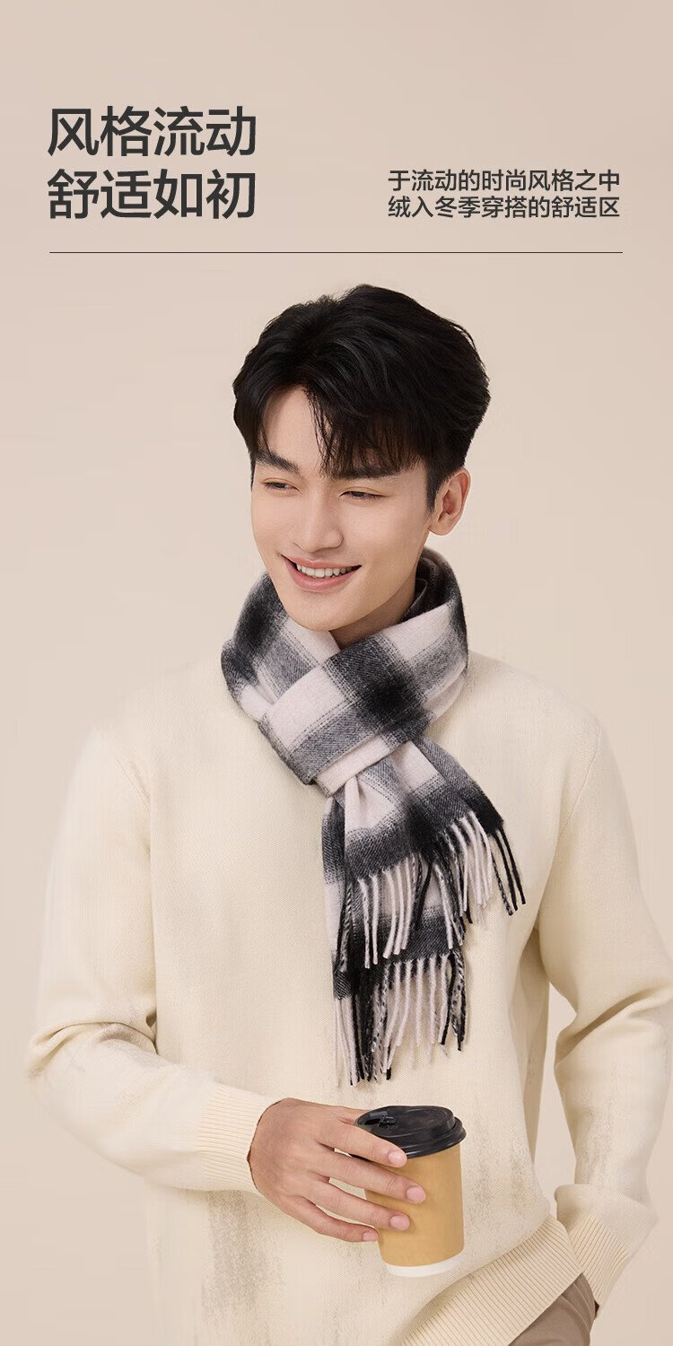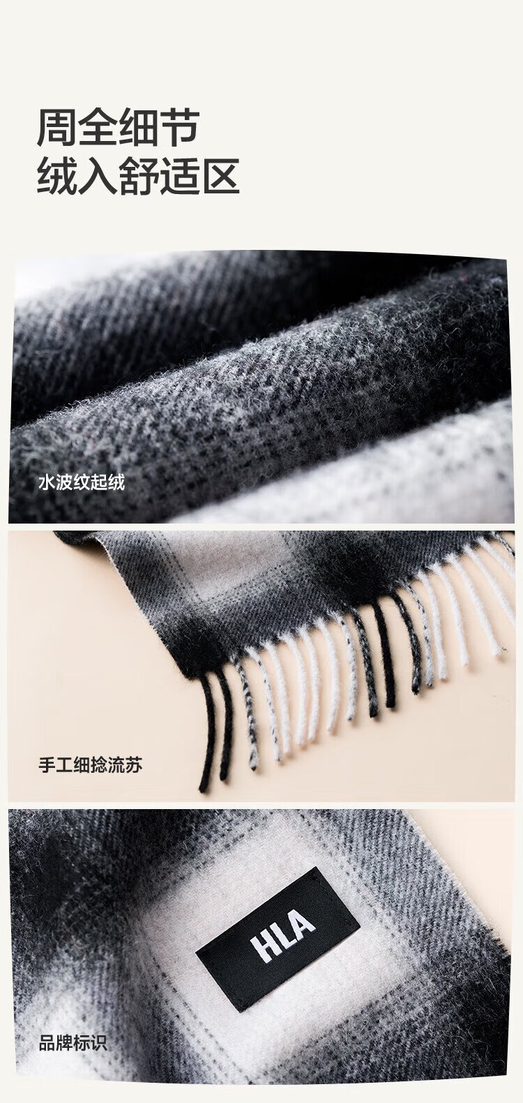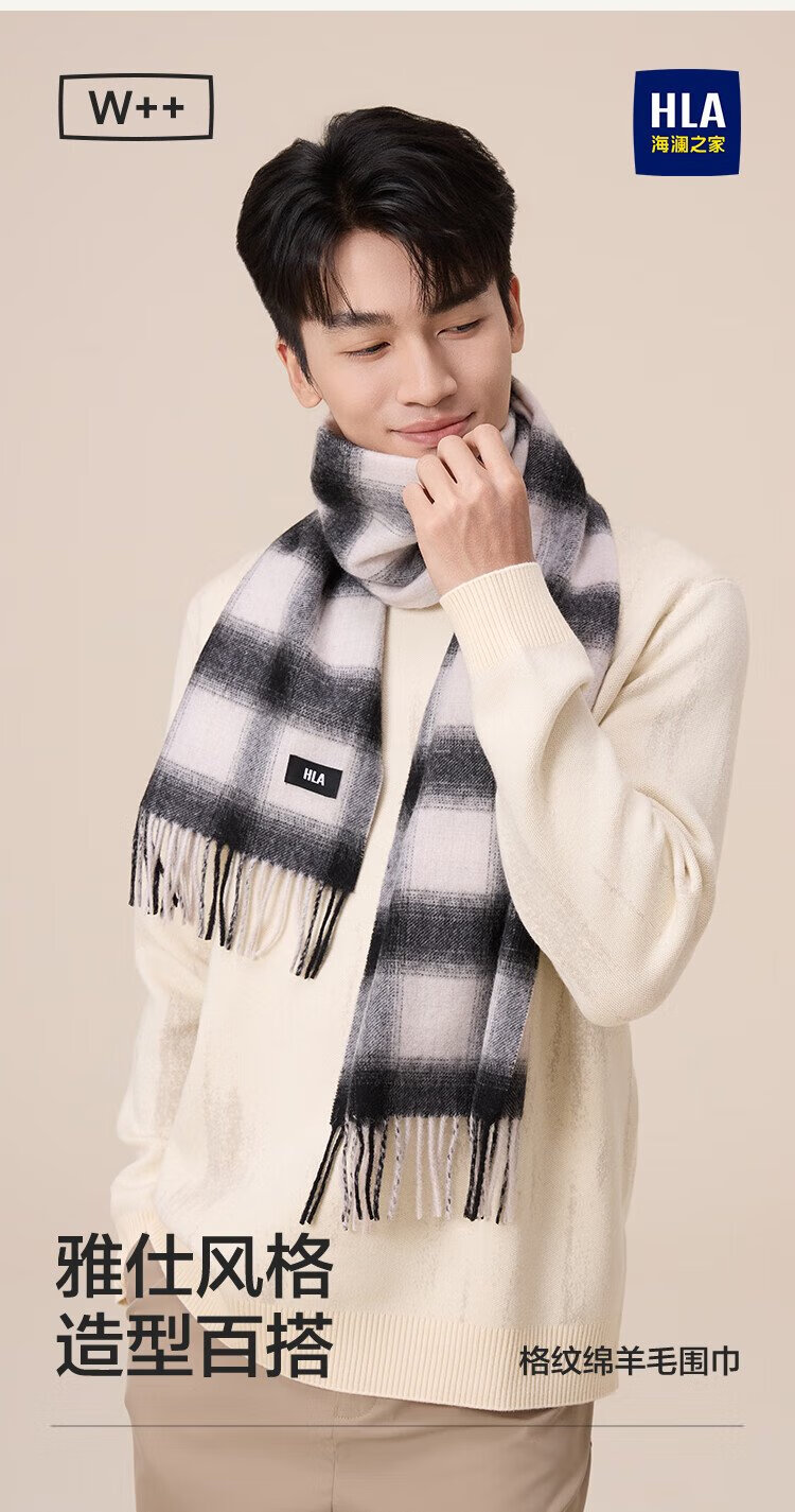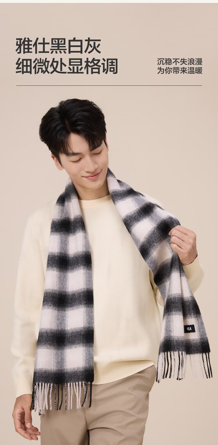 Heilan House Men's Pure Wool Scarf Fashion Plaid Scarf Versatile Autumn and Winter Warmth, Cold and Windproof Outdoor Black and Gray Plaid