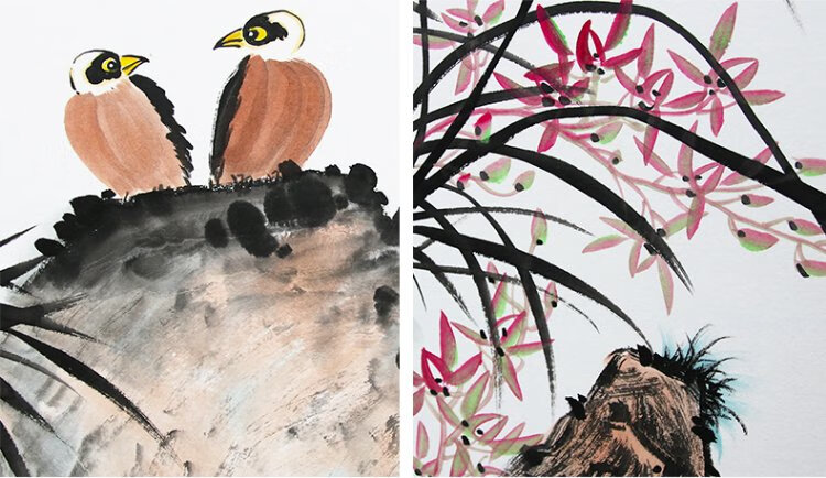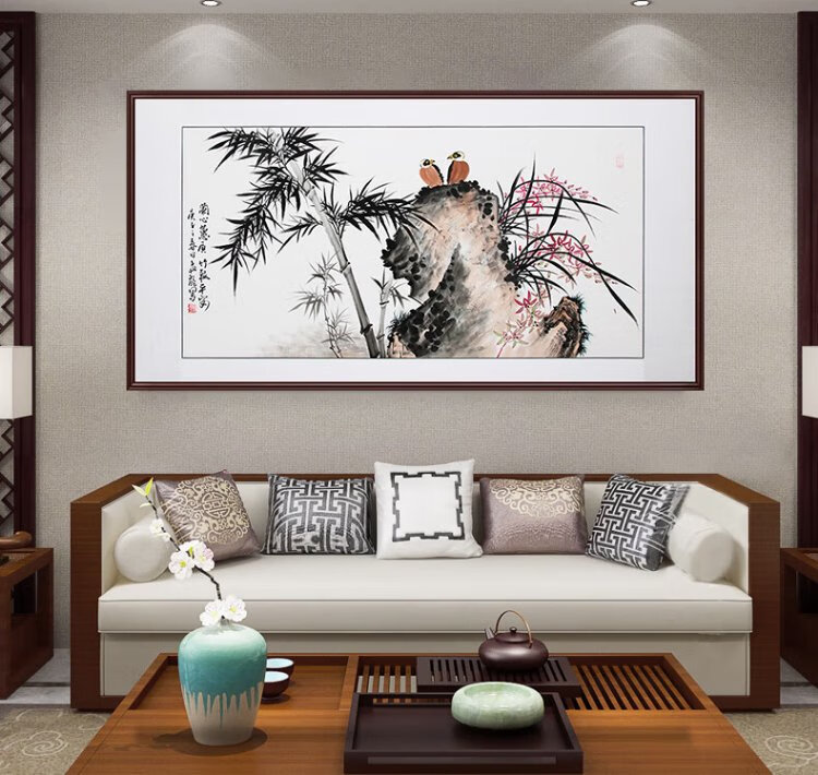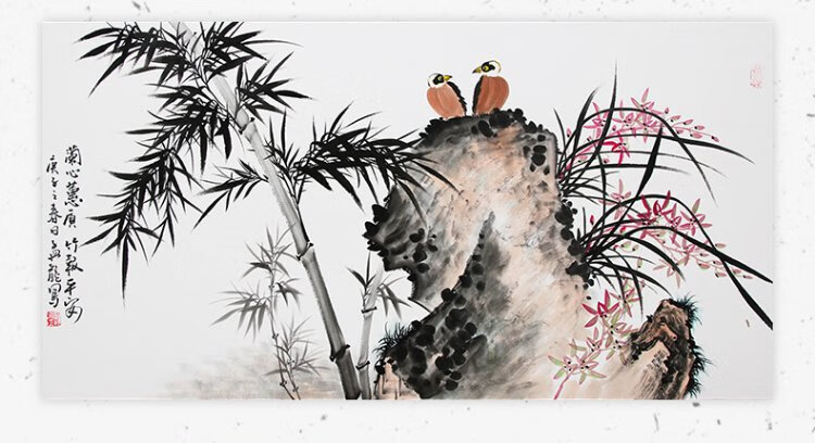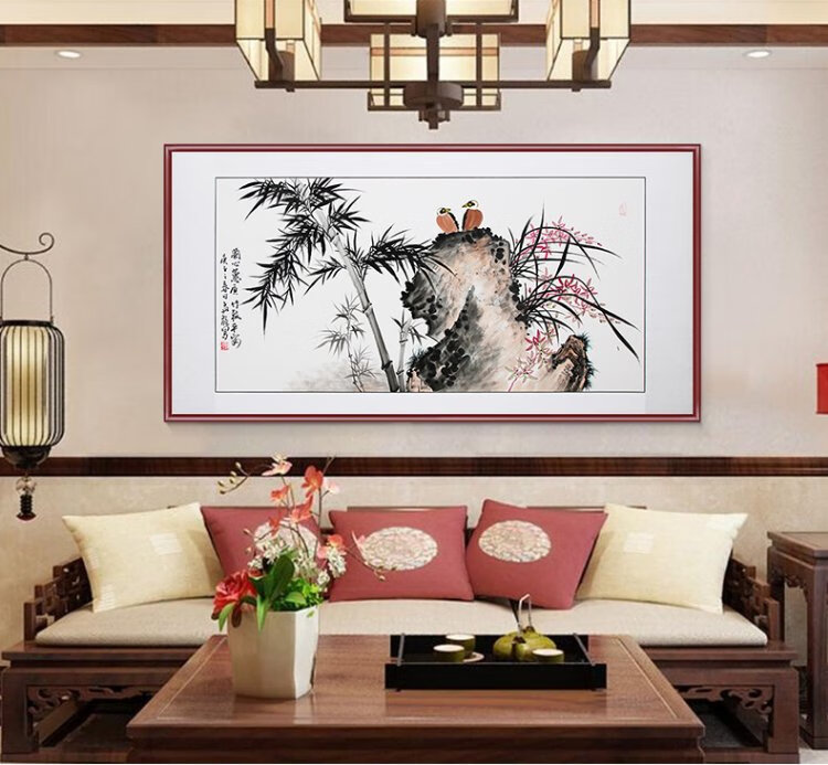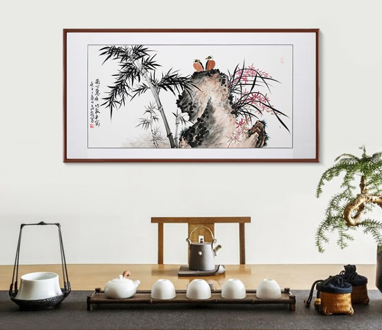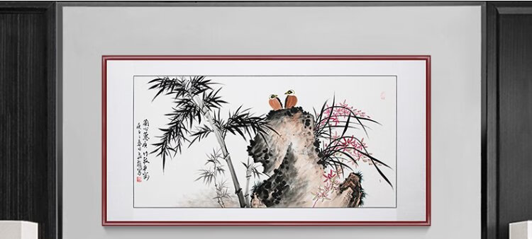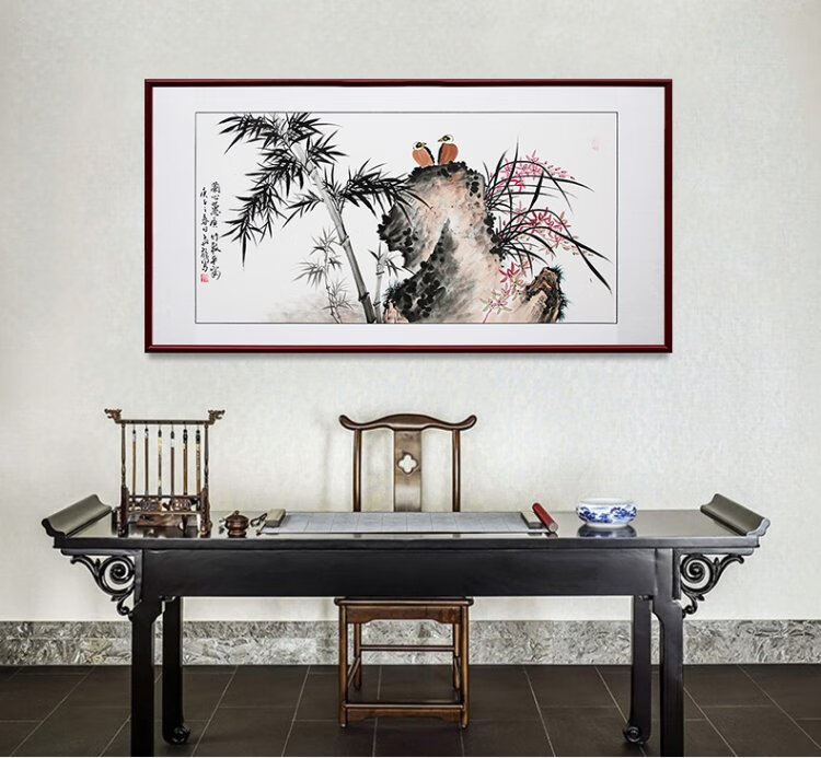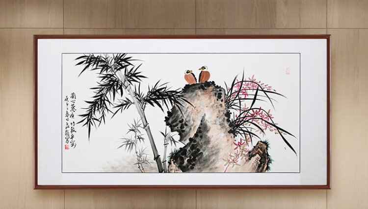 Han Aochun authentic hand-painted traditional Chinese painting, living room decoration painting, sofa background painting, study hanging painting, flower and bird bamboo orchid ink painting, orchid heart and bamboo to signify peace, with brown frame, mounting with solid wood frame, 165*85cm