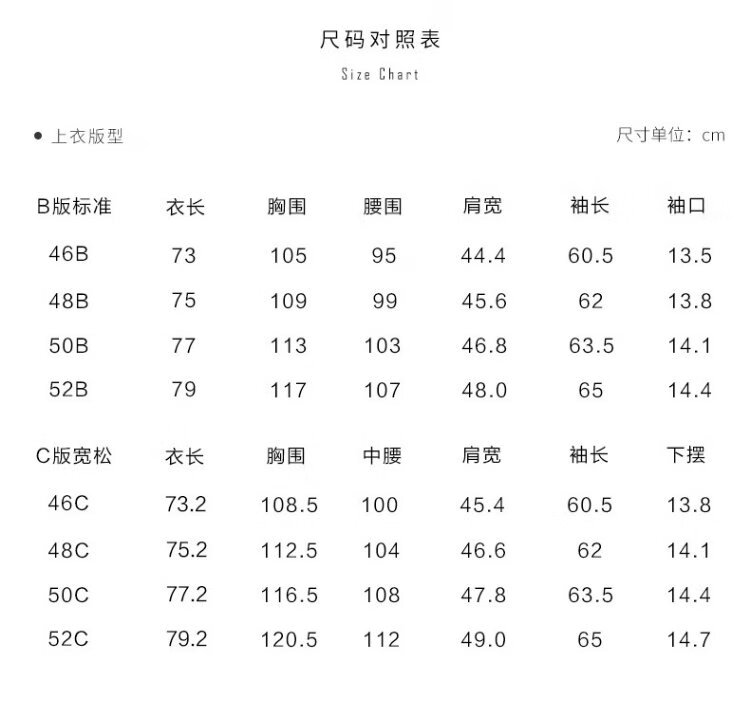 China (cm) 160-165/84-86 165-170 / 88-90 167-172 / 92-96 168-173 / 98-102 170-176 / 106-110