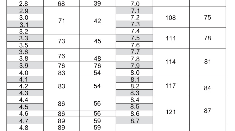 76.2 81.3 86.4 91.5 96.5 101.6 106.7 112 117 122 127 132 137 142