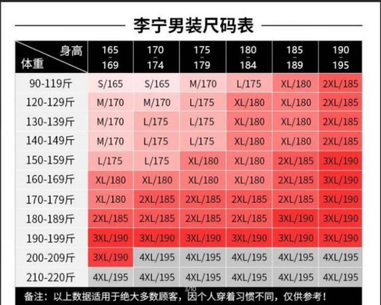 China (cm) 165 / 88-90 170 / 96-98 175 / 108-110 180 / 118-122 185 / 126-130