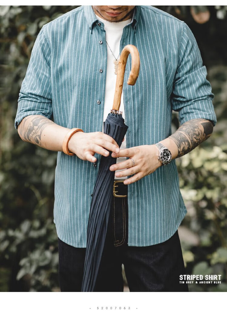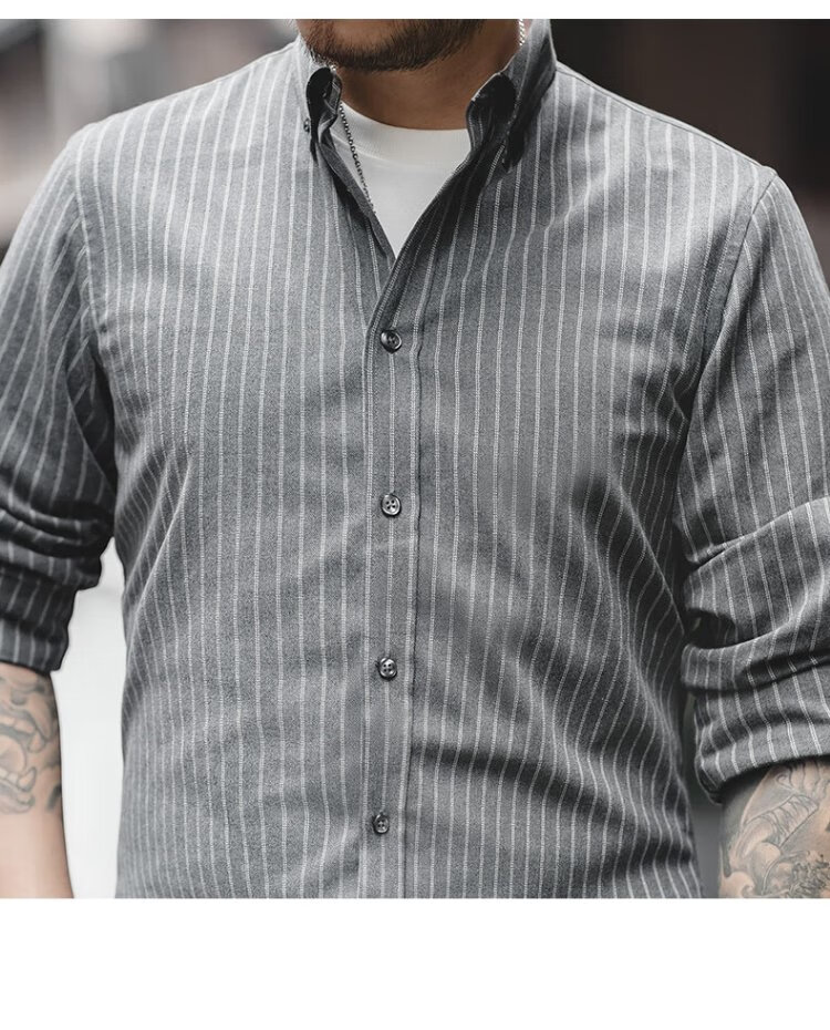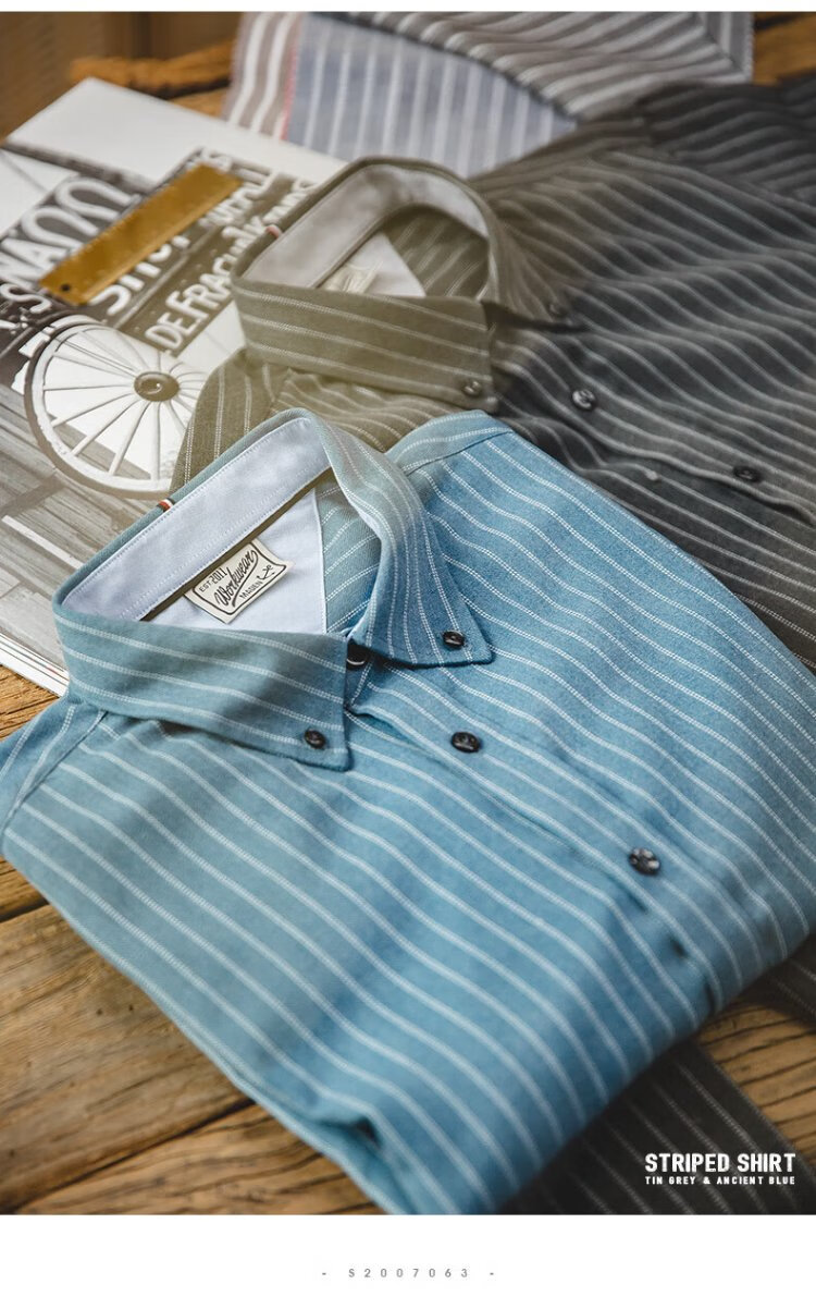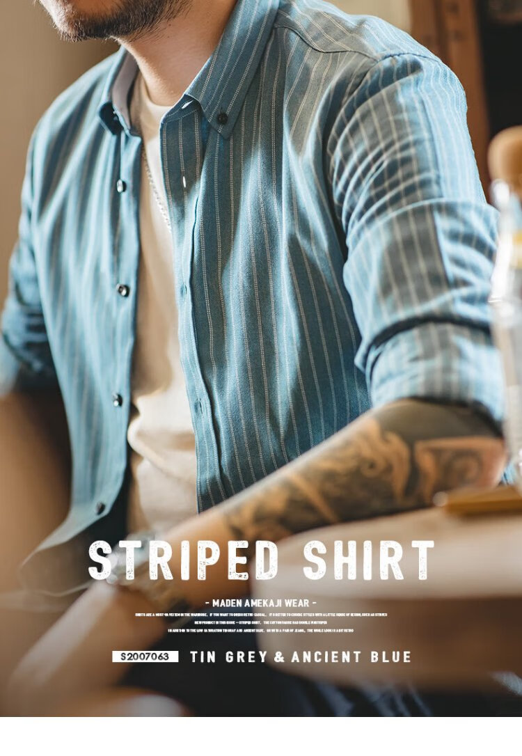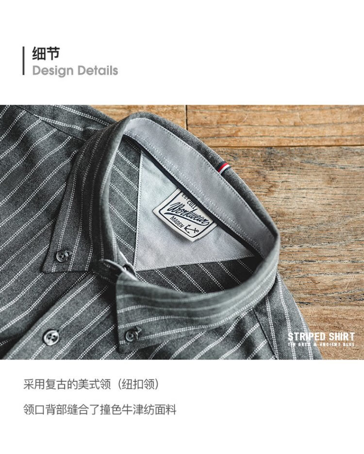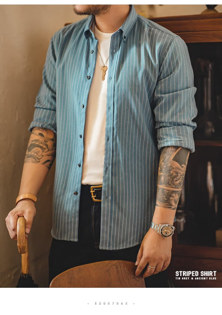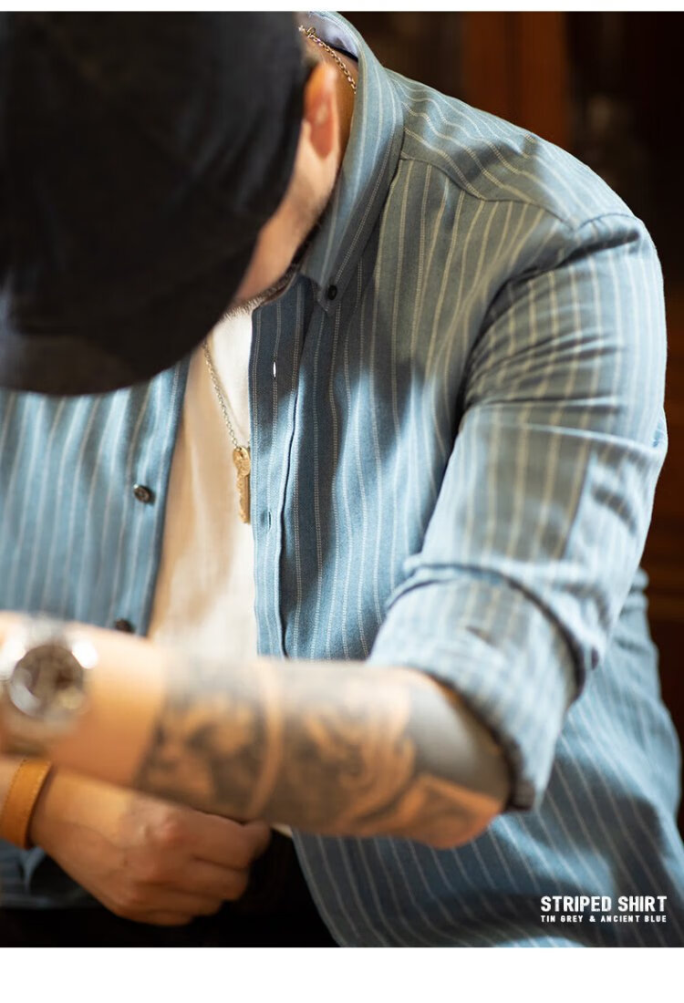Madden Workwear American Retro Brushed Vertical Stripe Shirt Men's Lapel Casual Long Sleeve Shirt Slim Thin Top Jacket Ancient Blue L
