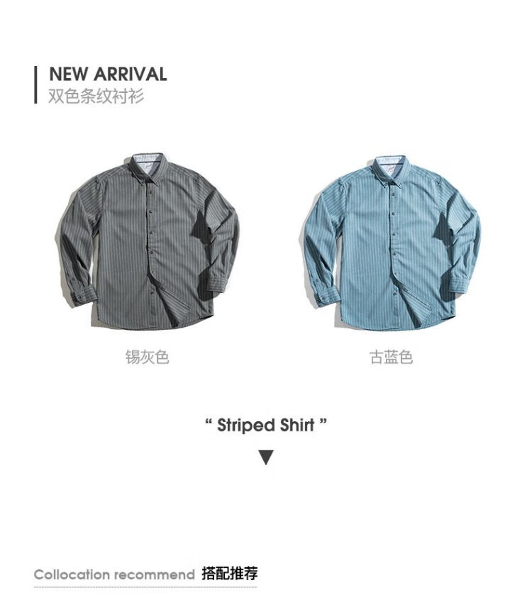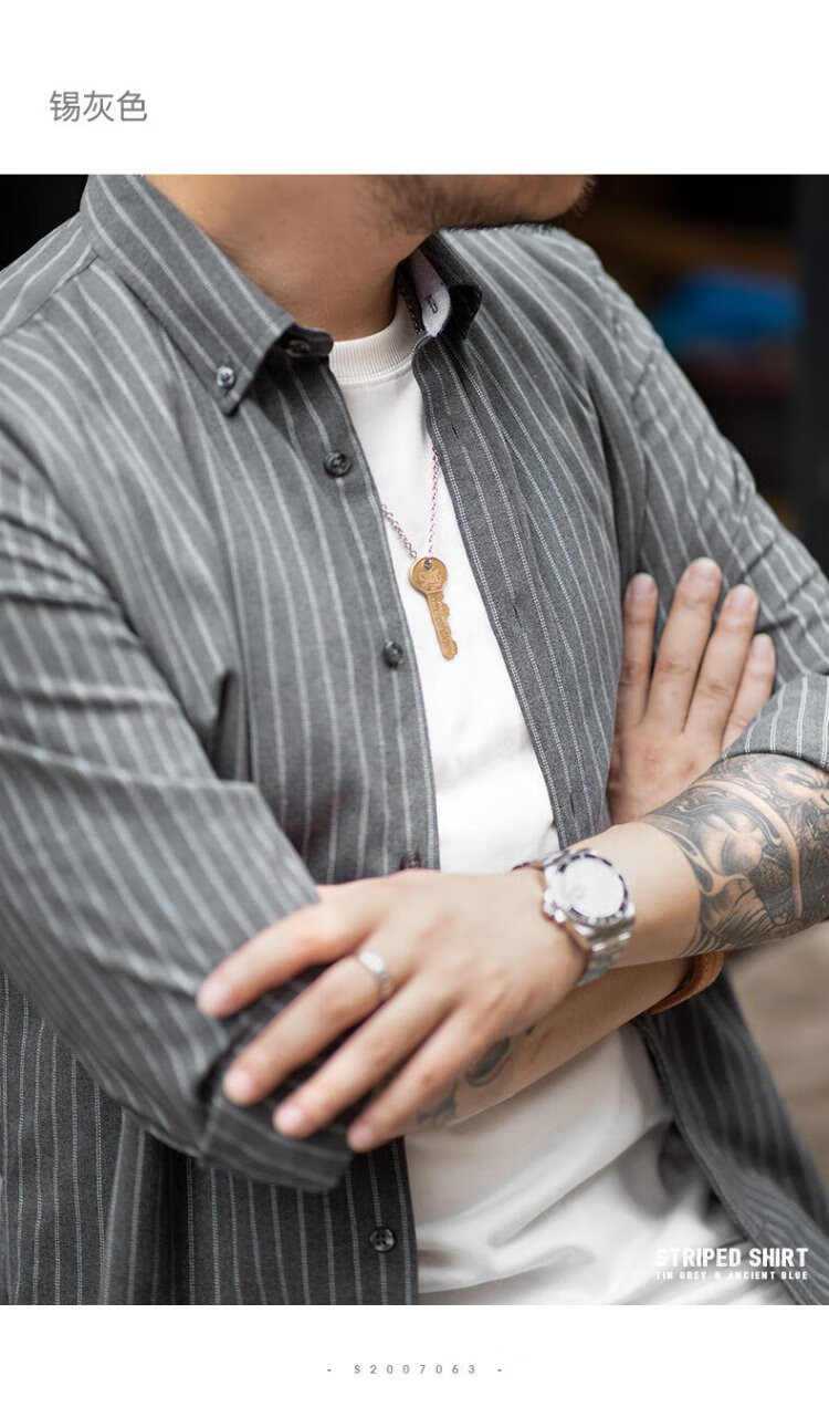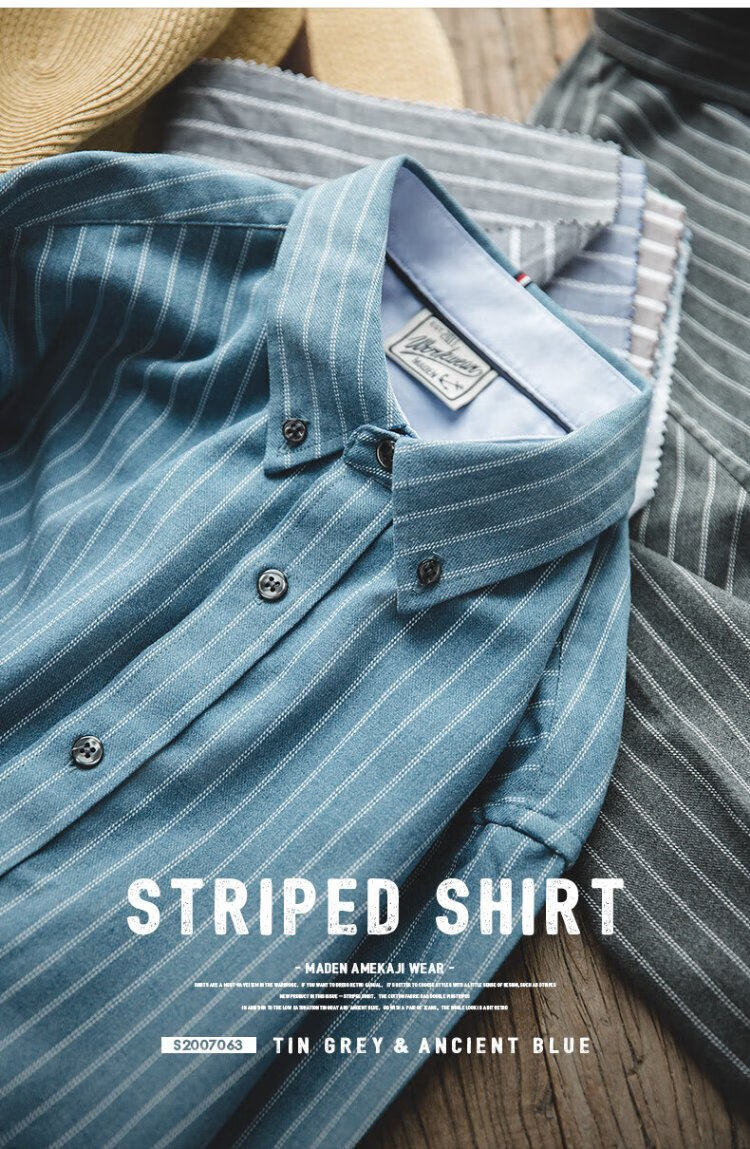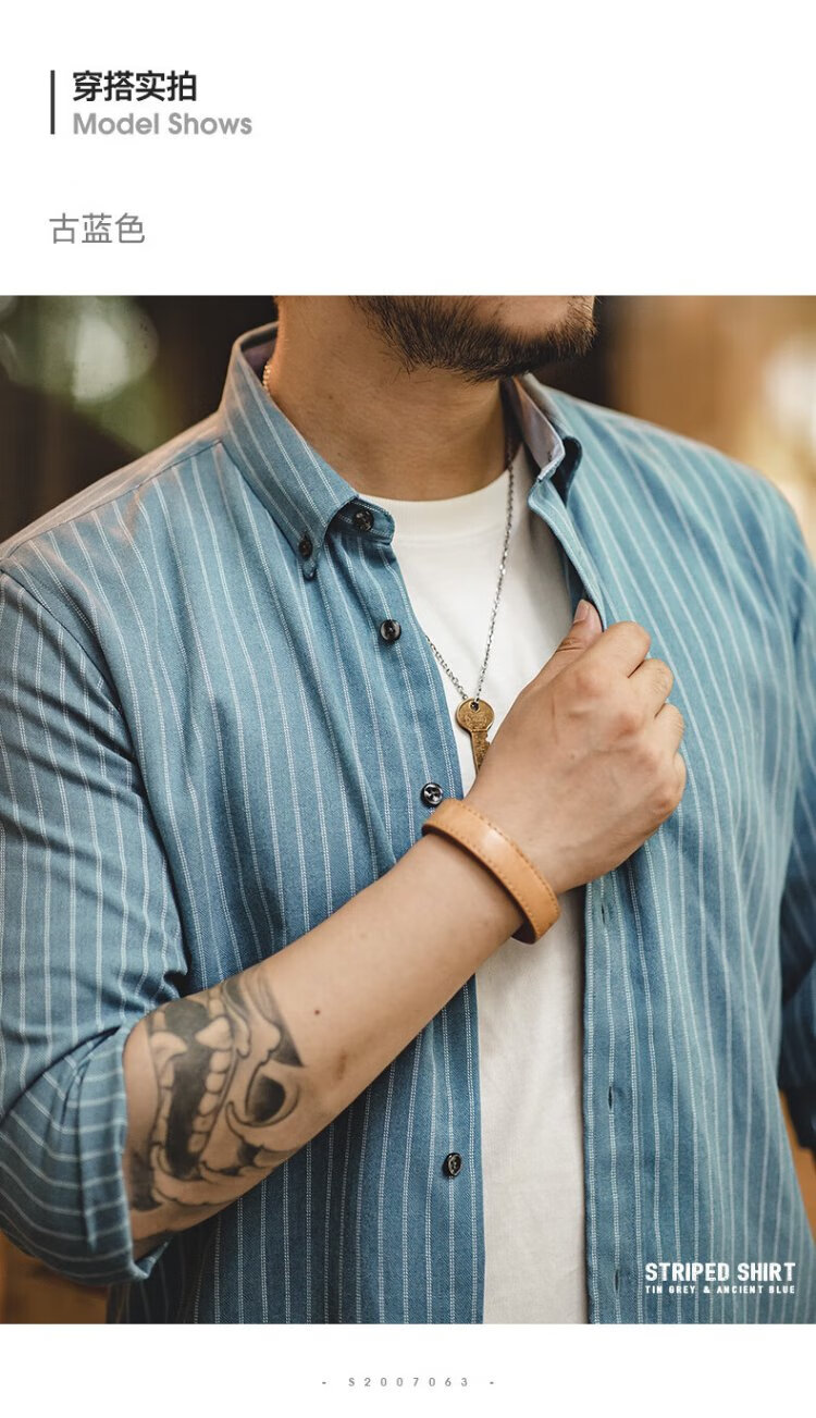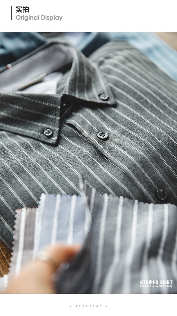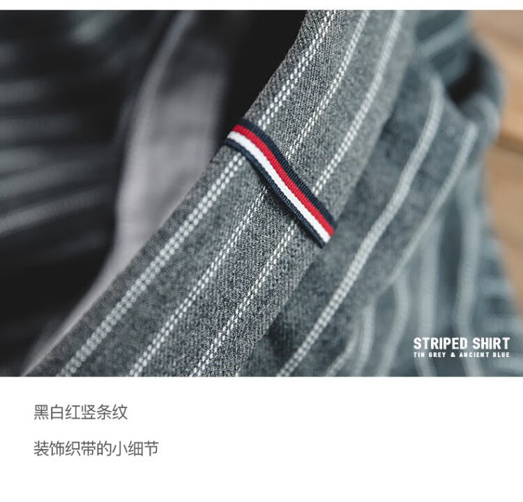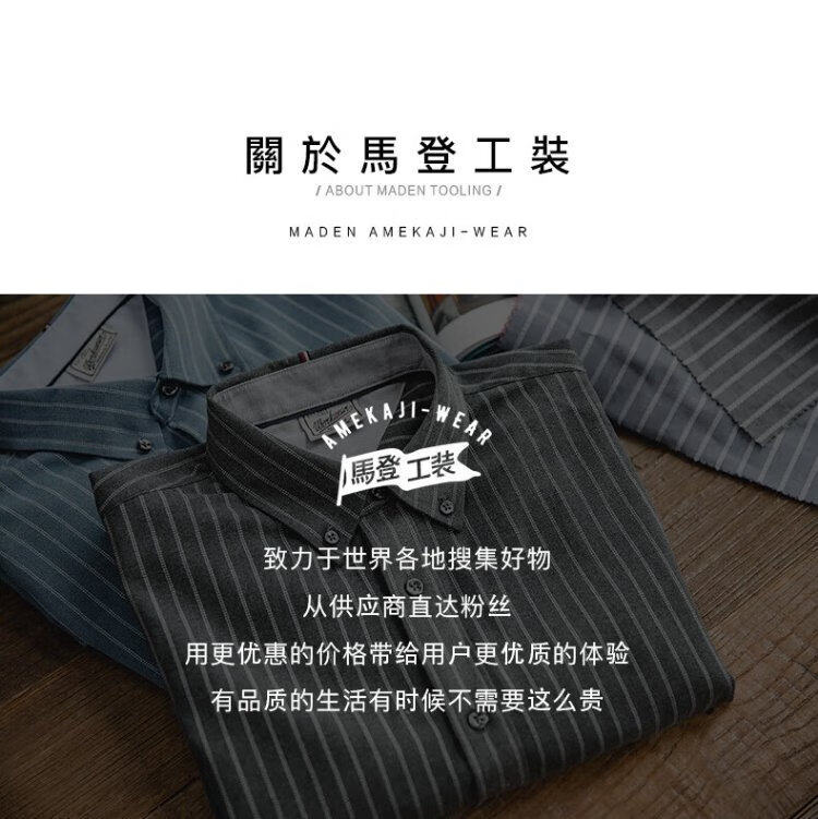 Madden Workwear American Retro Brushed Vertical Stripe Shirt Men's Lapel Casual Long Sleeve Shirt Slim Thin Top Jacket Ancient Blue L