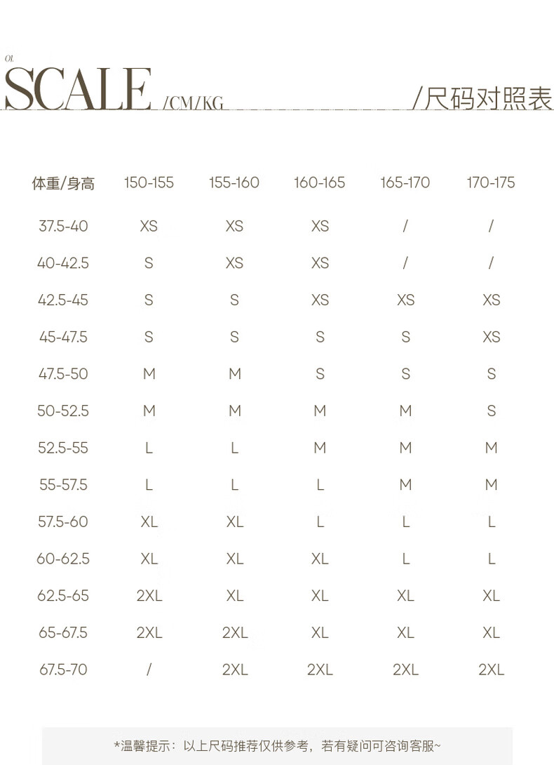 China (cm) 160-165/84-86 165-170 / 88-90 167-172 / 92-96 168-173 / 98-102 170-176 / 106-110