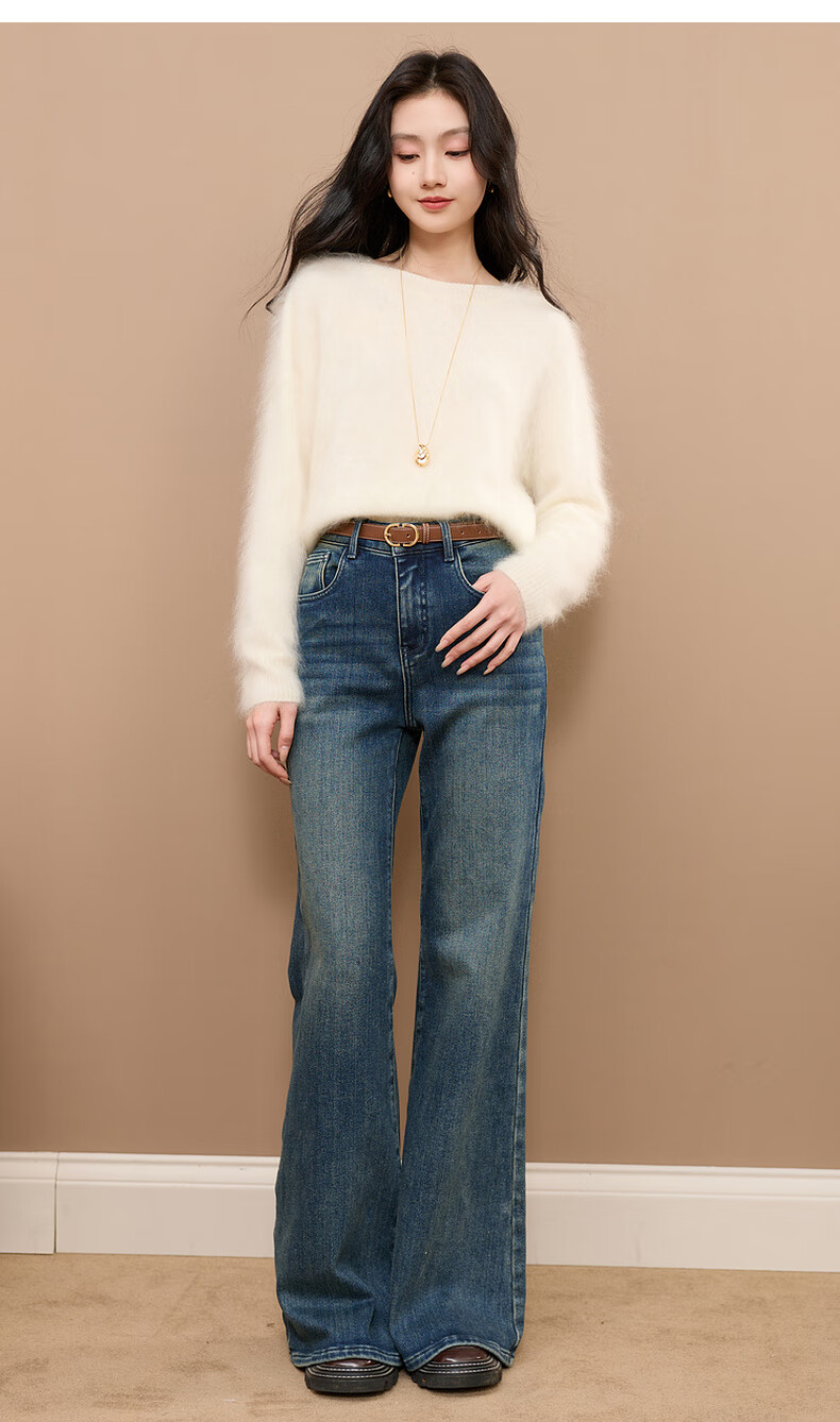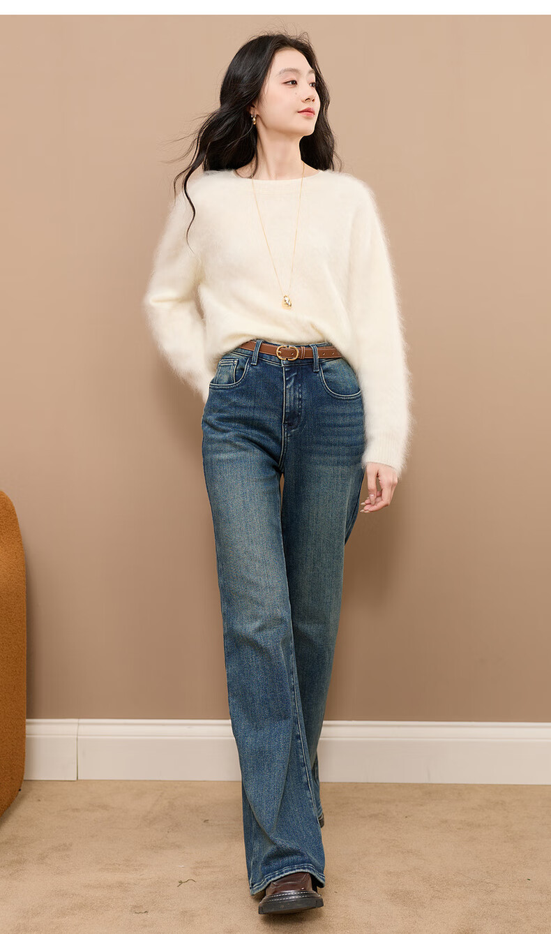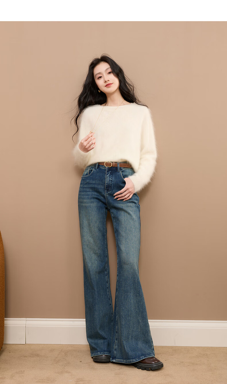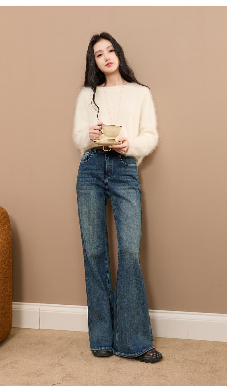 Sancai 2025 new winter style high-waisted brushed jeans casual pants slim-fit bell-bottom trousers micro-flared trousers S