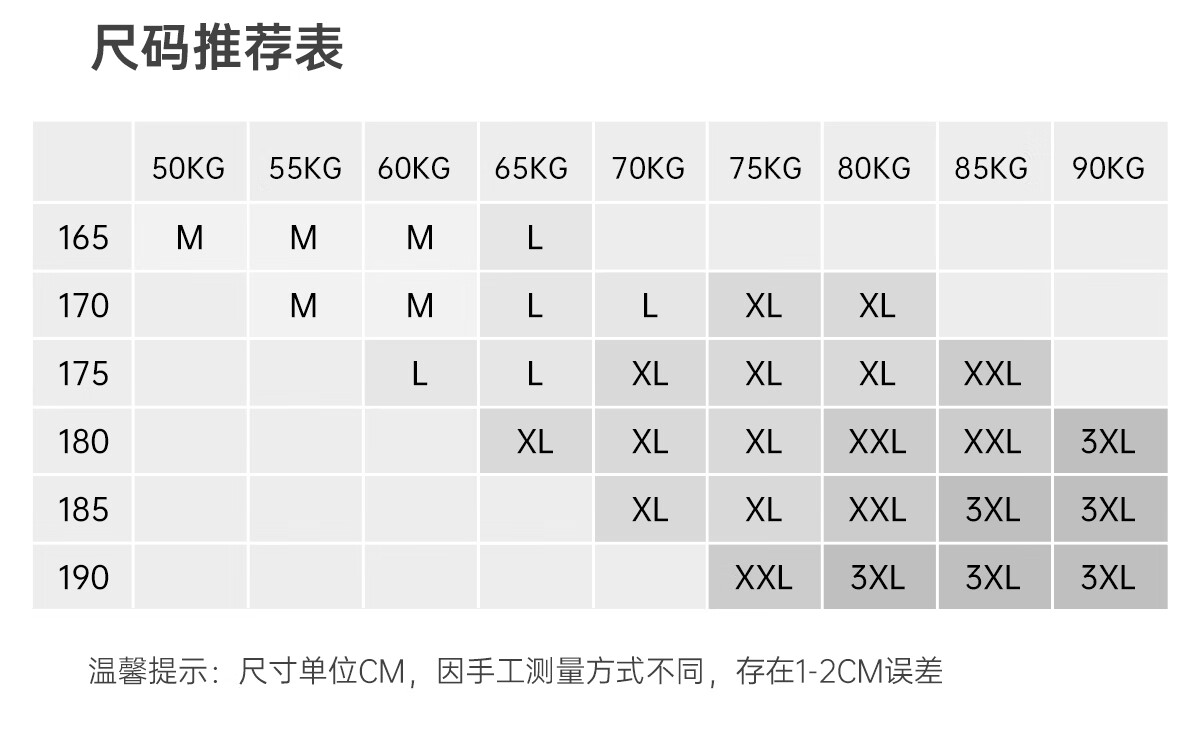 China (cm) 165 / 88-90 170 / 96-98 175 / 108-110 180 / 118-122 185 / 126-130