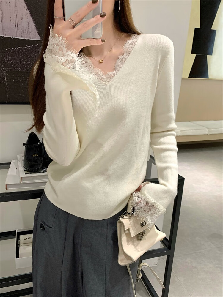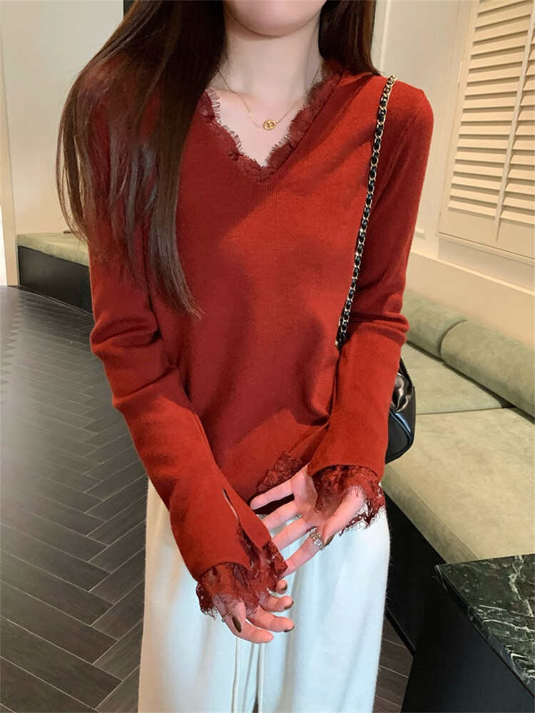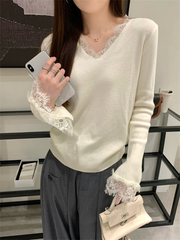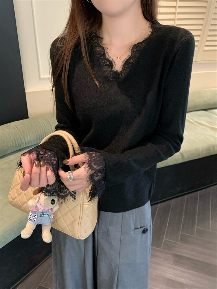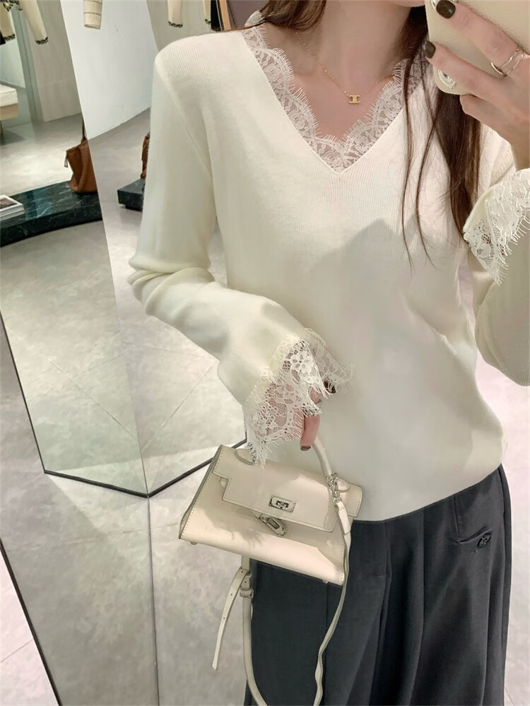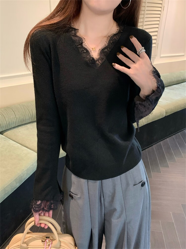 Yu Zhaolin (YUZHAOLIN) knitted bottoming shirt for women French v-neck temperament lace splicing pure desire autumn and winter new long-sleeved inner sweater