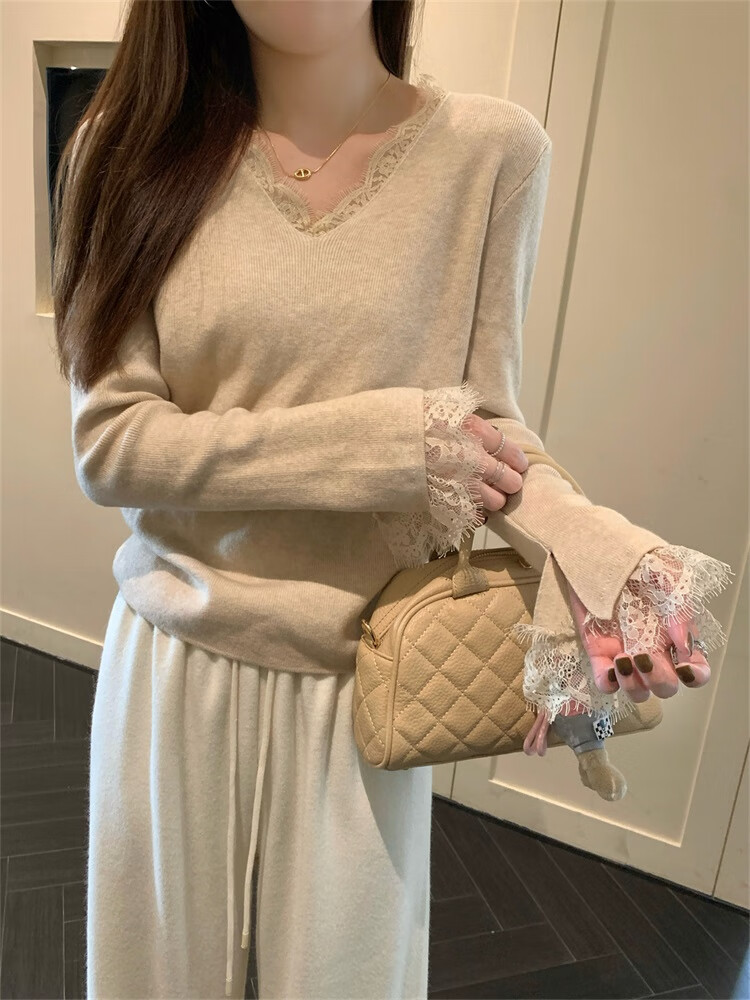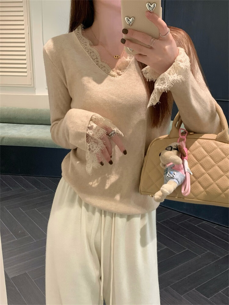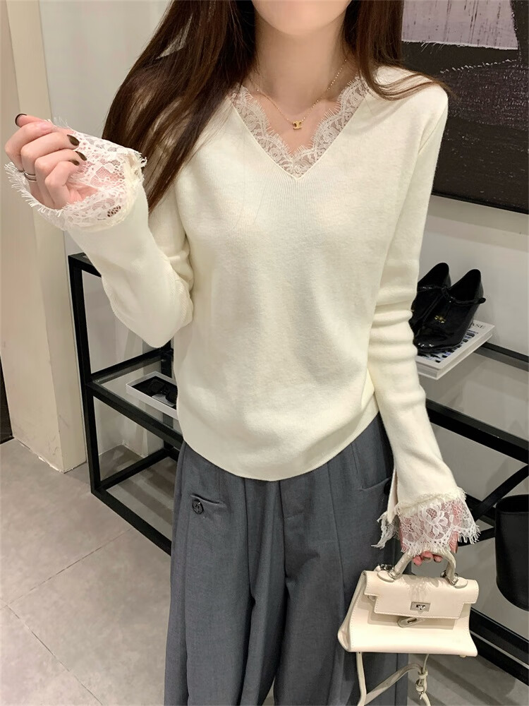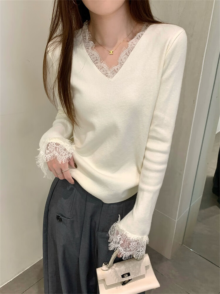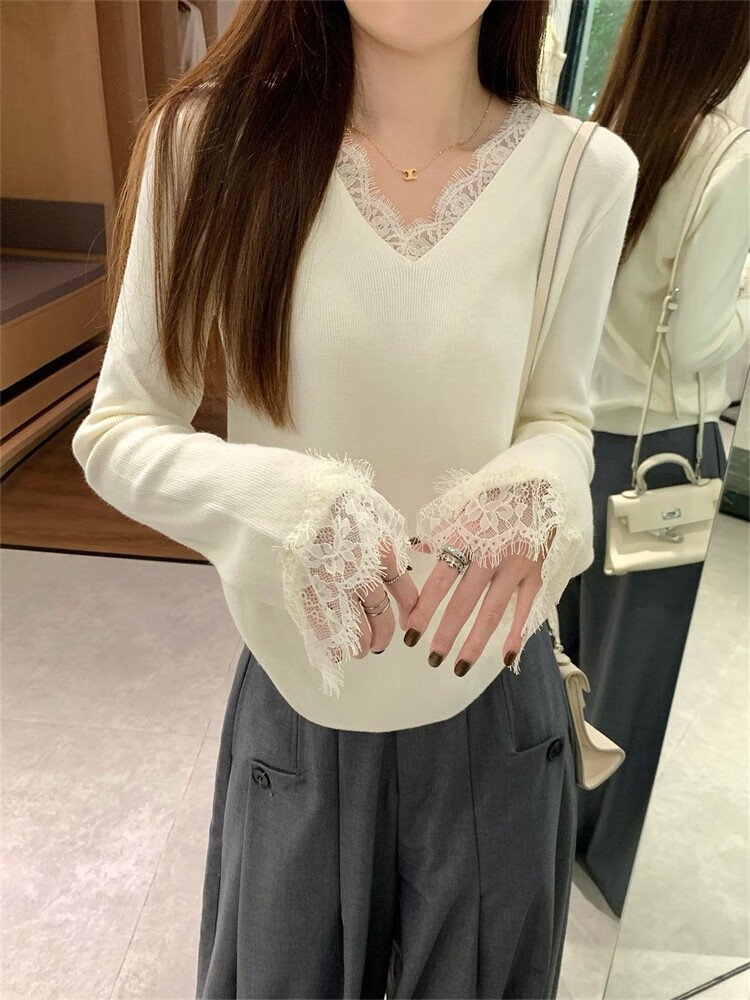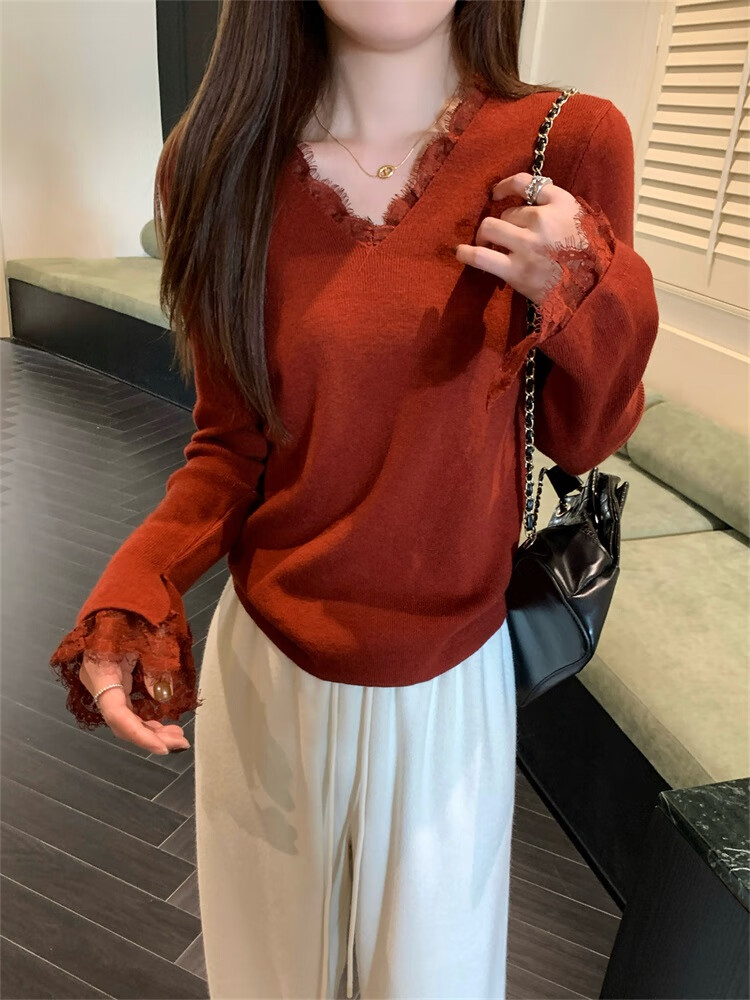 Yu Zhaolin (YUZHAOLIN) knitted bottoming shirt for women French v-neck temperament lace splicing pure desire autumn and winter new long-sleeved inner sweater