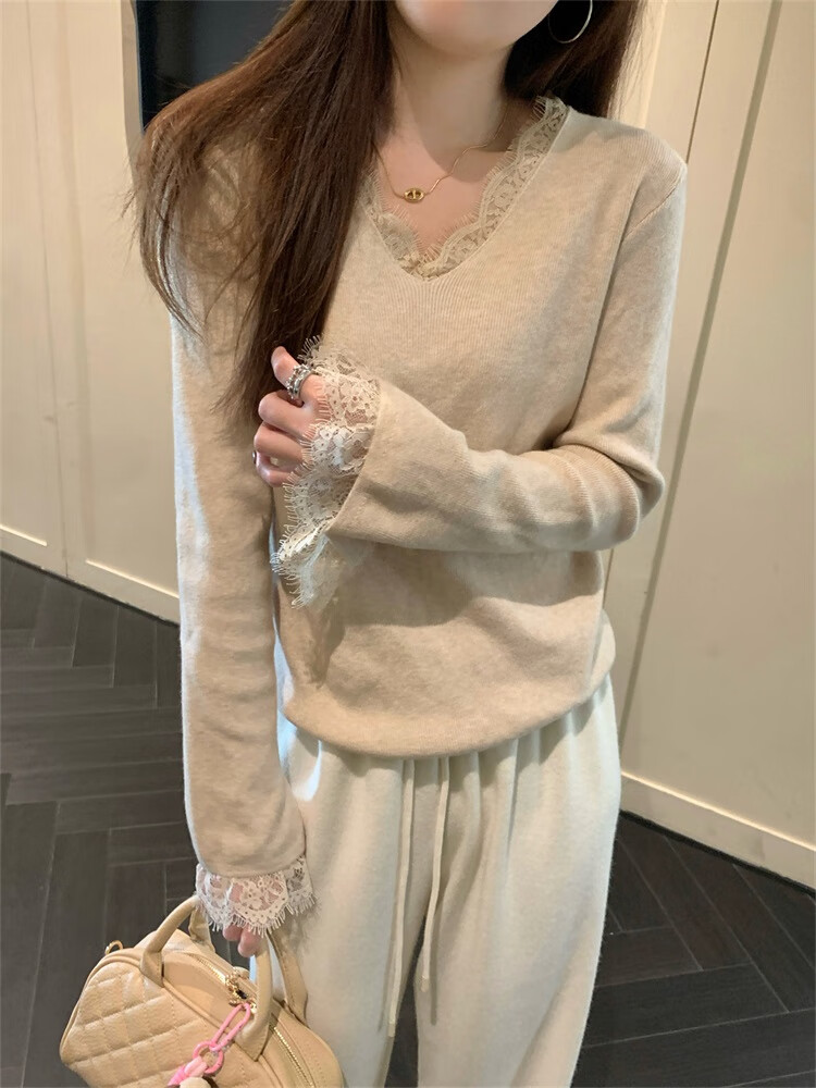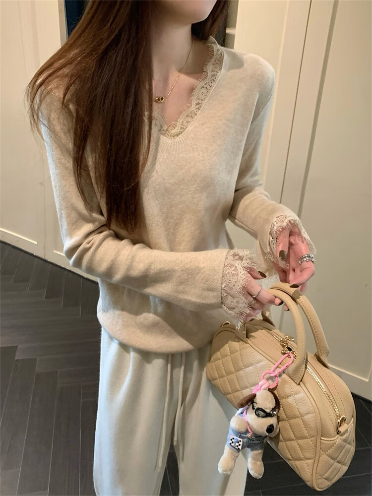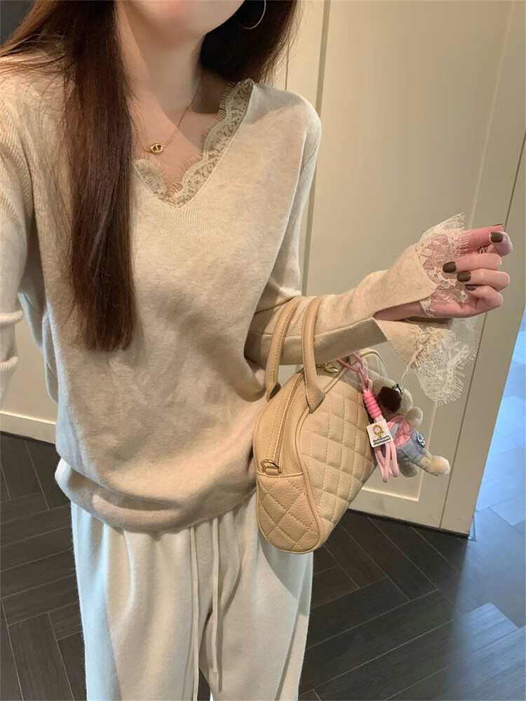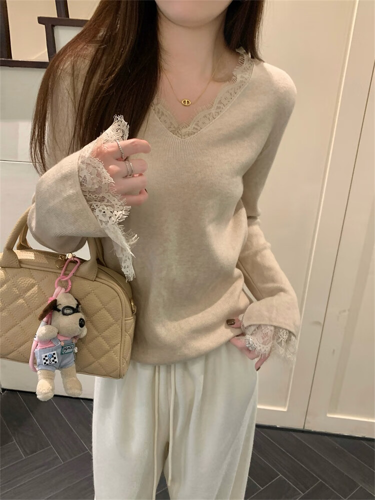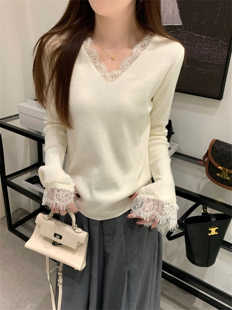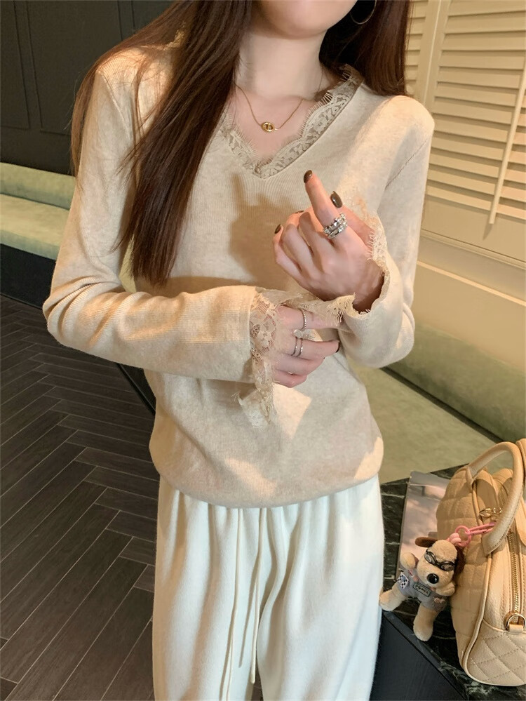 Yu Zhaolin (YUZHAOLIN) knitted bottoming shirt for women French v-neck temperament lace splicing pure desire autumn and winter new long-sleeved inner sweater