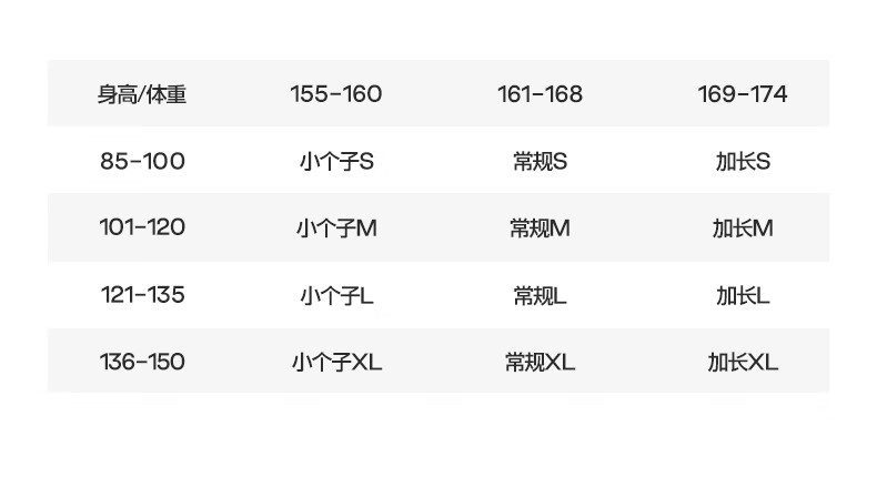 China (cm) 160-165/84-86 165-170 / 88-90 167-172 / 92-96 168-173 / 98-102 170-176 / 106-110