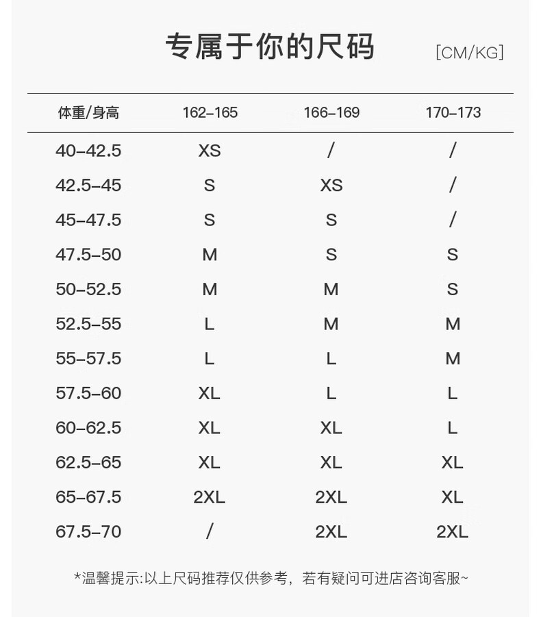 China (cm) 160-165/84-86 165-170 / 88-90 167-172 / 92-96 168-173 / 98-102 170-176 / 106-110