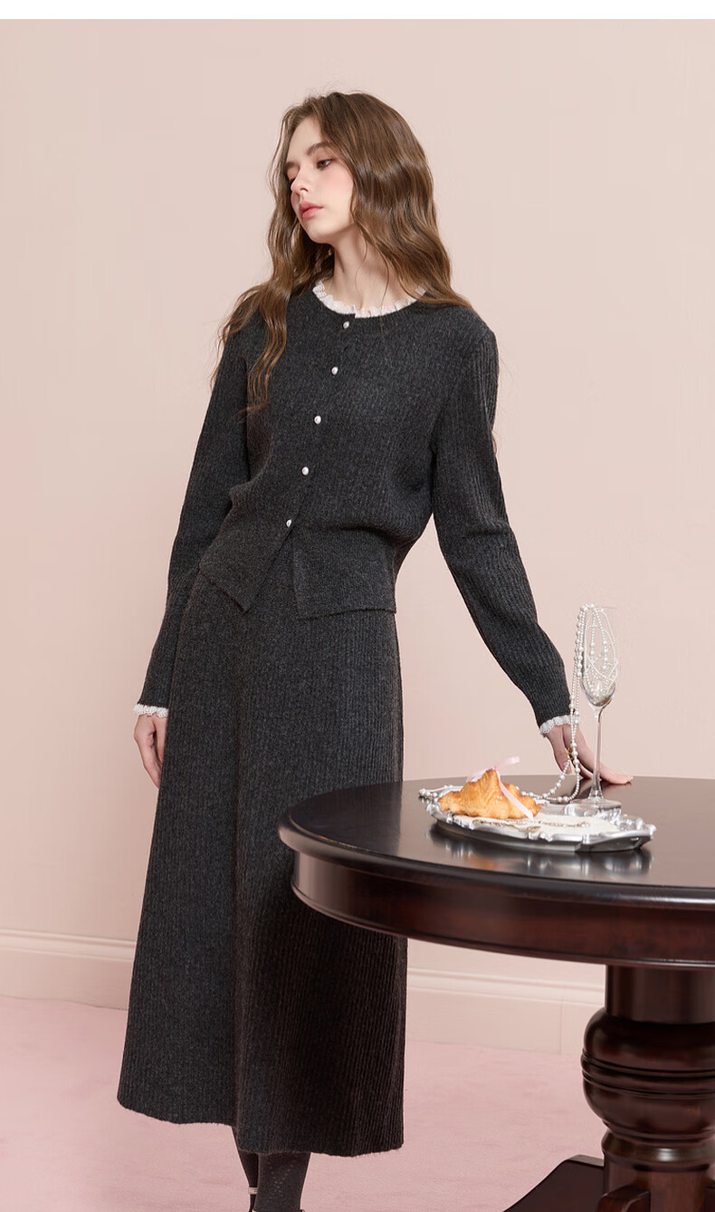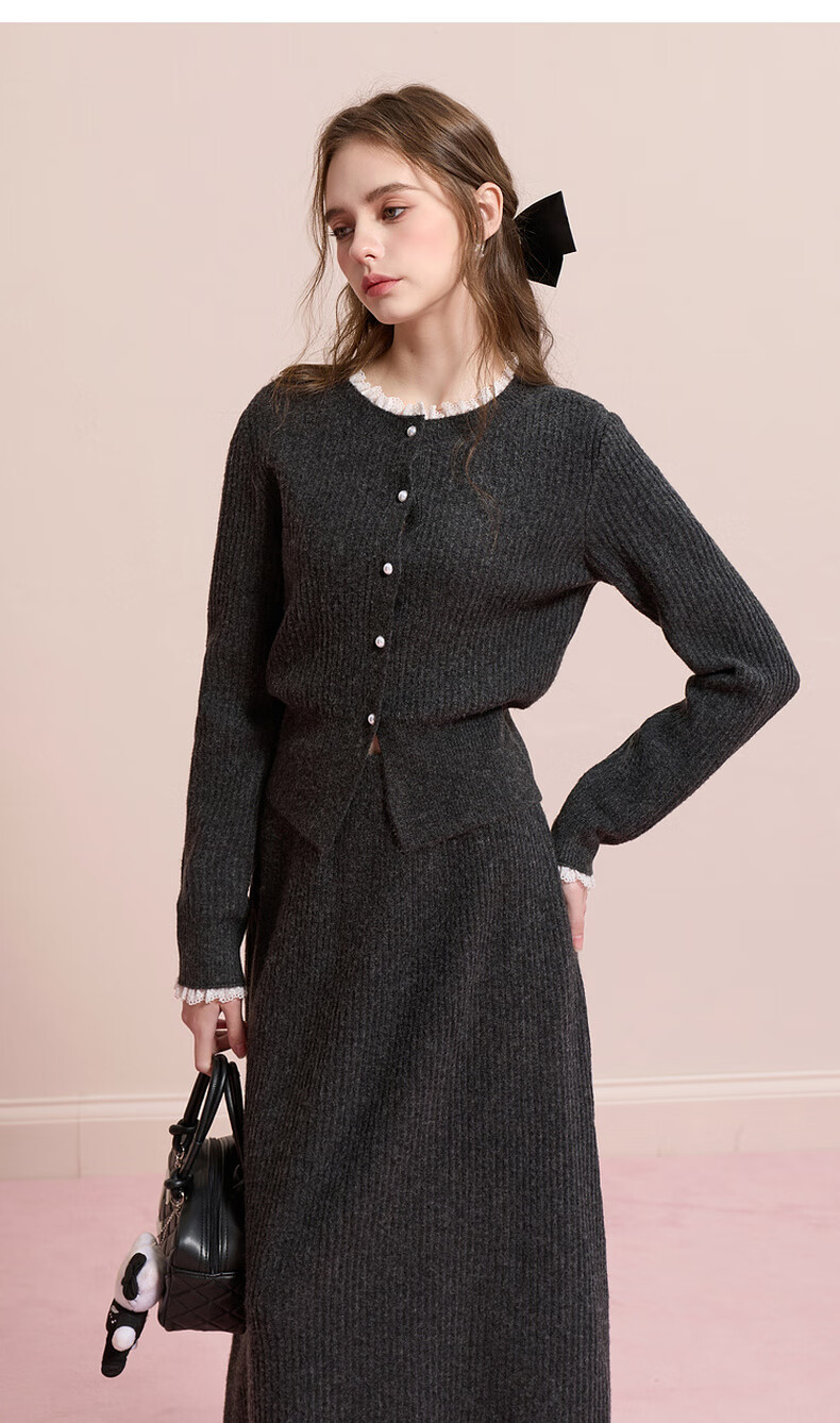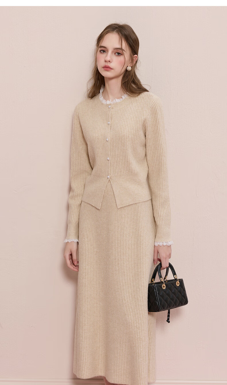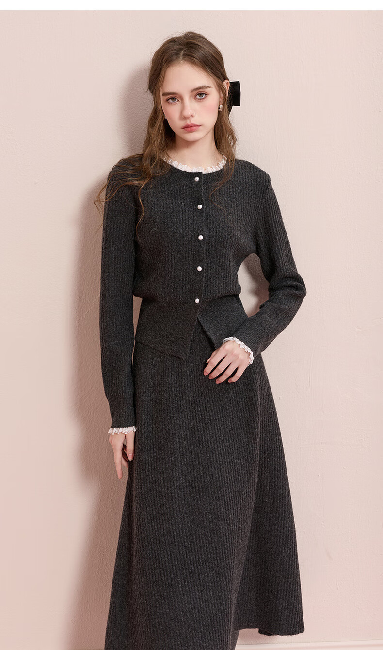 Sancai 2025 new winter knitted suit lace splicing wool sweater skirt two-piece set M