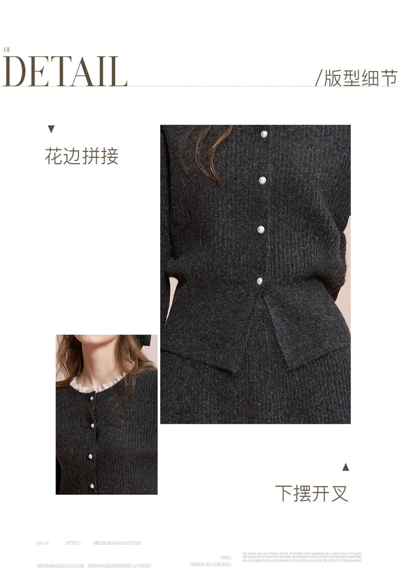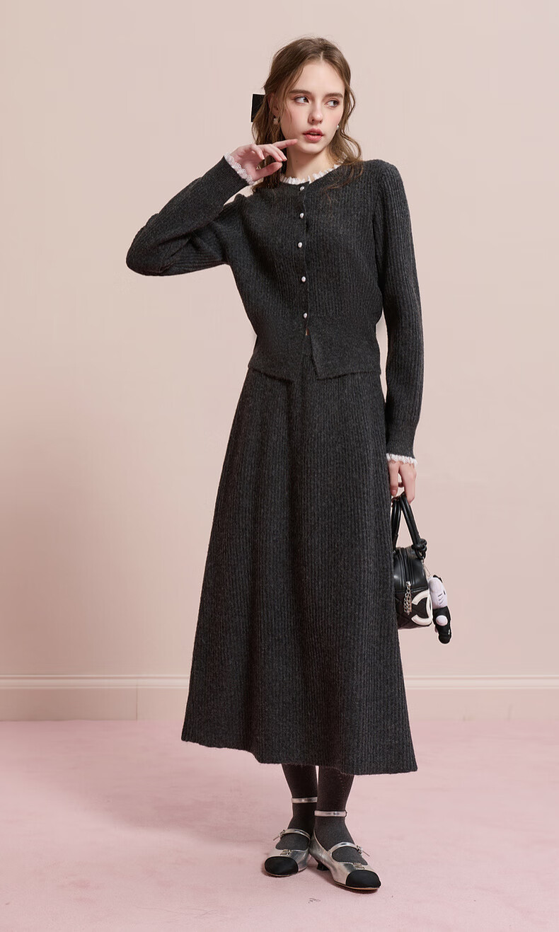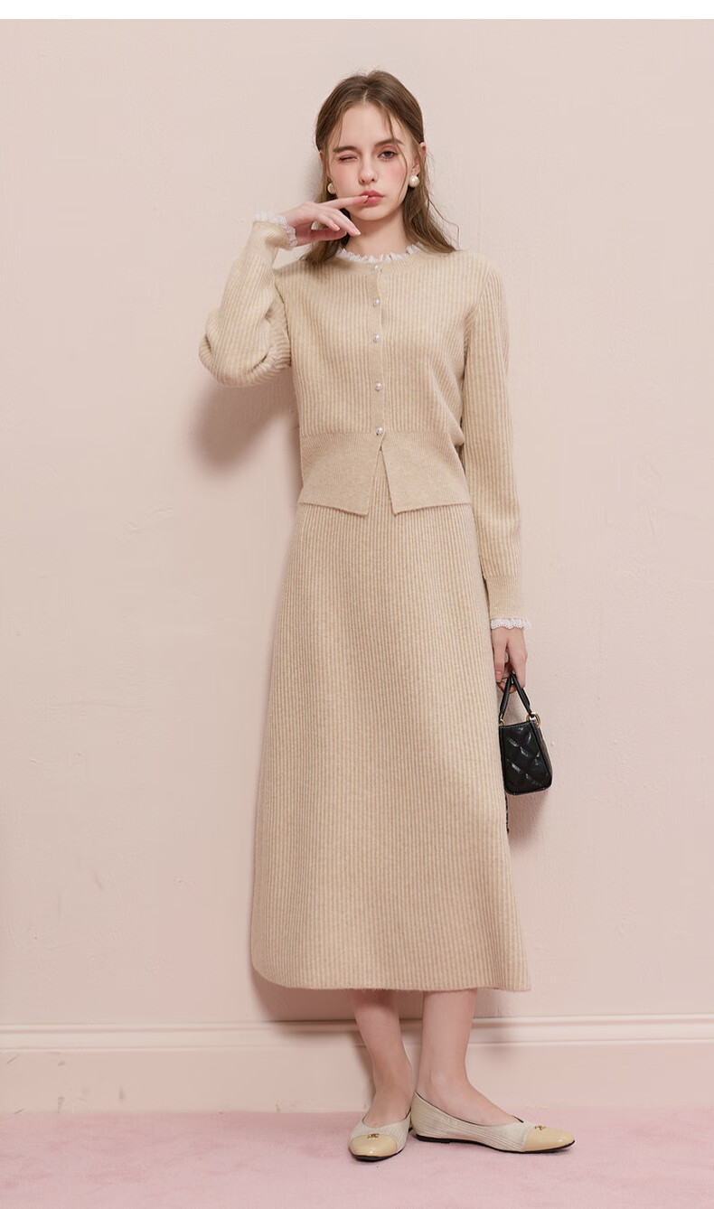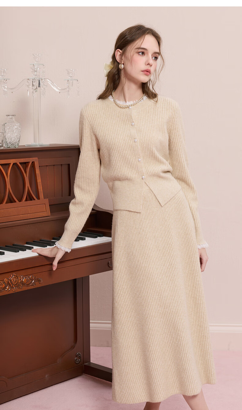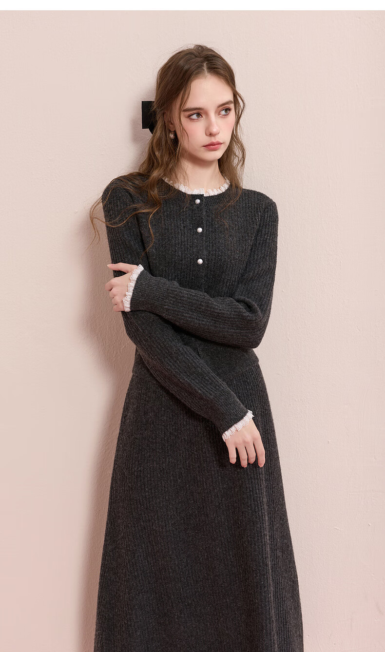 Sancai 2025 new winter knitted suit lace splicing wool sweater skirt two-piece set M