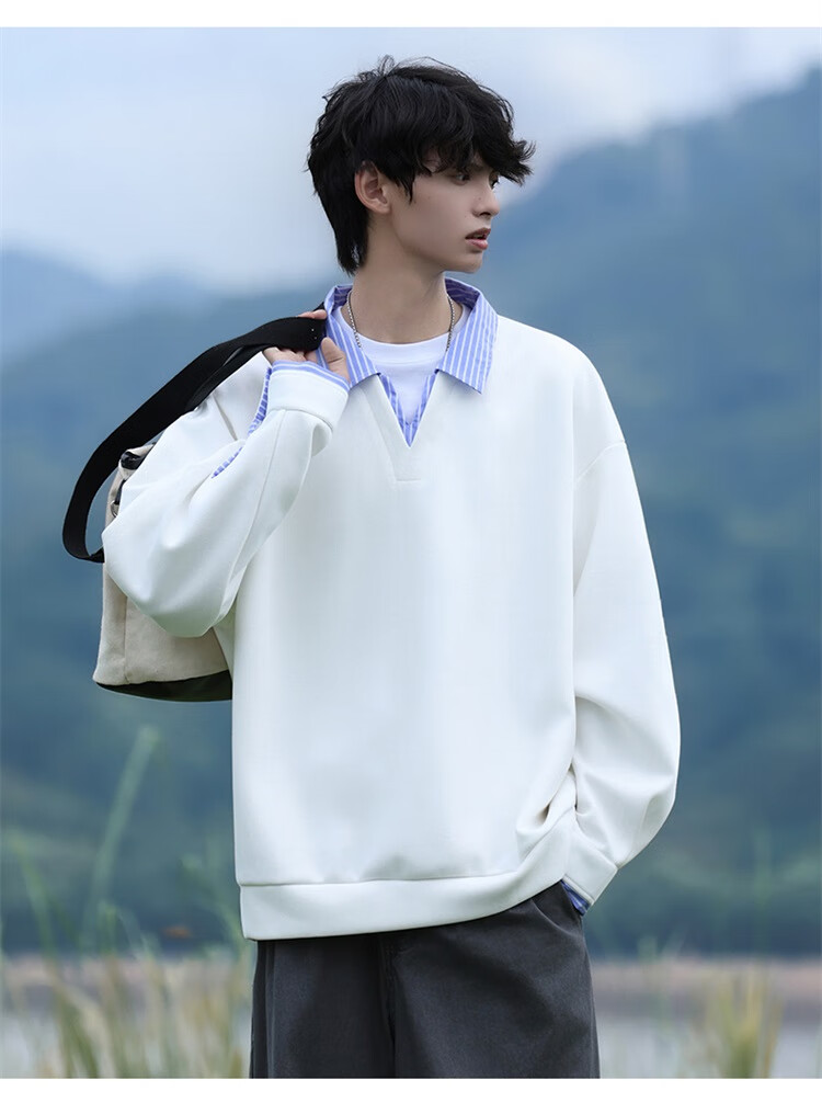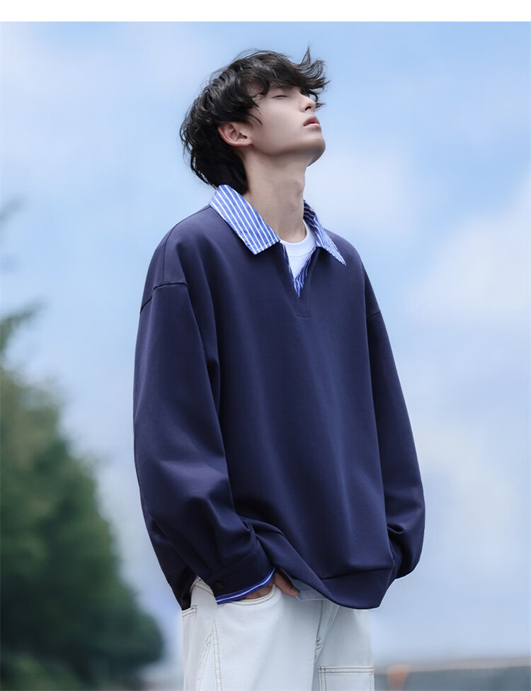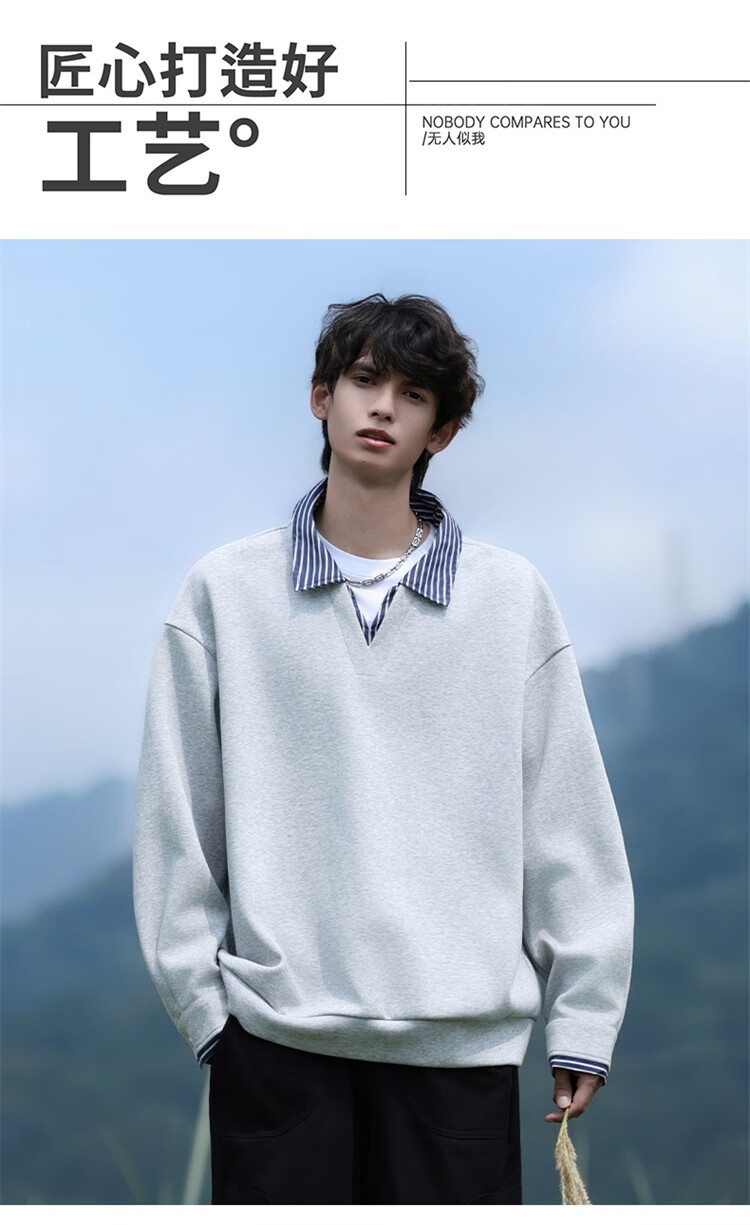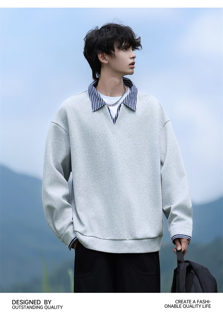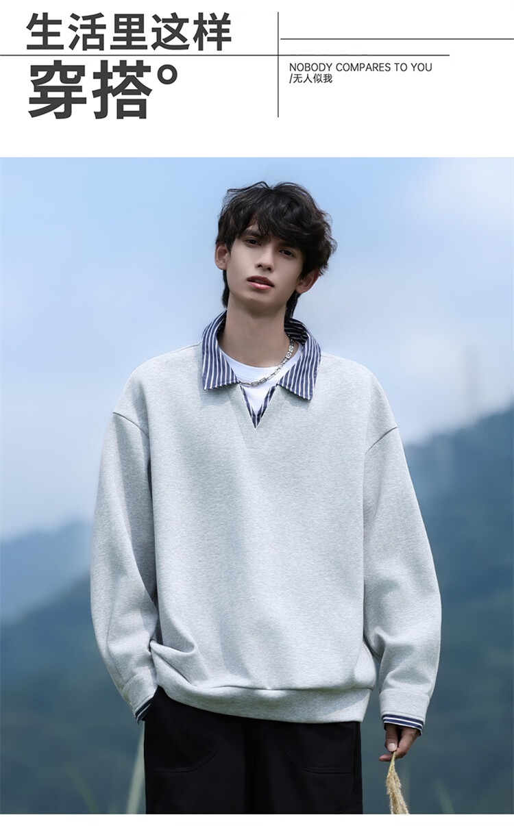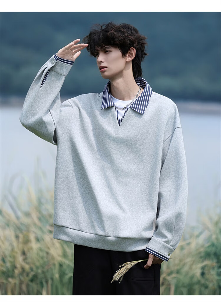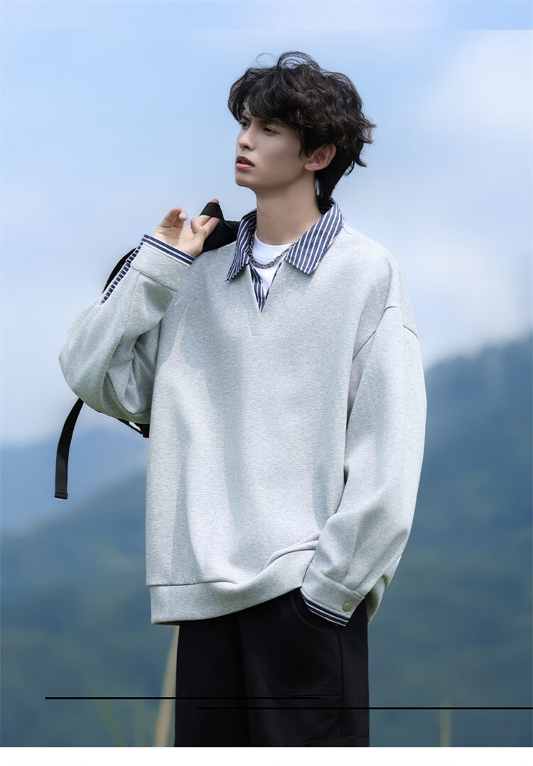 Homlean fake two-piece lapel sweatshirt autumn men's American trend versatile loose casual top HP02 hemp gray XL