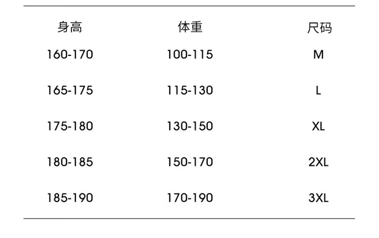 China (cm) 165 / 88-90 170 / 96-98 175 / 108-110 180 / 118-122 185 / 126-130