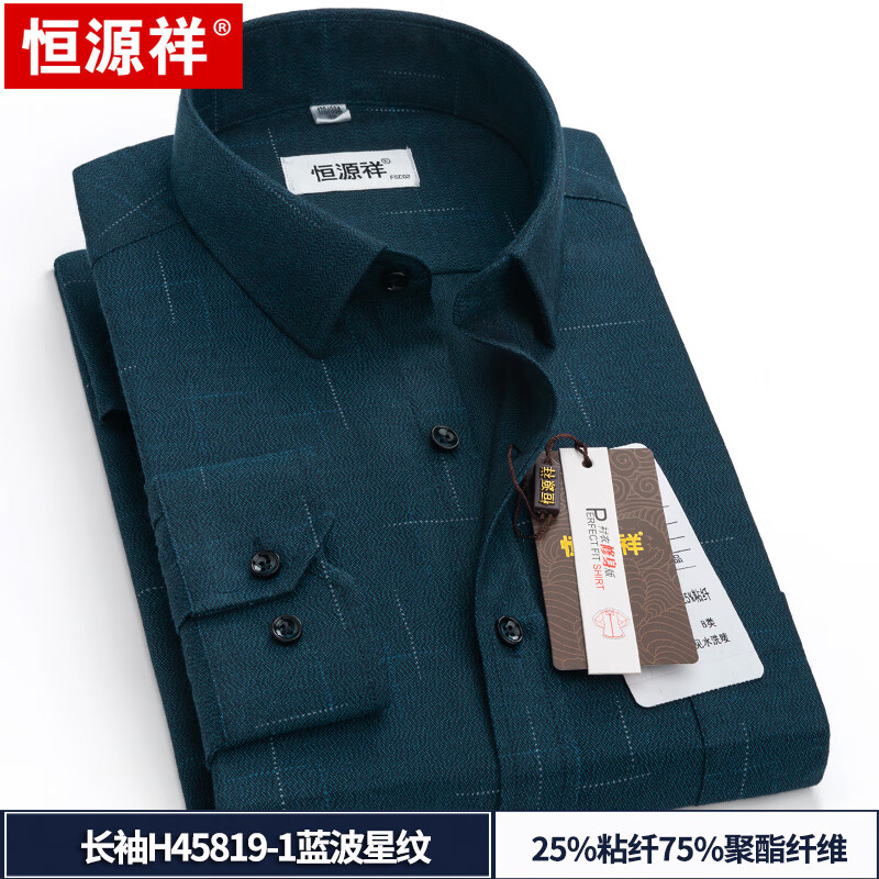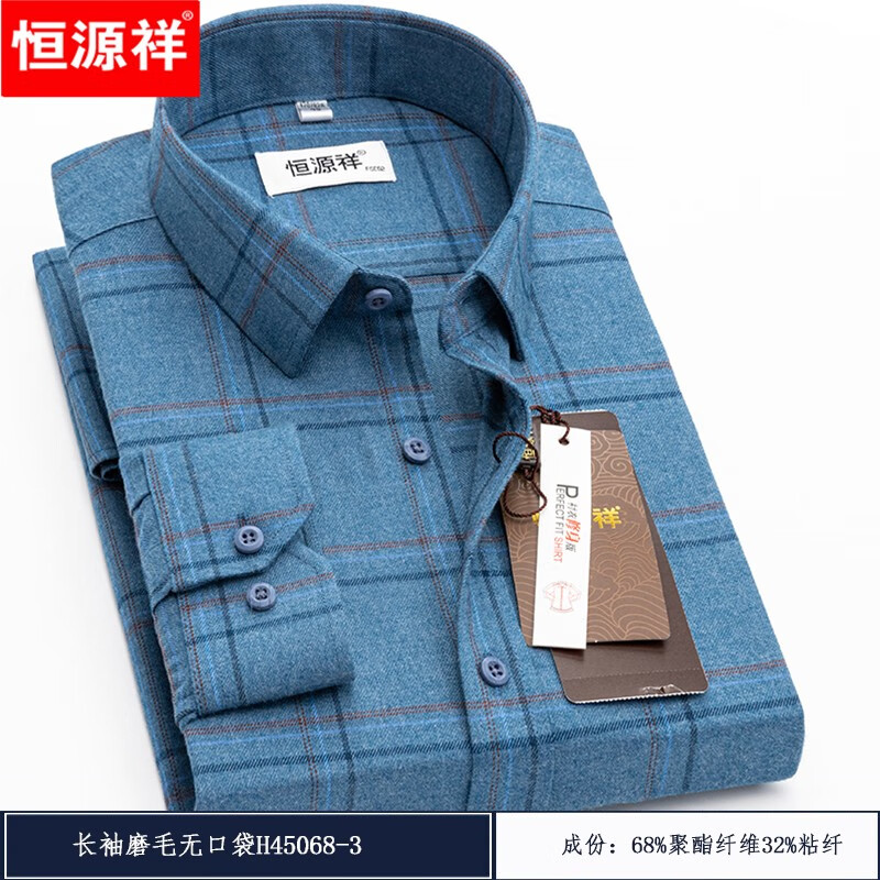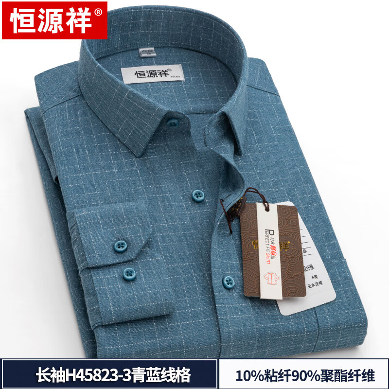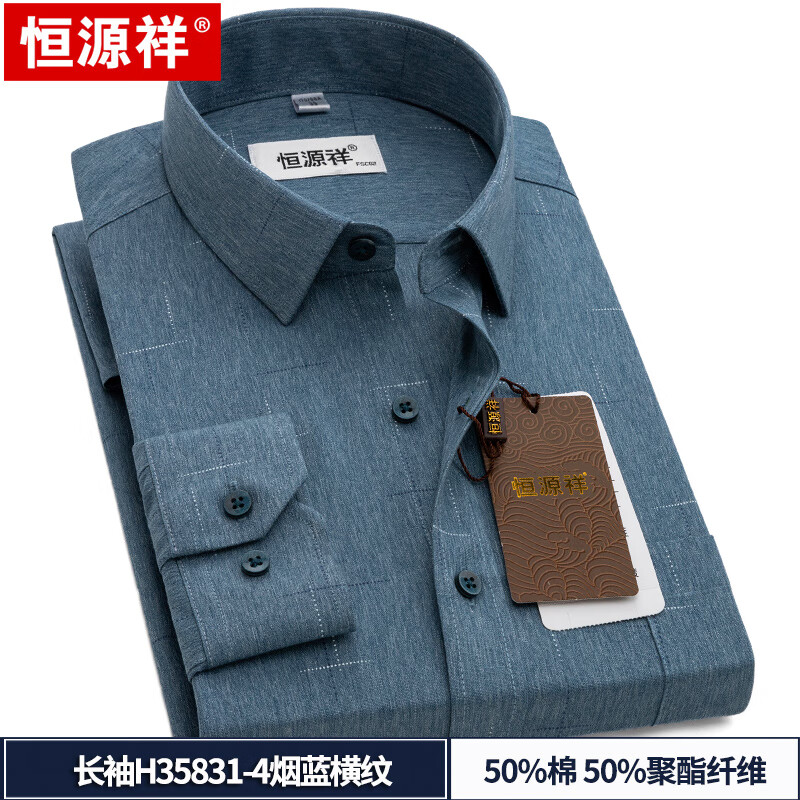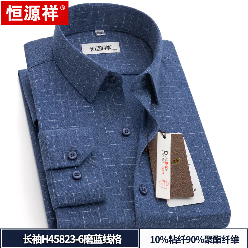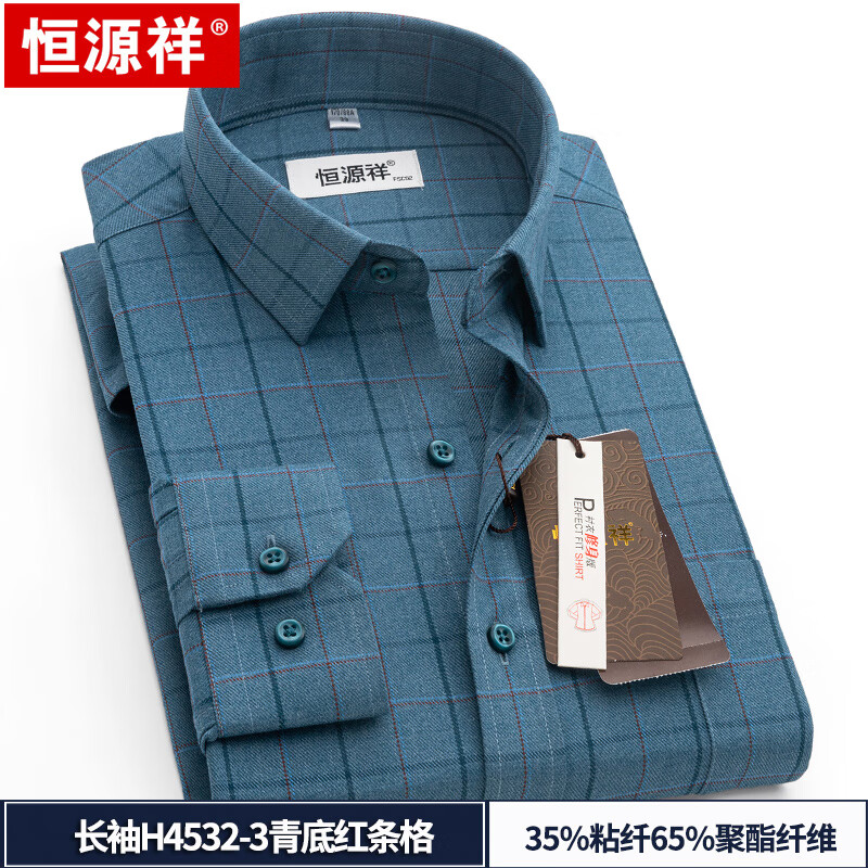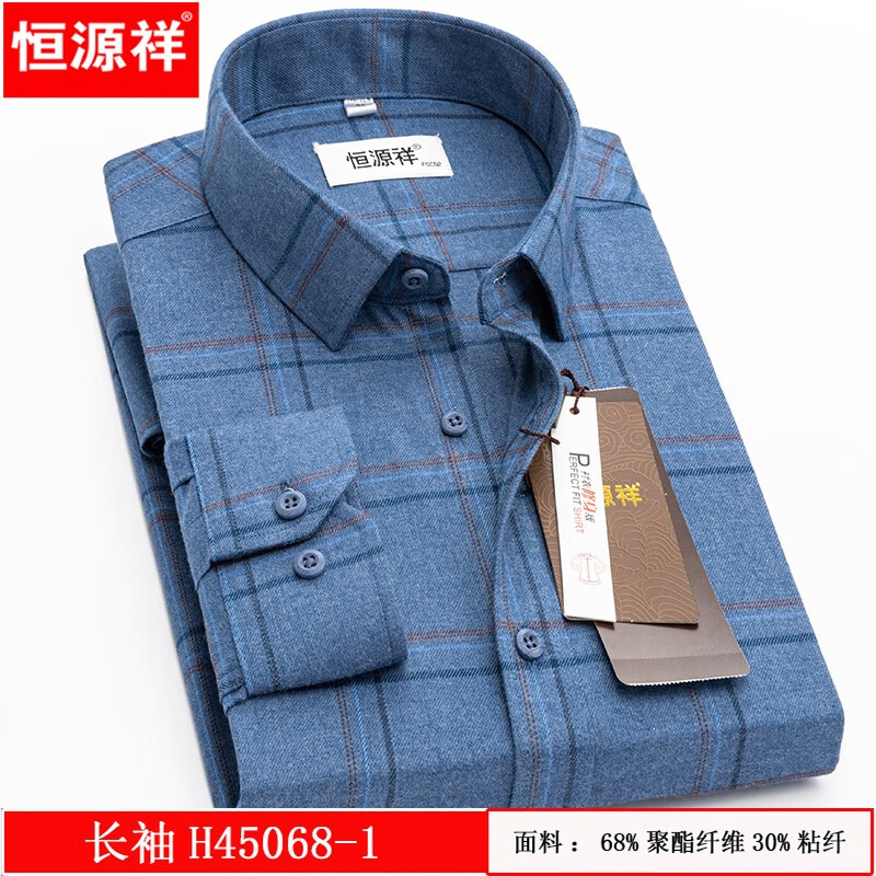 Hengyuanxiang no-iron long-sleeved shirt for men middle-aged casual square plaid men's slim-fit brushed shirt autumn style long-sleeved H4532-1 blue background with red stripes 38