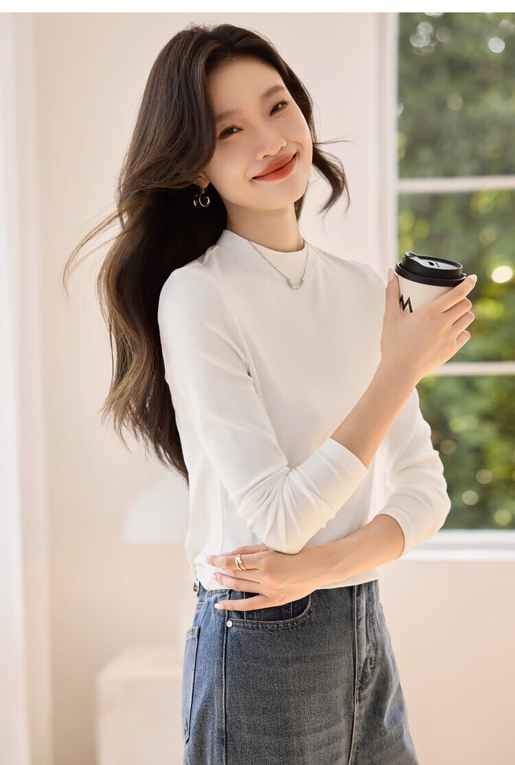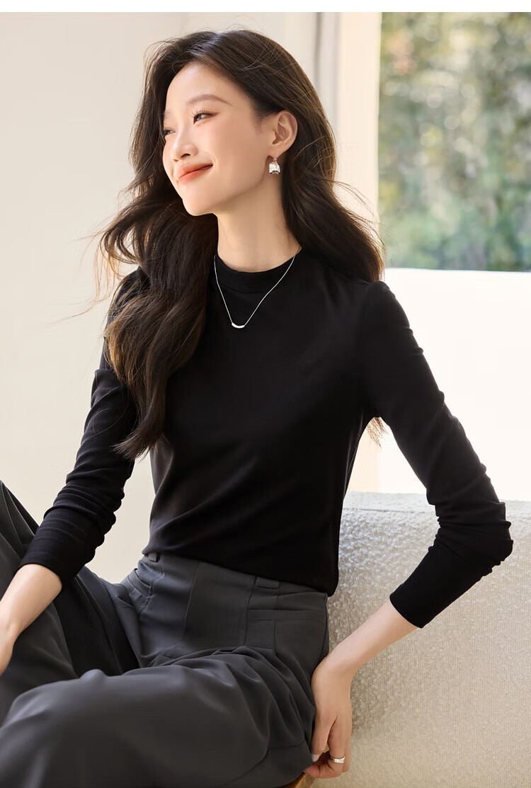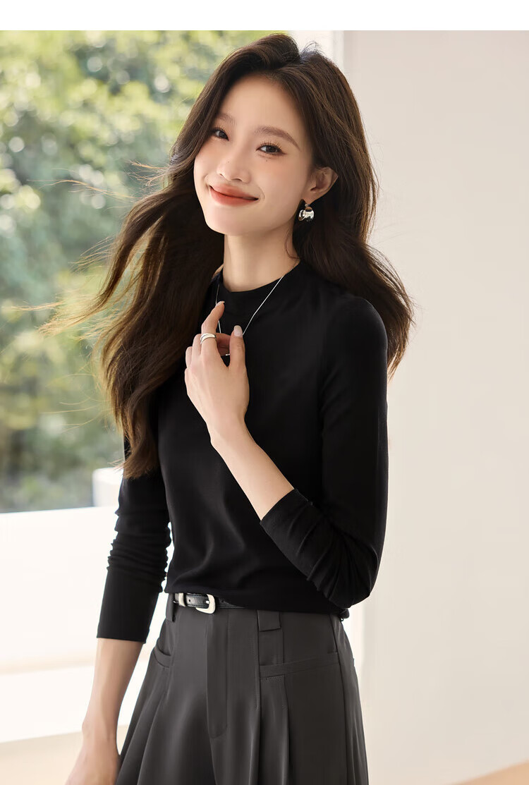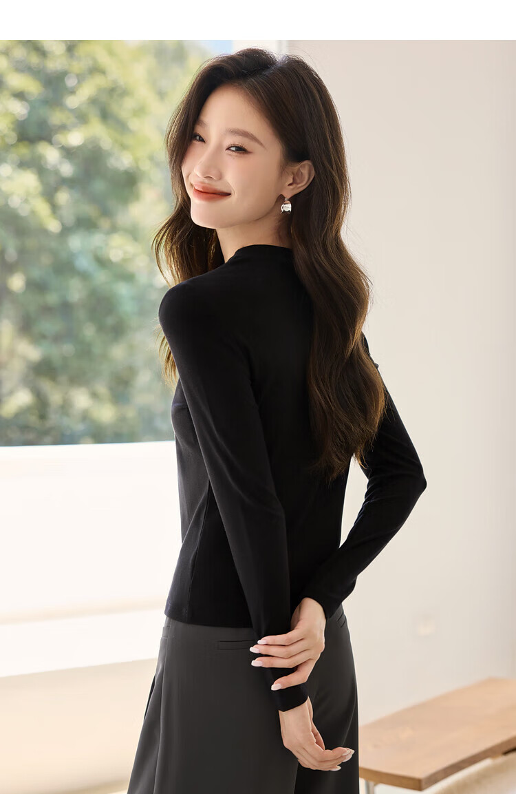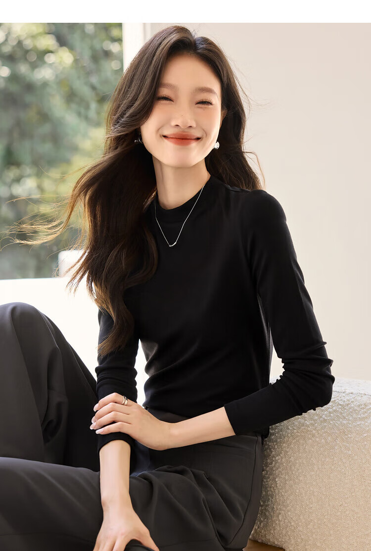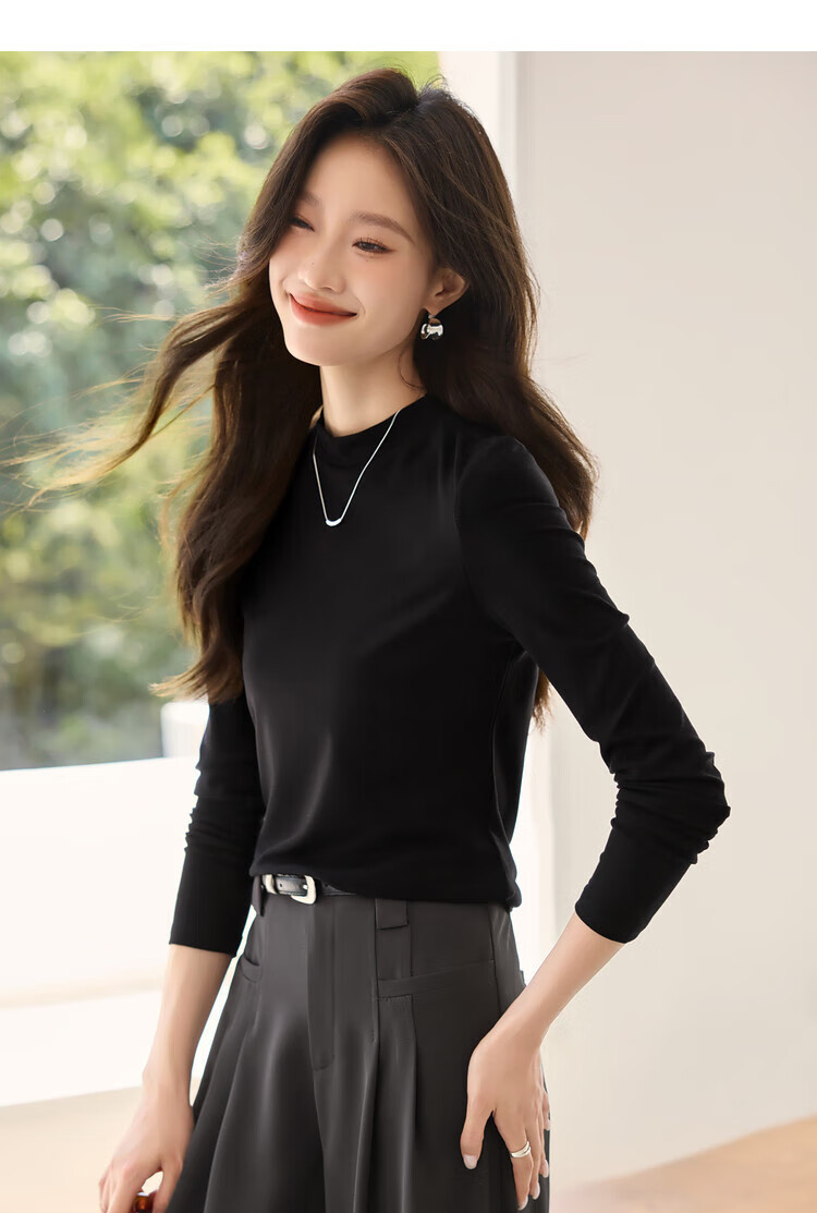 Woodpecker long-sleeved T-shirt for women in autumn pure cotton right shoulder slim fit versatile half turtleneck bottoming shirt top black XL