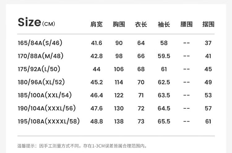 China (cm) 165 / 88-90 170 / 96-98 175 / 108-110 180 / 118-122 185 / 126-130