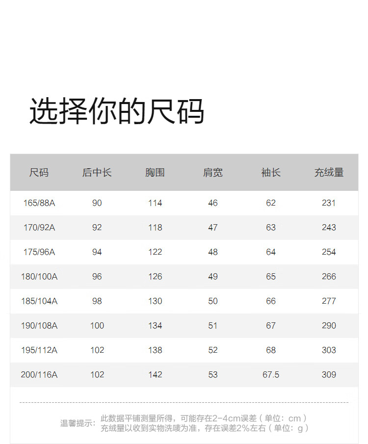 China (cm) 165 / 88-90 170 / 96-98 175 / 108-110 180 / 118-122 185 / 126-130