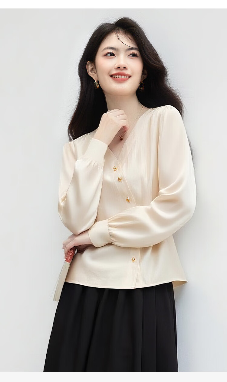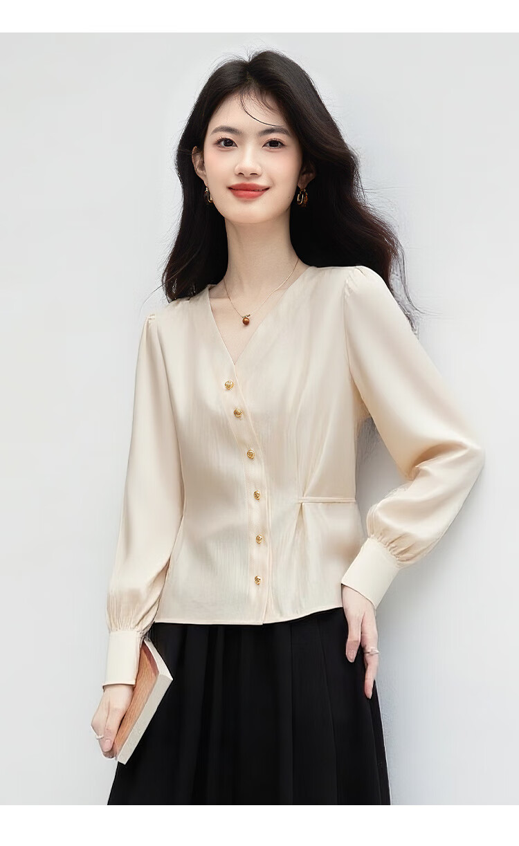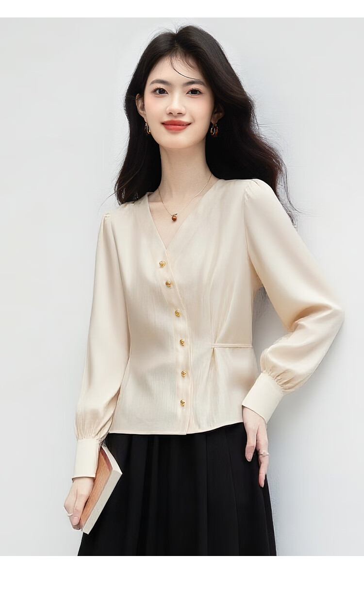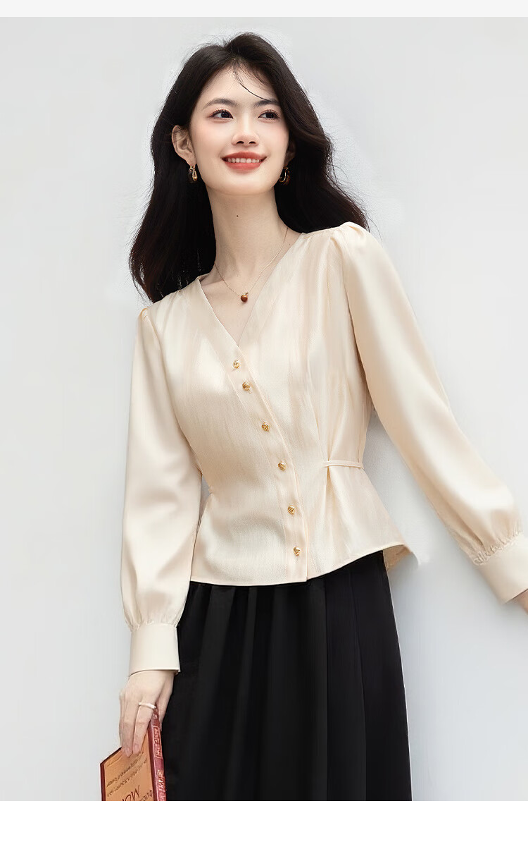 Xinfeiyu French style small fragrant style long-sleeved shirt for women 2025 autumn new V-neck metal embellished straight splicing top