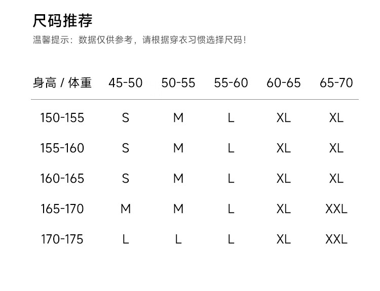 China (cm) 160-165/84-86 165-170 / 88-90 167-172 / 92-96 168-173 / 98-102 170-176 / 106-110