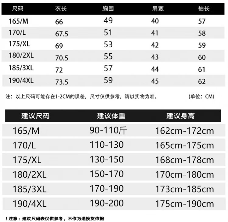 China (cm) 165 / 88-90 170 / 96-98 175 / 108-110 180 / 118-122 185 / 126-130