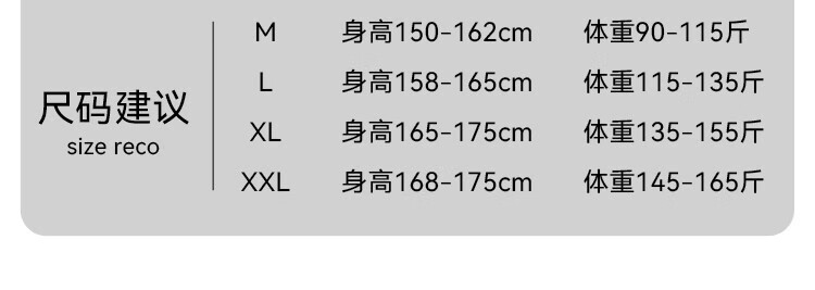 China (cm) 160-165/84-86 165-170 / 88-90 167-172 / 92-96 168-173 / 98-102 170-176 / 106-110