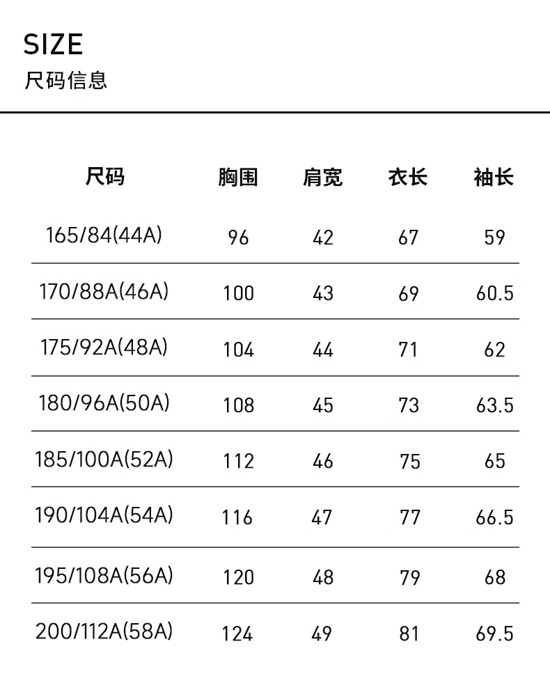 China (cm) 160-165/84-86 165-170 / 88-90 167-172 / 92-96 168-173 / 98-102 170-176 / 106-110