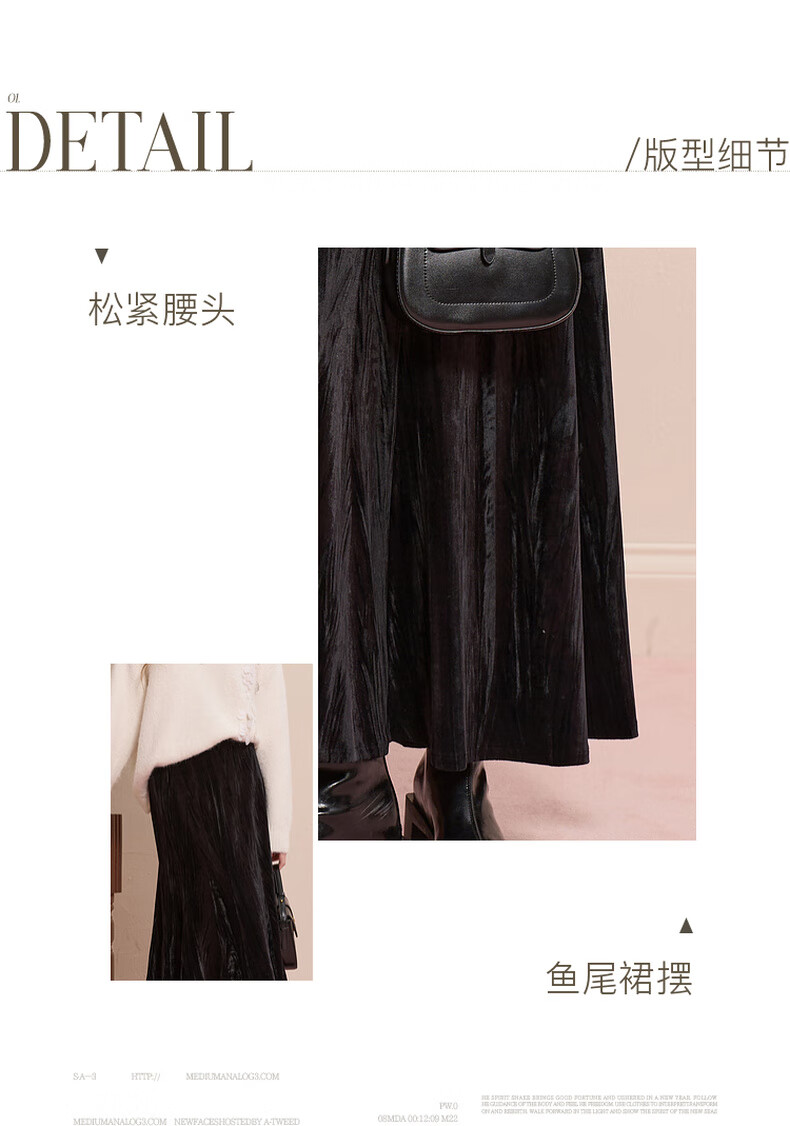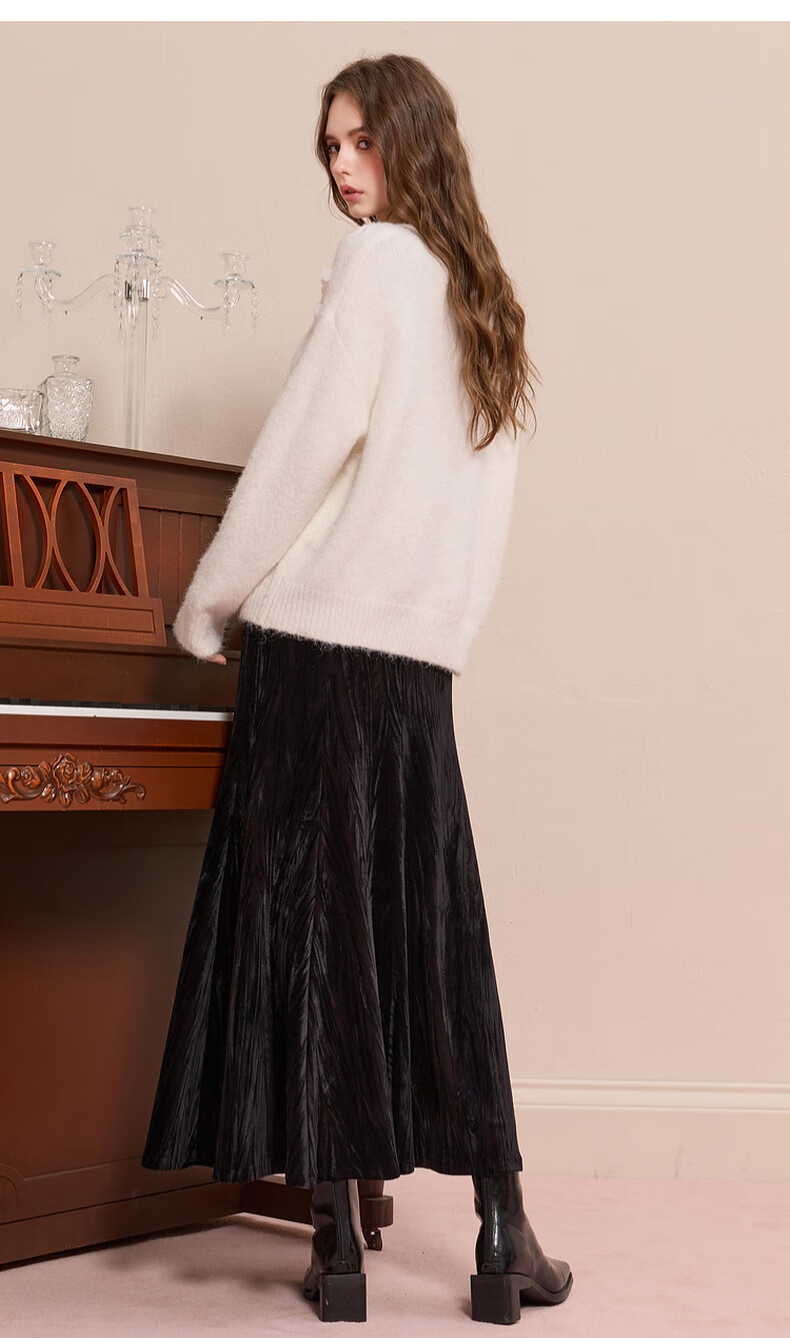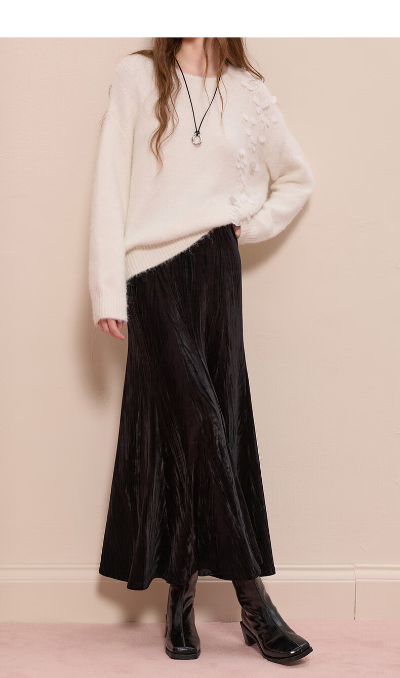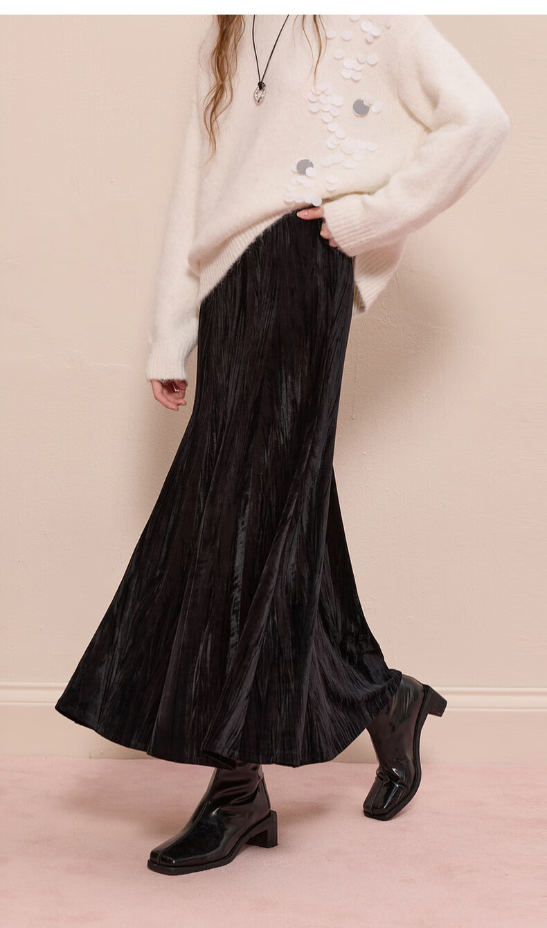 Sancai 2025 winter new velvet skirt elastic waist A-line skirt long skirt elegant temperament M