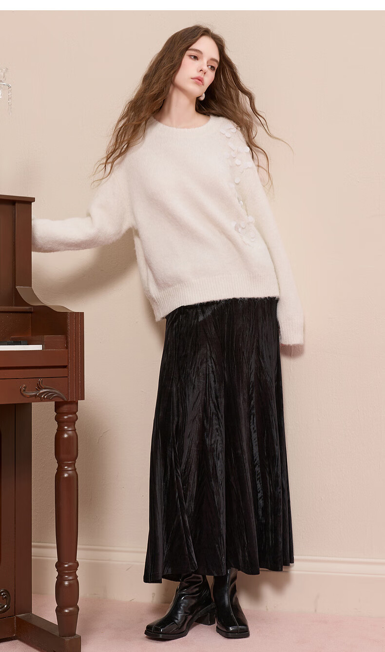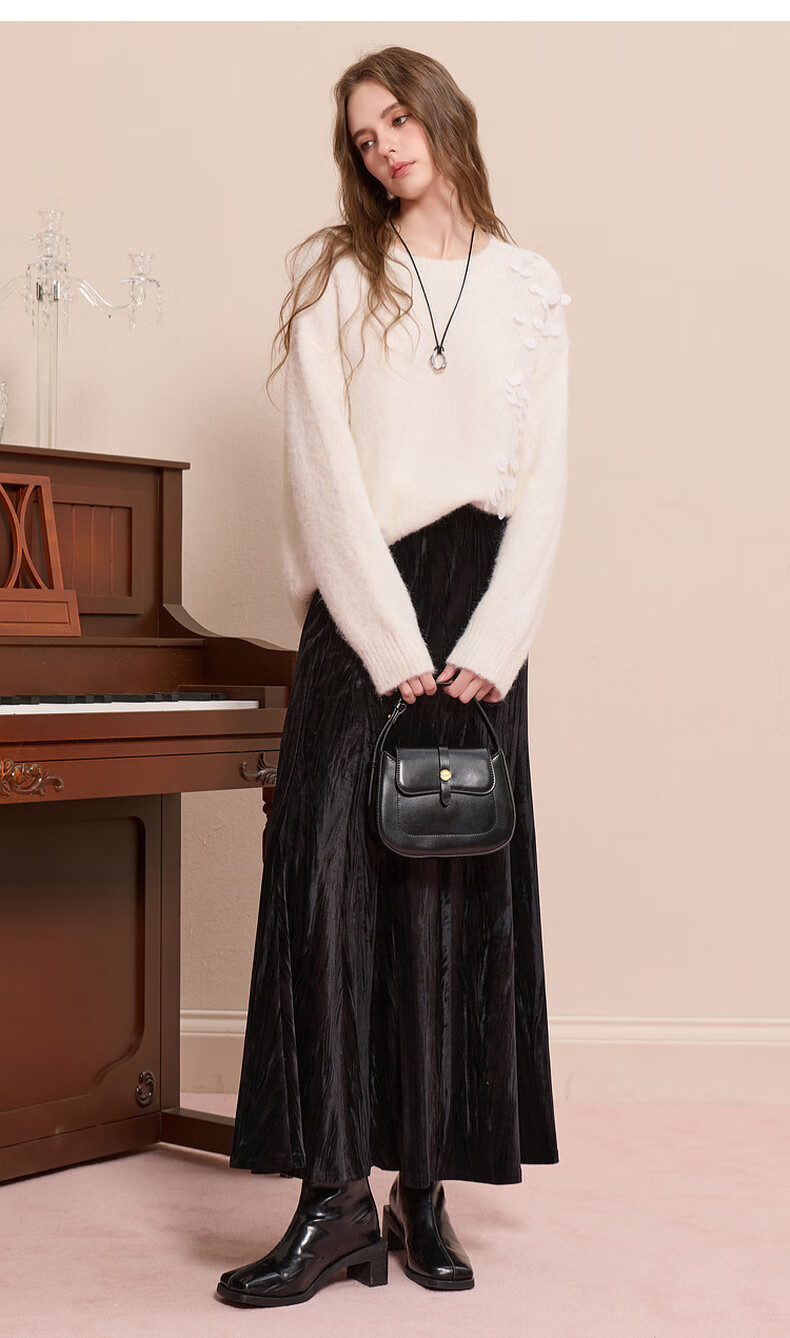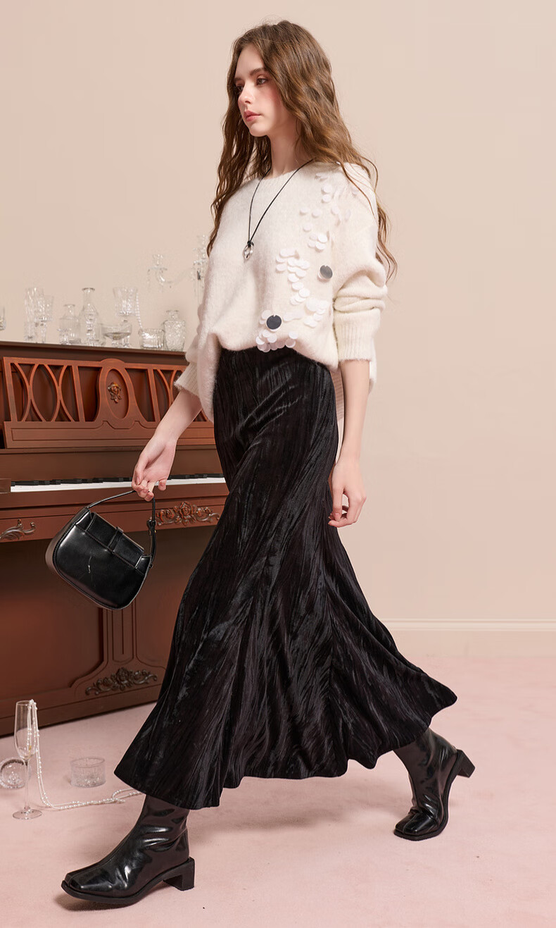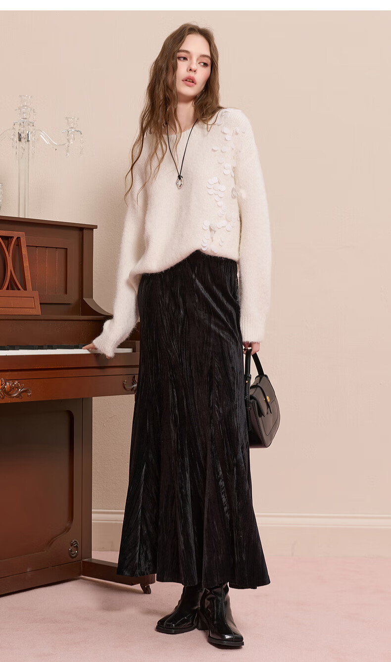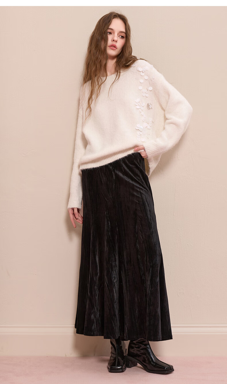 Sancai 2025 winter new velvet skirt elastic waist A-line skirt long skirt elegant temperament M