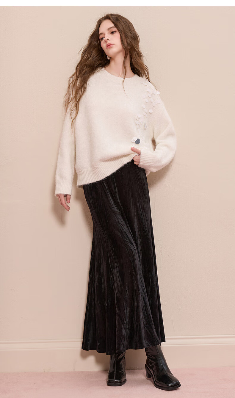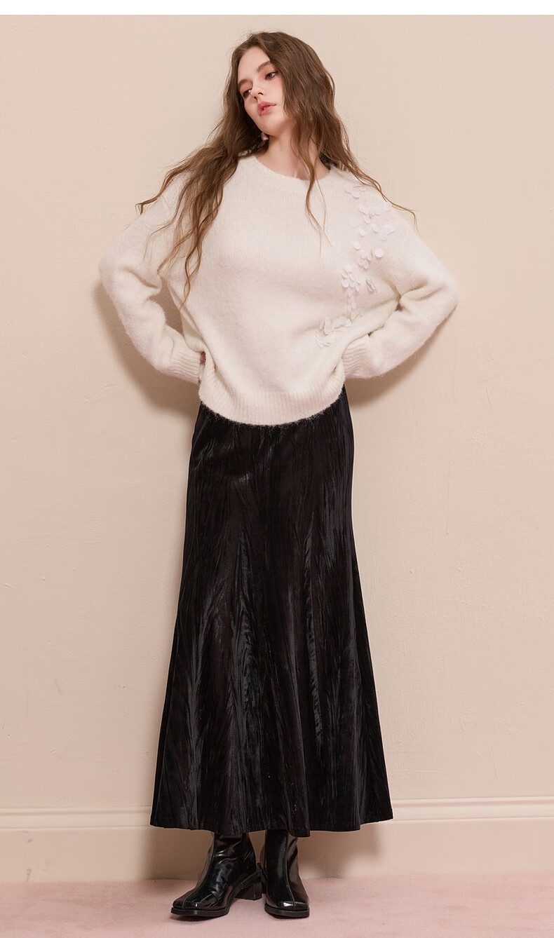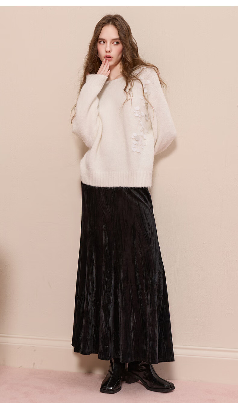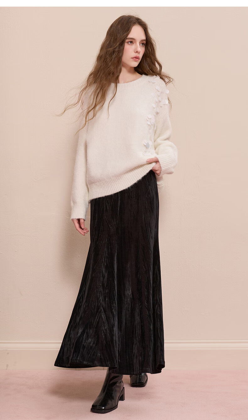 Sancai 2025 winter new velvet skirt elastic waist A-line skirt long skirt elegant temperament M