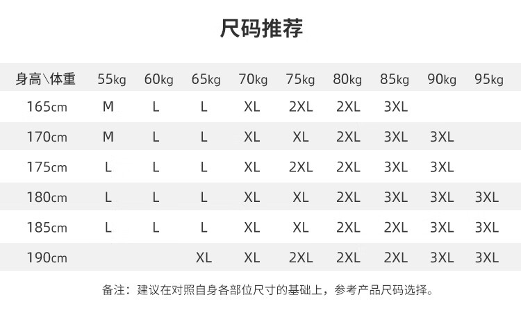 China (cm) 165 / 88-90 170 / 96-98 175 / 108-110 180 / 118-122 185 / 126-130