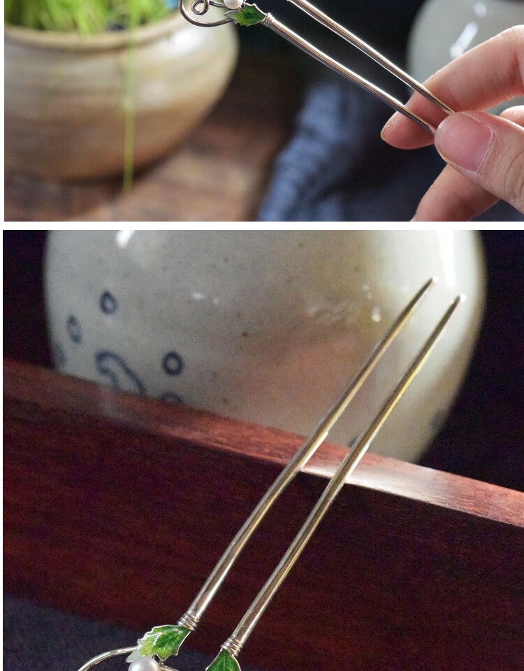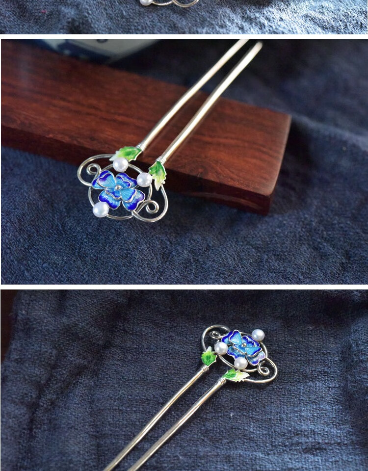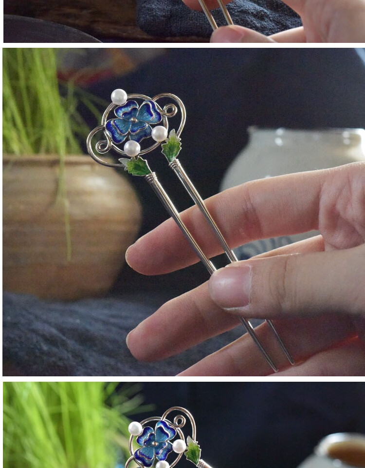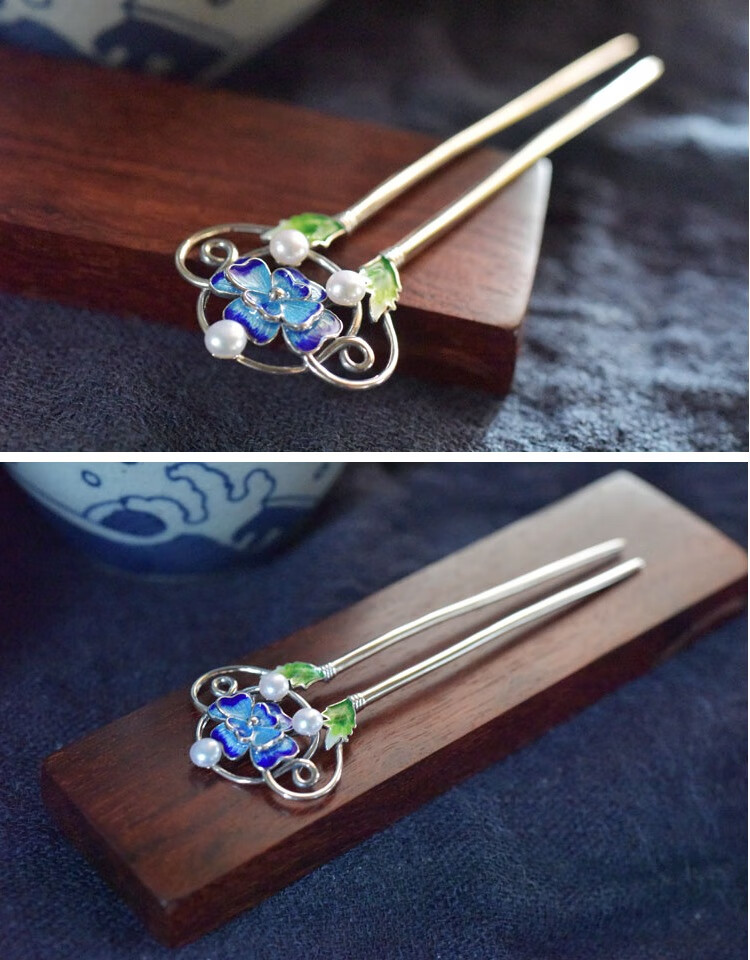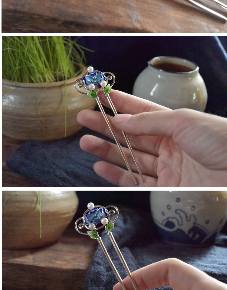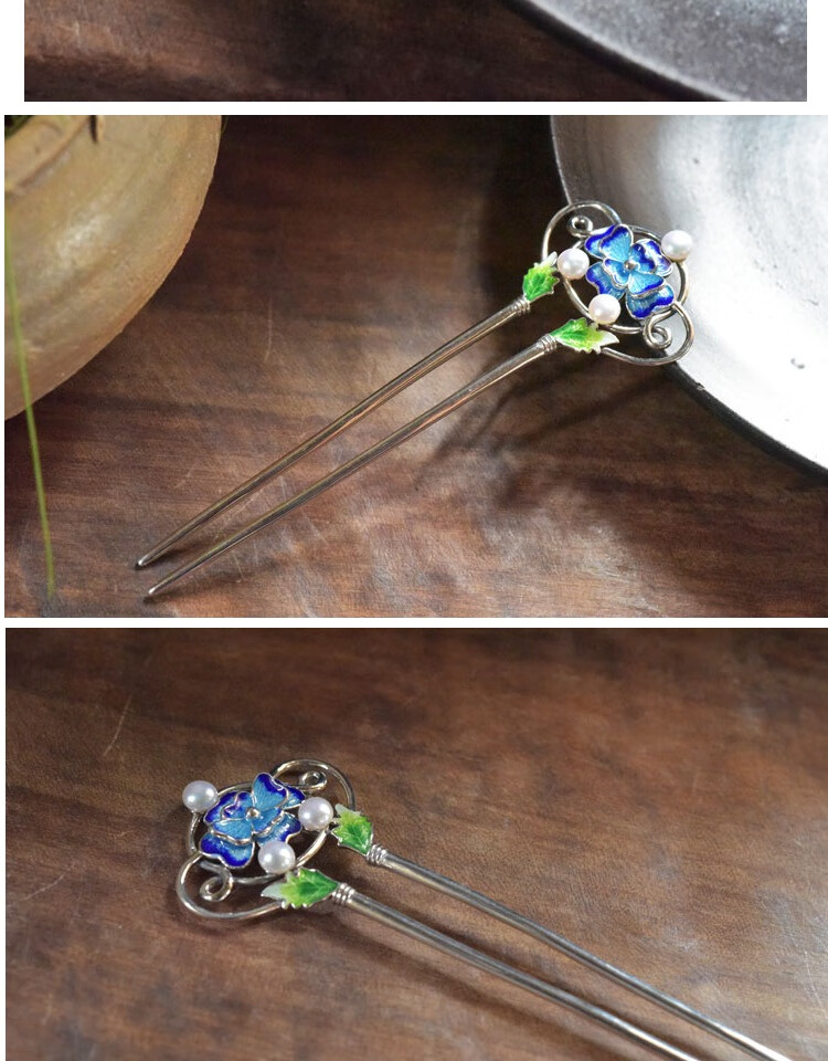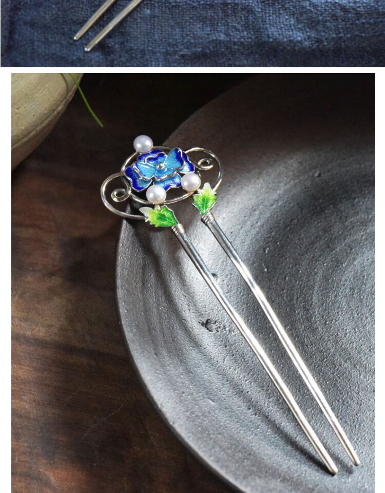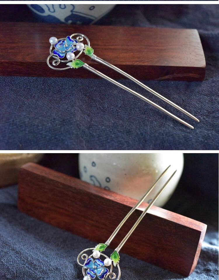 Meng Junchen S925 silver hairpin burned blue pearl retro antique style hairpin U-shaped short Hanfu palace headwear Chinese style