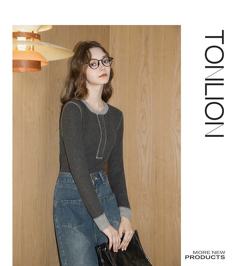 TonLion 2025 Autumn Women's Half-Braid Contrast Color Splicing Knitted Bottoming Shirt