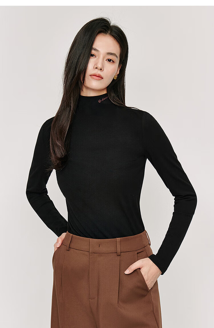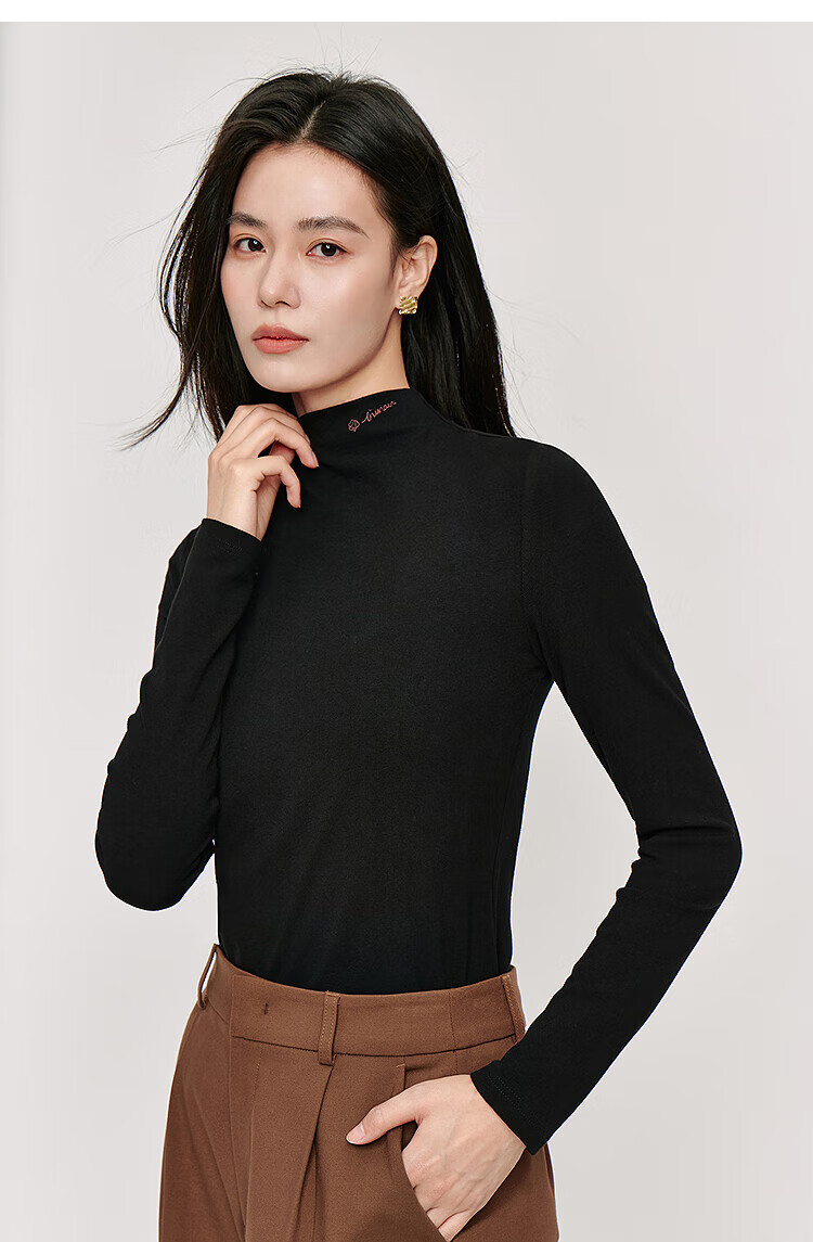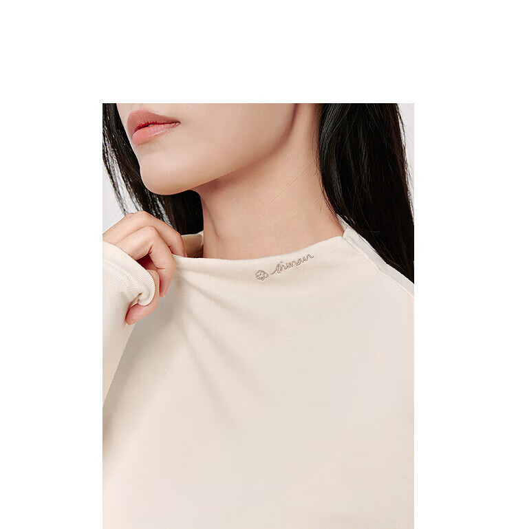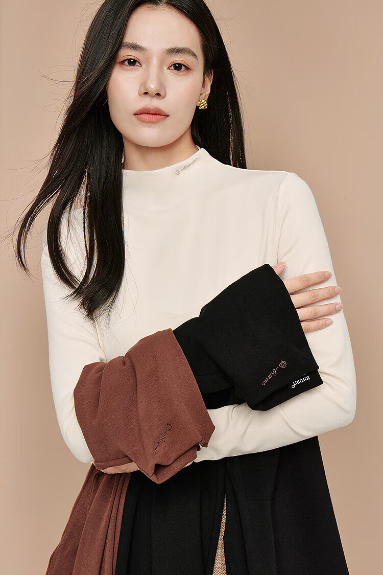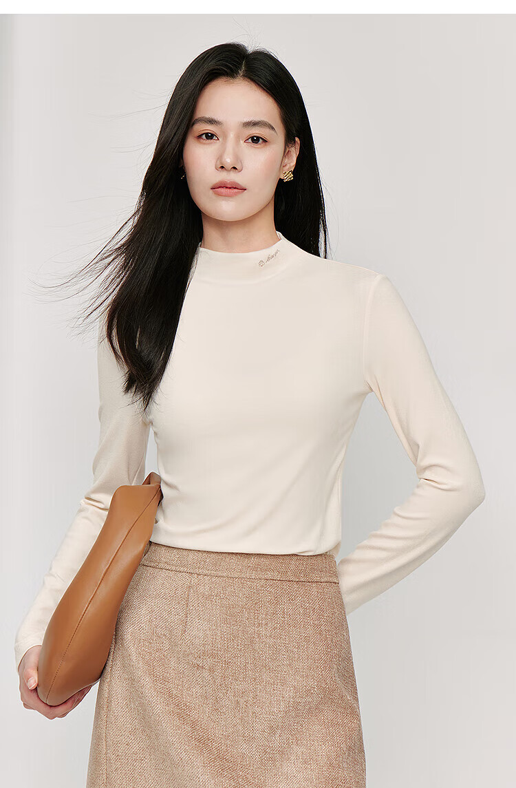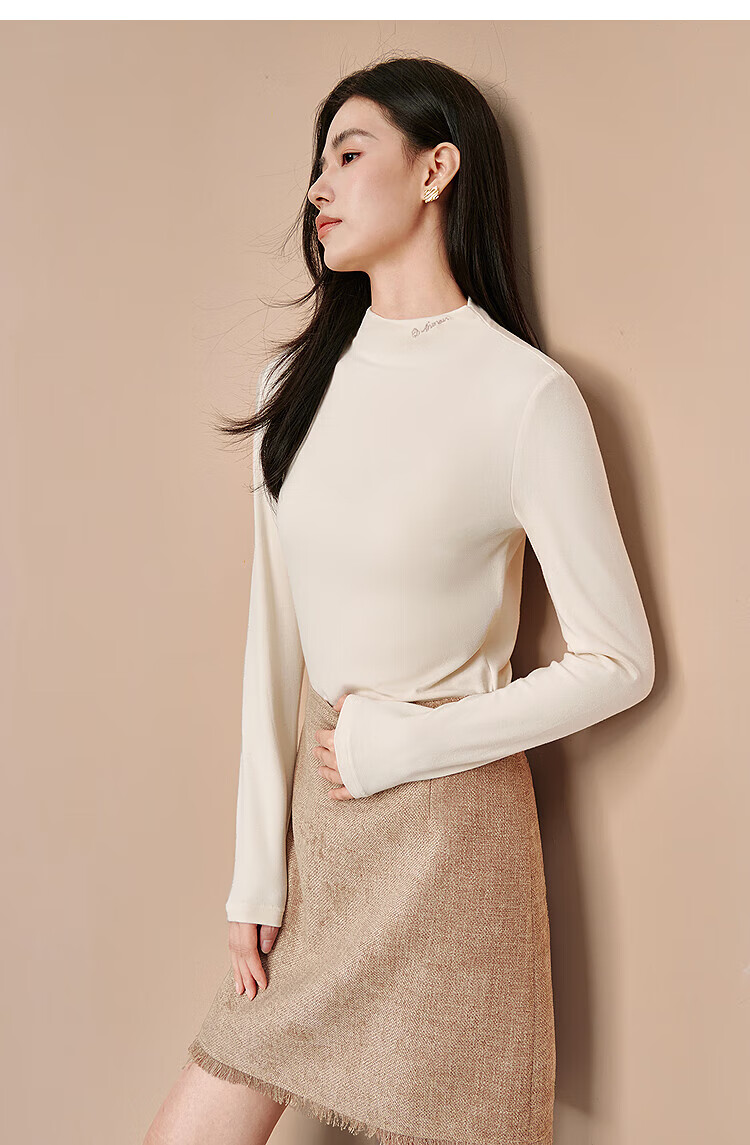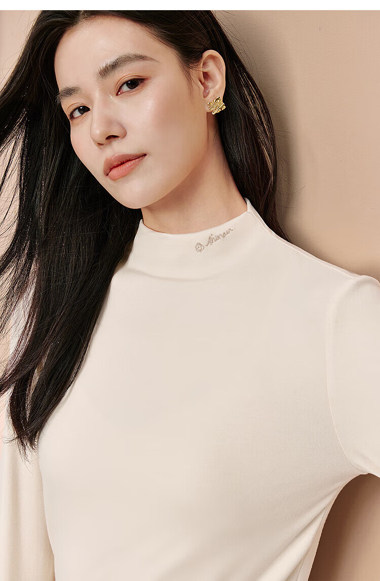 Inman Hyaluronic Acid Skin Beauty T-shirt Autumn Women's Half Turtle Collar Embroidered Slim Fit Bottoming Long Sleeve Top Beige - L