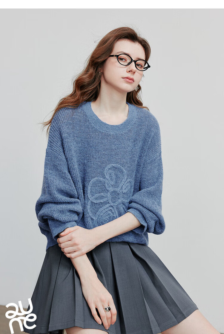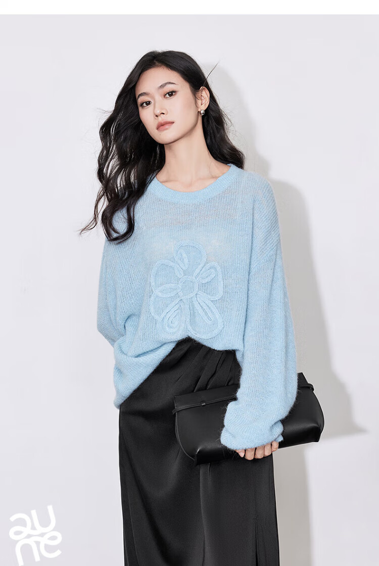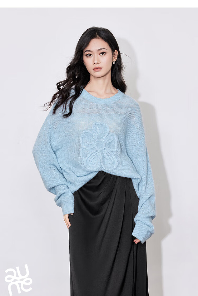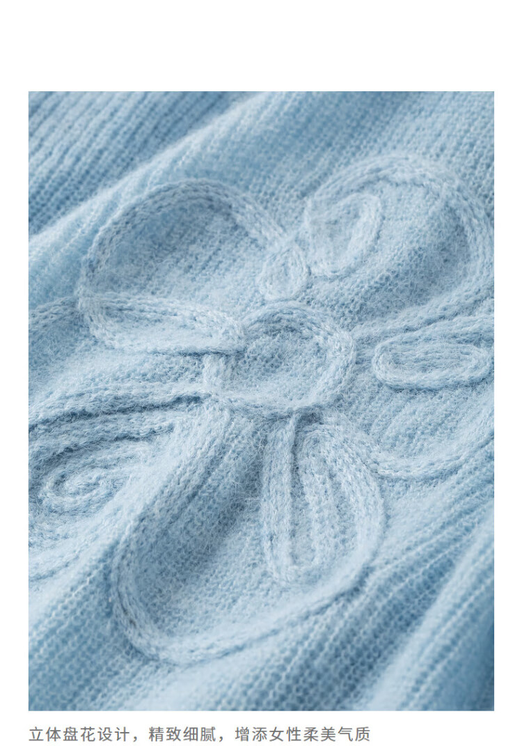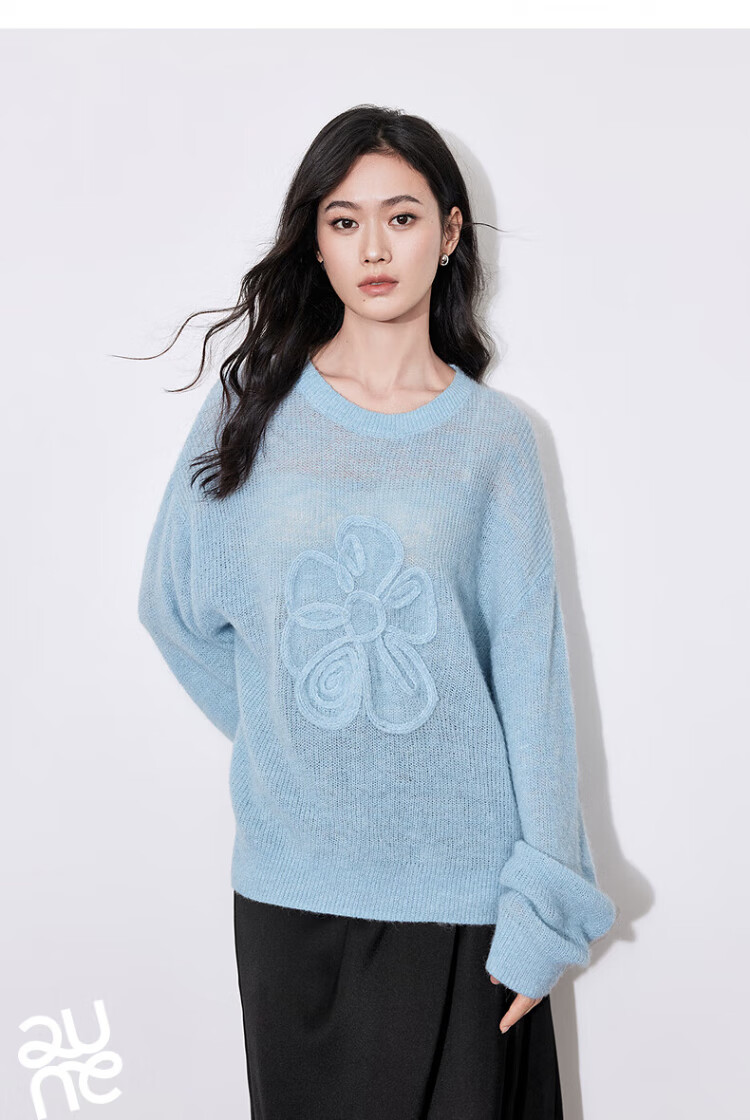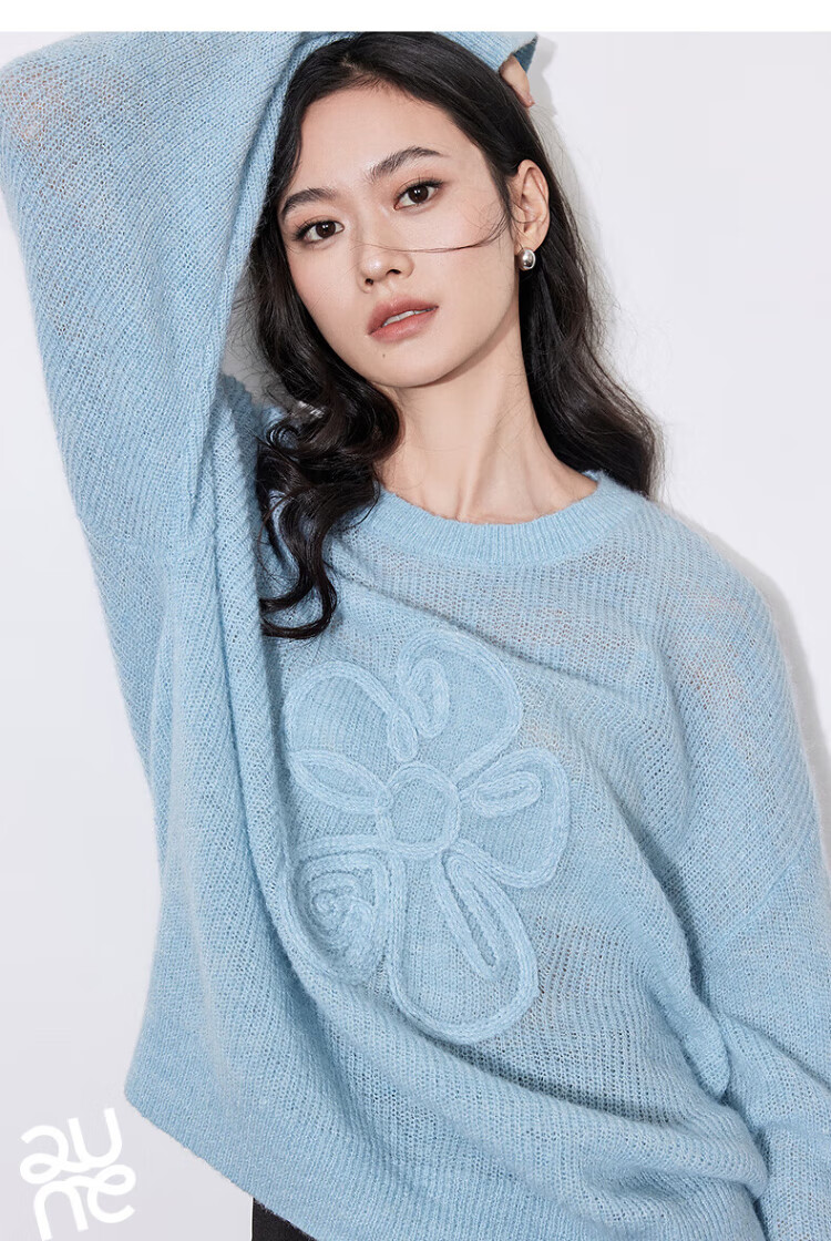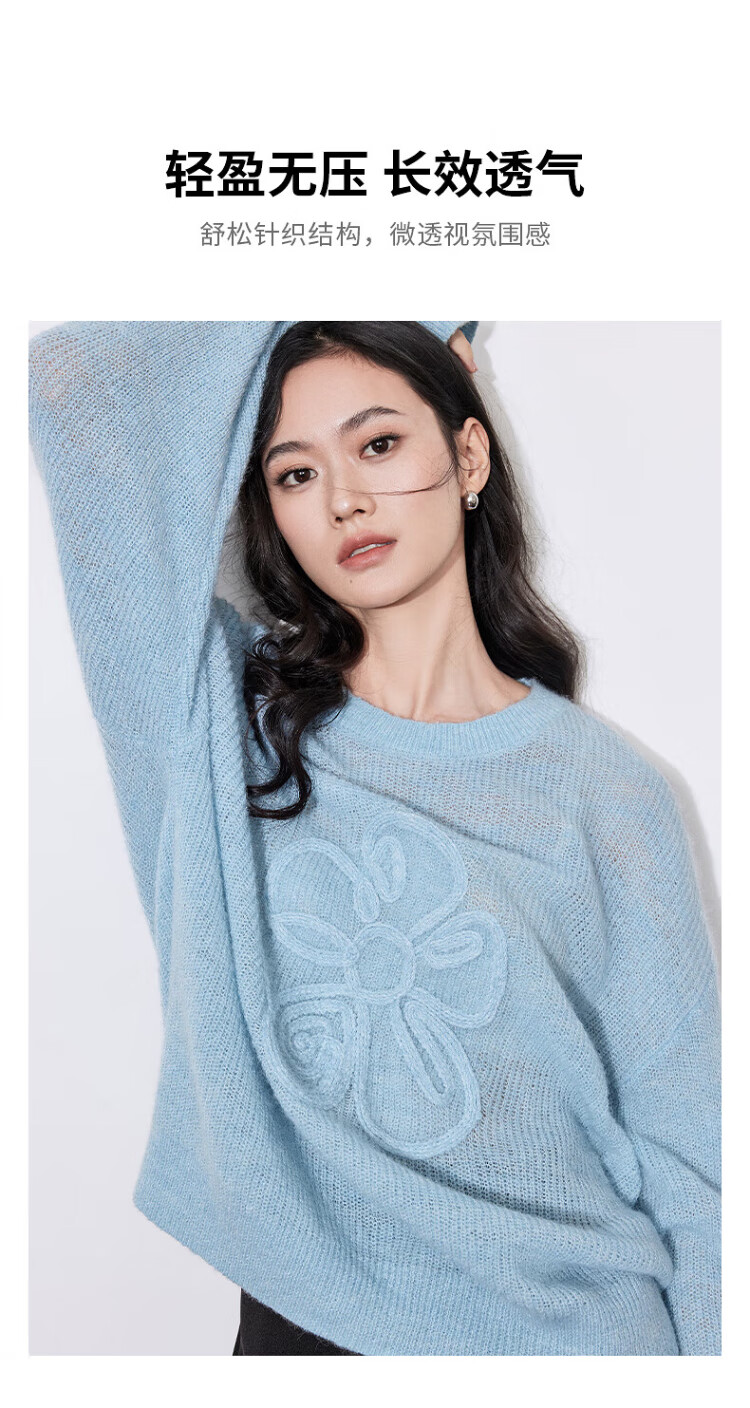 Chuyu three-dimensional floral knitted sweater for women 2025 autumn and winter new style dopamine mohair lazy top haze blue M