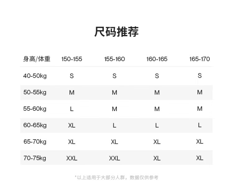 China (cm) 160-165/84-86 165-170 / 88-90 167-172 / 92-96 168-173 / 98-102 170-176 / 106-110